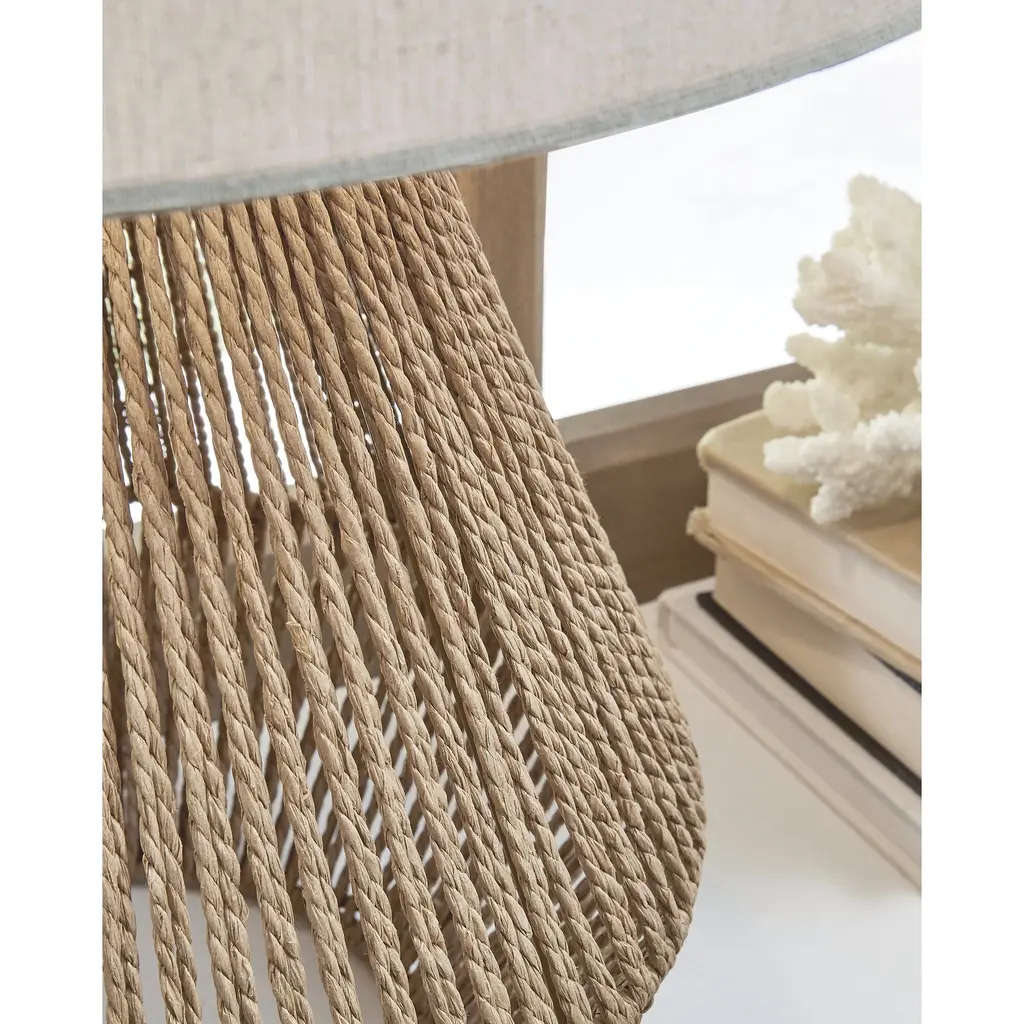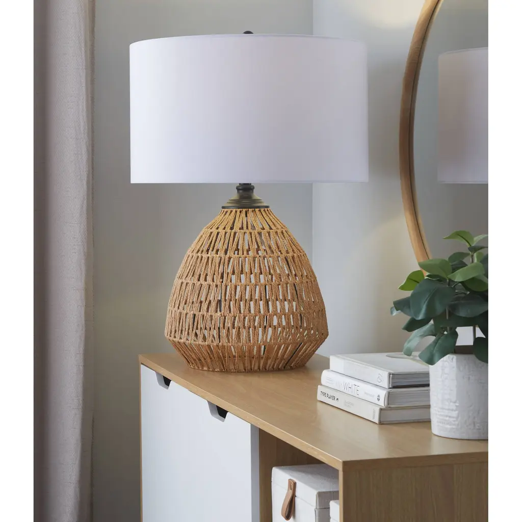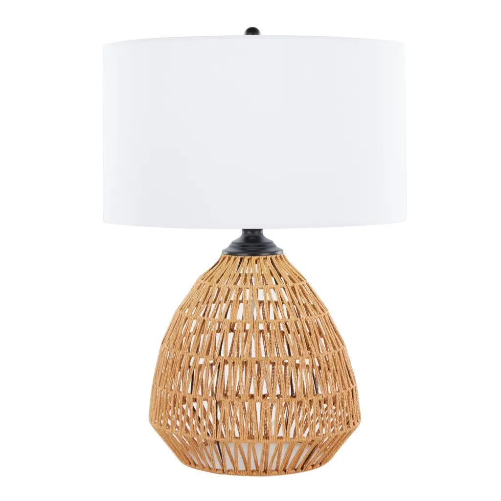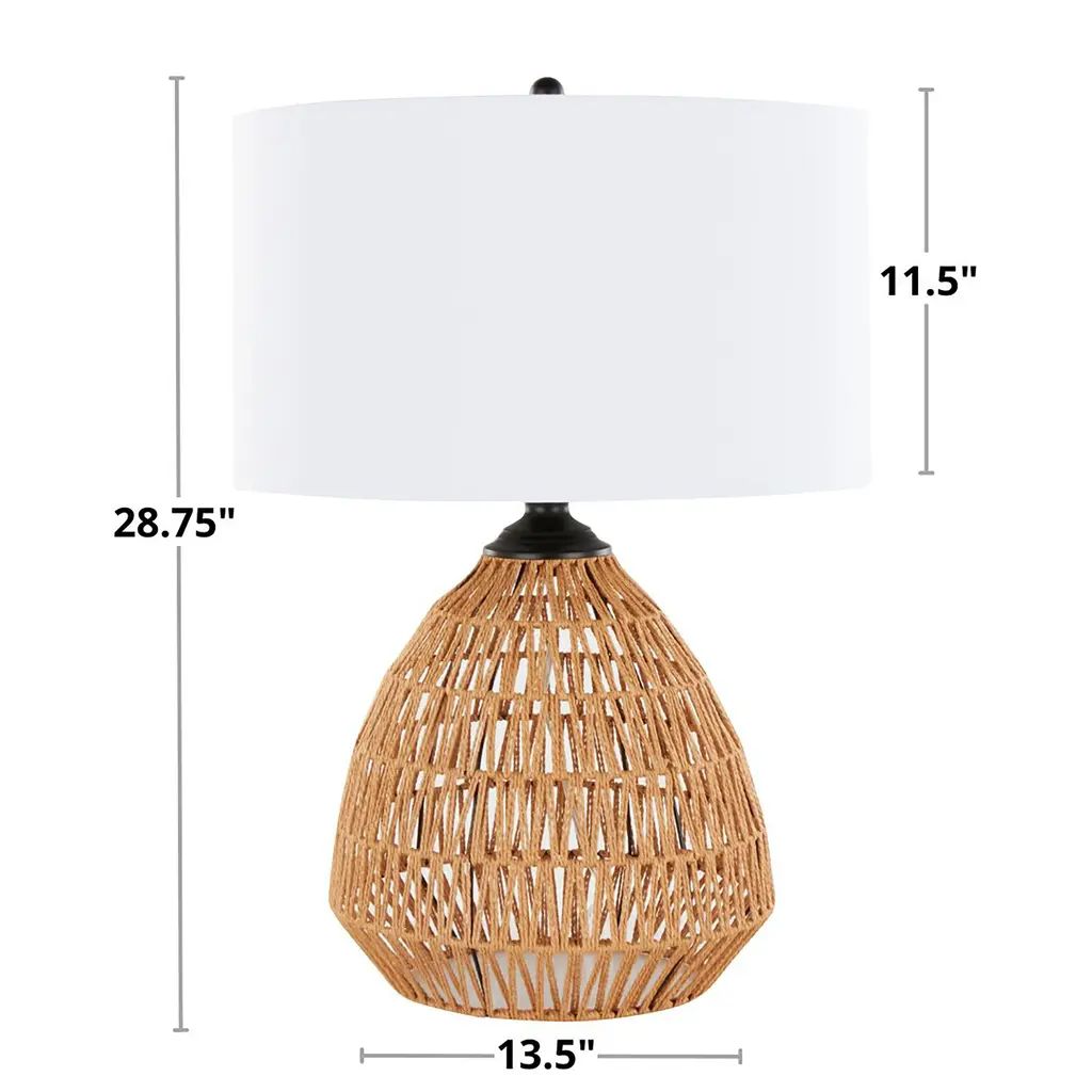 Illuminate your space with the Safa Table Lamp! This table lamp features a natural rope rattan body with accents of black metal and a linen shade. This contemporary lamp will be a nice piece in any room in your home, so get yours today. Features: Includes: 1 table lamp Color: Natural Rope Rattan + Matte Black Metal + White Linen Materials: Rattan, Metal, Linen, Electrical Contemporary styling White linen shade Natural rope rattan body Black metal accents 3-Way rotary switch Requires one (1) 100W bulb LED bulb included Indoor use only Dimensions: 20 inches L x 20 inches W x 28.75 inches H Lamp Body Length: 13.5 inches Lamp Body Width: 13.5 inches Lamp Body Height: 15.5 inches Shade Length: 20 inches Shade Width: 20 inches Shade Height: 11.5 inches Finial Height: 2 inches Harp/Pole Height: 8 inches Cord Length: 77 inches