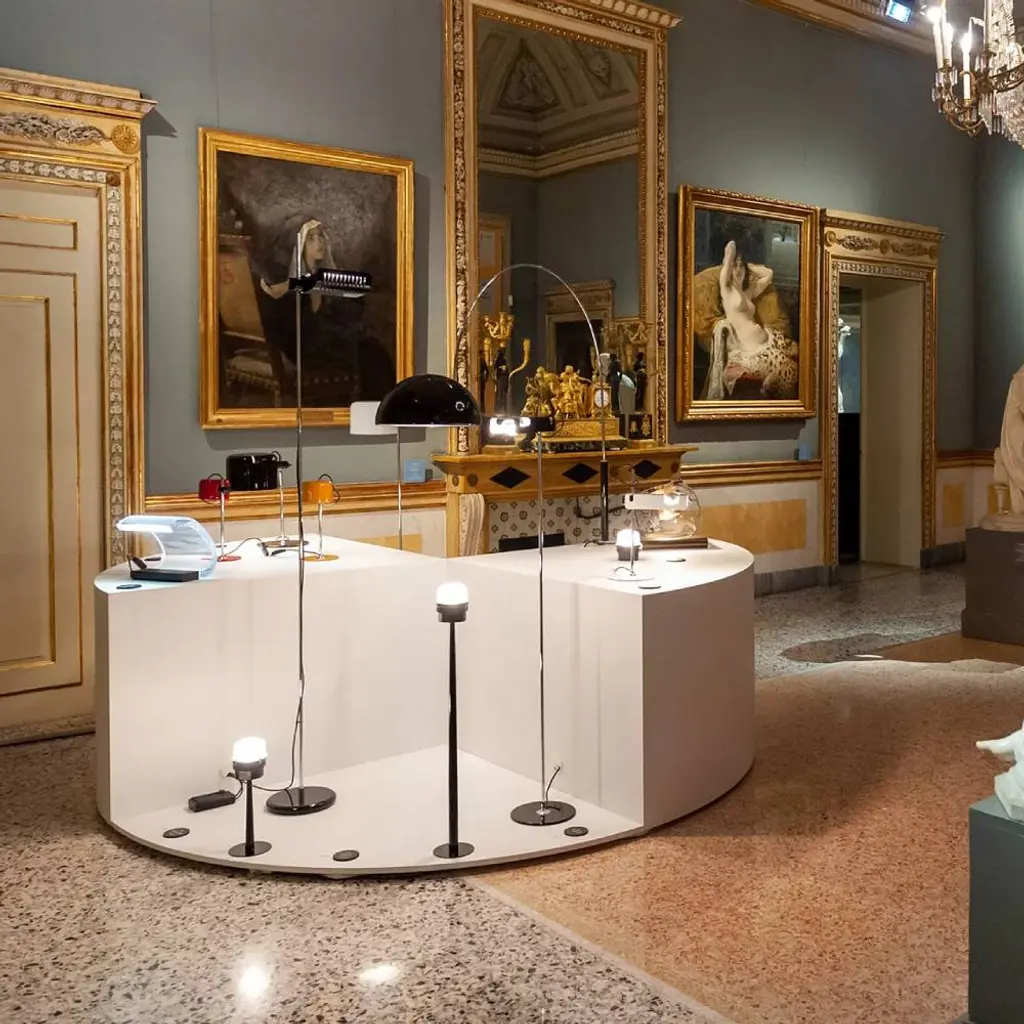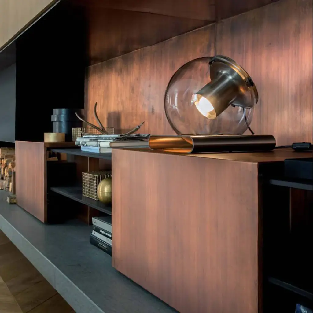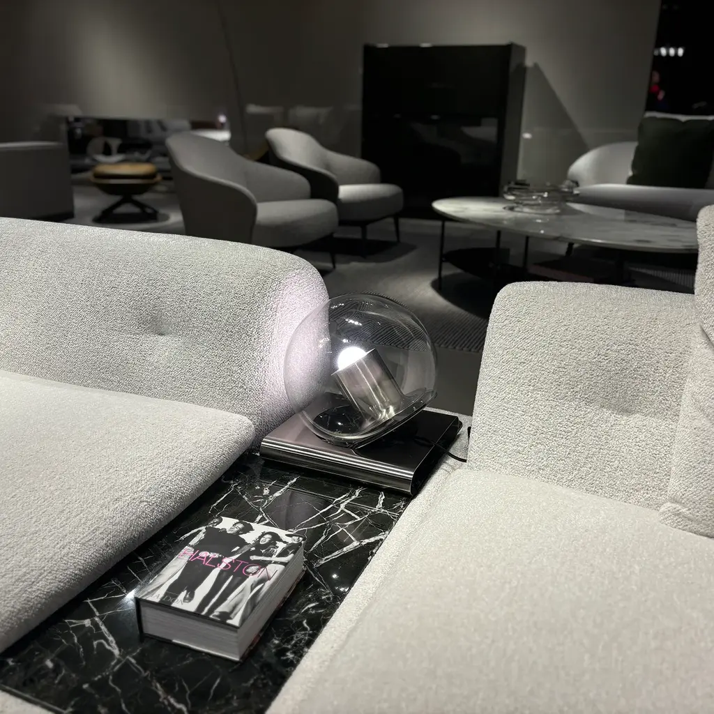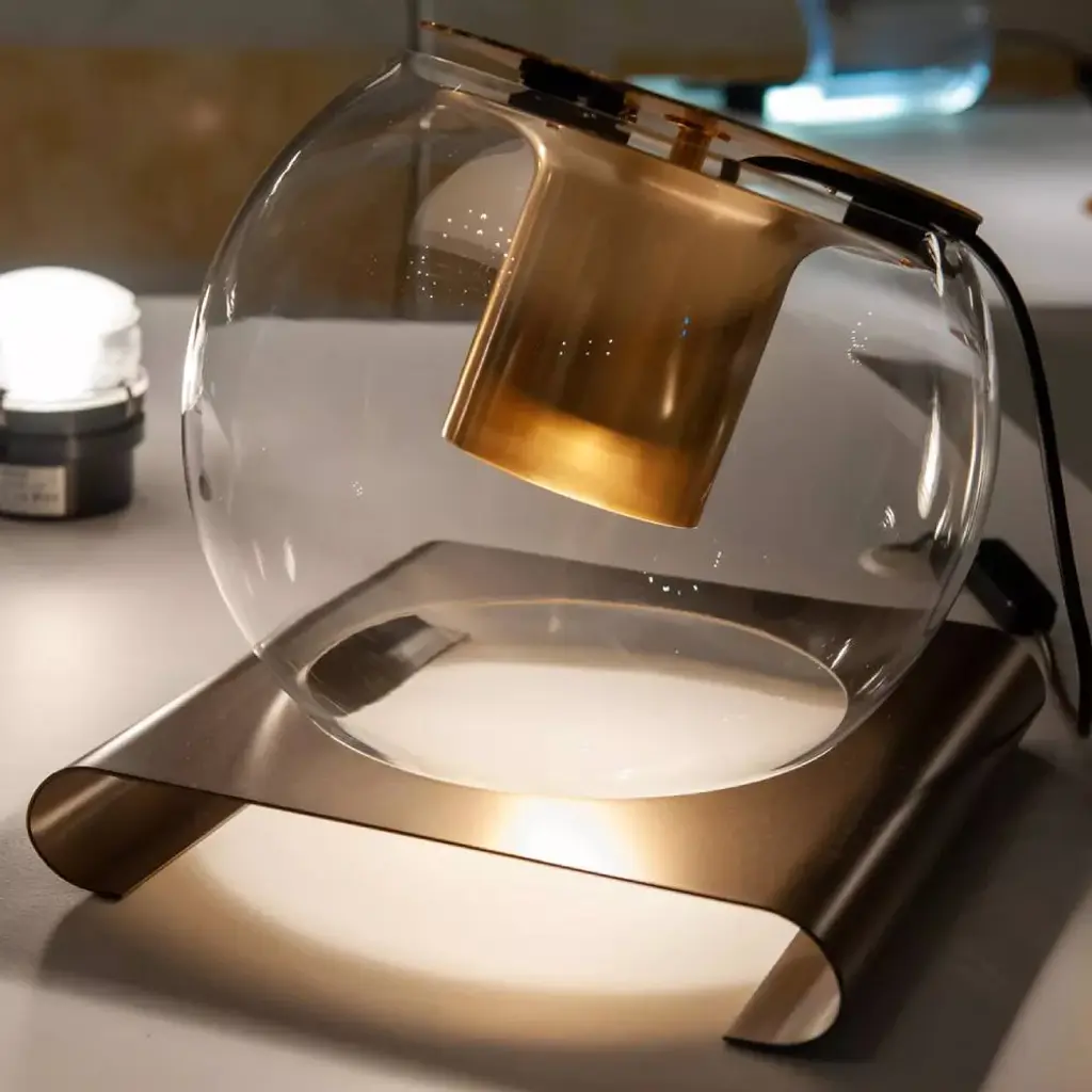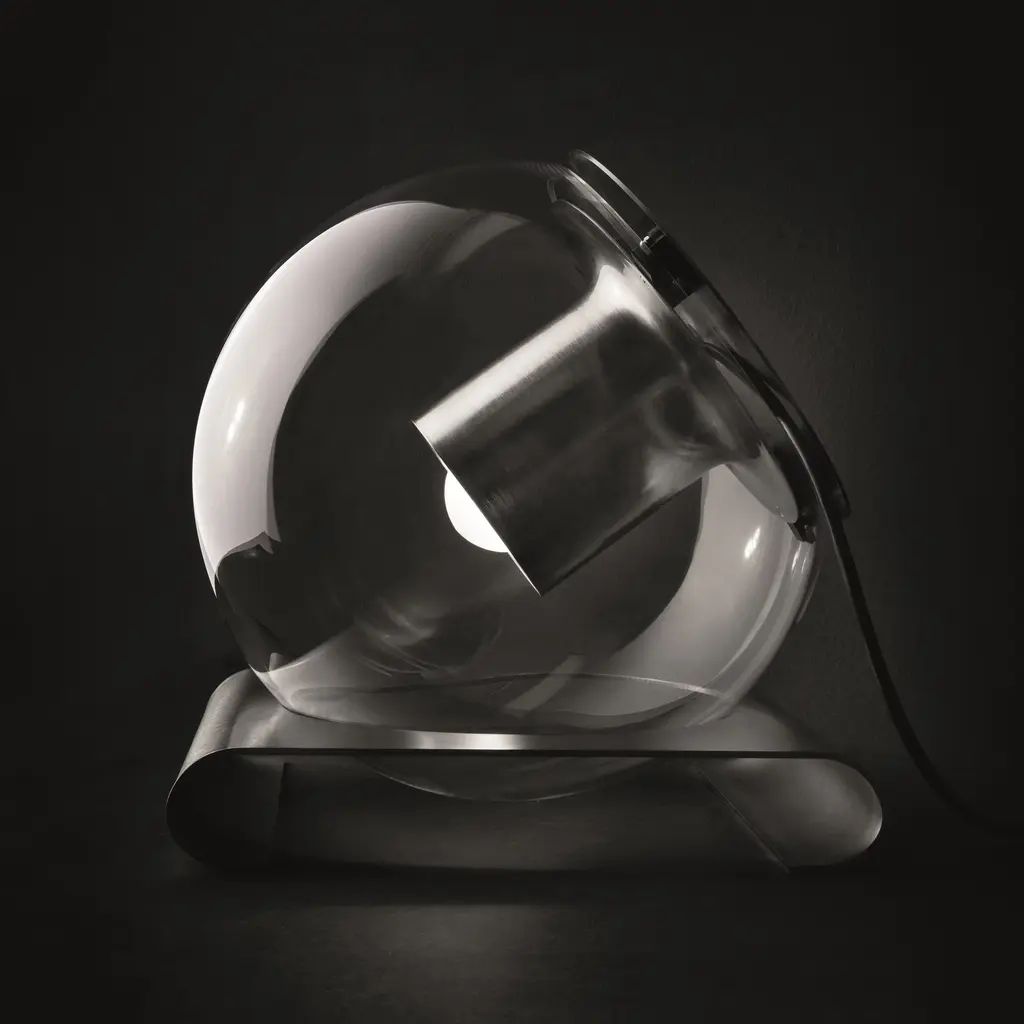 The Globe Table Lamp by Oluce, designed by Joe Colombo in 1964, features a minimalist, transparent blown-glass sphere that encases a cylindrical metal reflector. This design balances direct and diffused light, with the internal reflector focusing illumination outward while enhancing the glass’s soft glow. The lamp is crafted with a satin nickel or satin gold finish. Set on a sturdy metal base.
