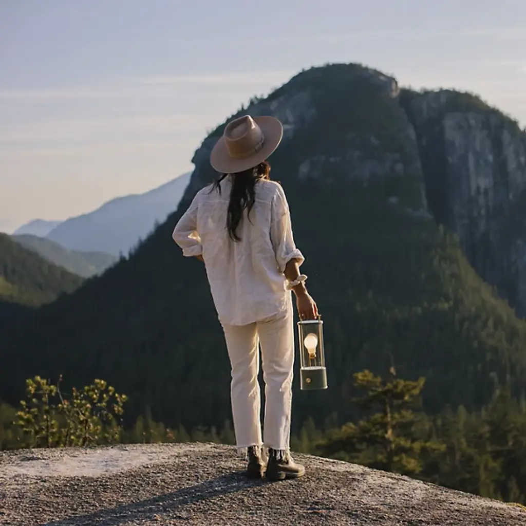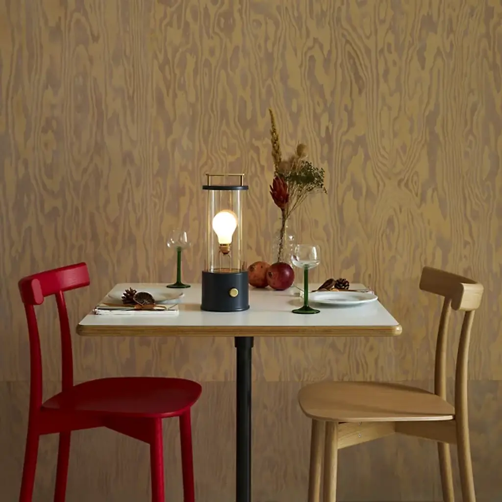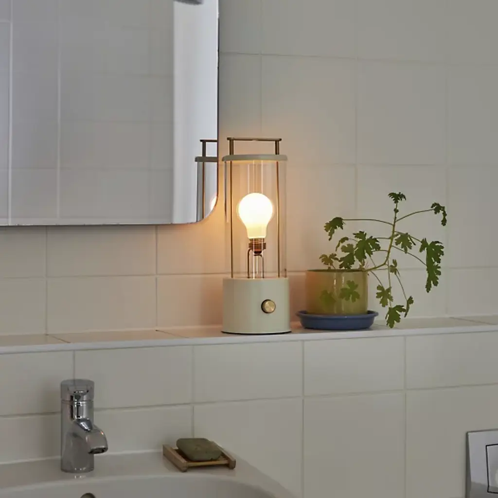 Make a stylish addition to your living spaces with the open elegance of the Muse Rechargeable Portable Lamp from Tala. A fresh design from 2021. A playful lantern structure that rises from a contemporary cylindrical base of powder-coated aluminum, it’s controlled by a switch and uses a slender brass brace to support a single metal cap that tops a clear shade of borosilicate glass. This clear layer reduces bright glare from the wet-listed lamping, transforming your indoor or outdoor gathering spaces into a glittering extravaganza.