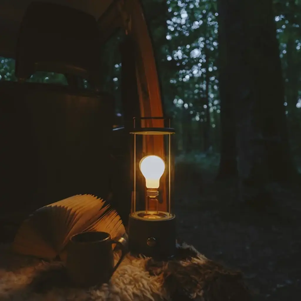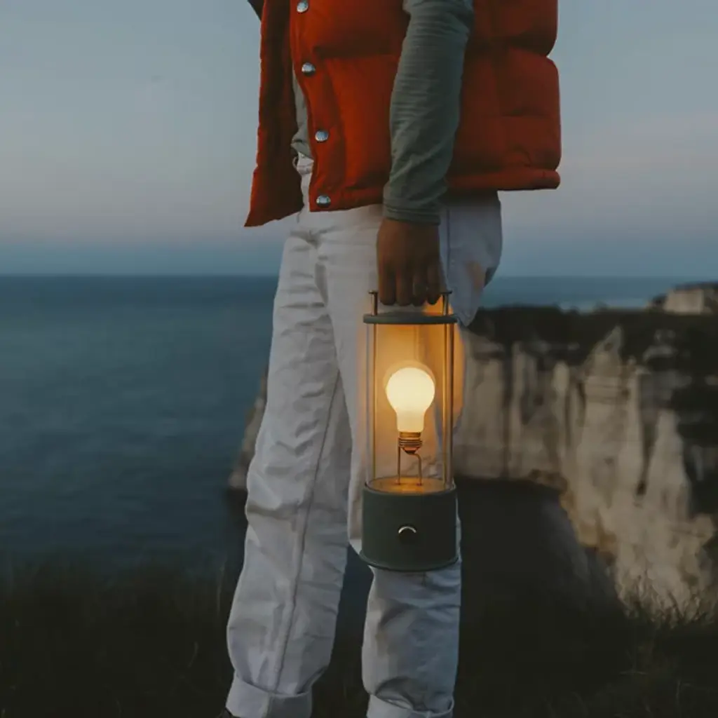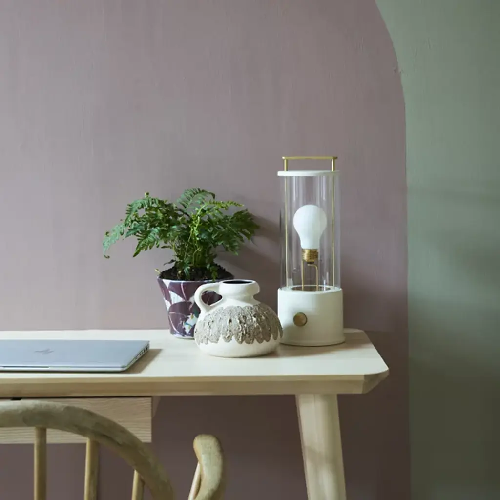 Make a stylish addition to your living spaces with the open elegance of the Muse Rechargeable Portable Lamp from Tala. A fresh design from 2021. A playful lantern structure that rises from a contemporary cylindrical base of powder-coated aluminum, it’s controlled by a switch and uses a slender brass brace to support a single metal cap that tops a clear shade of borosilicate glass. This clear layer reduces bright glare from the wet-listed lamping, transforming your indoor or outdoor gathering spaces into a glittering extravaganza.