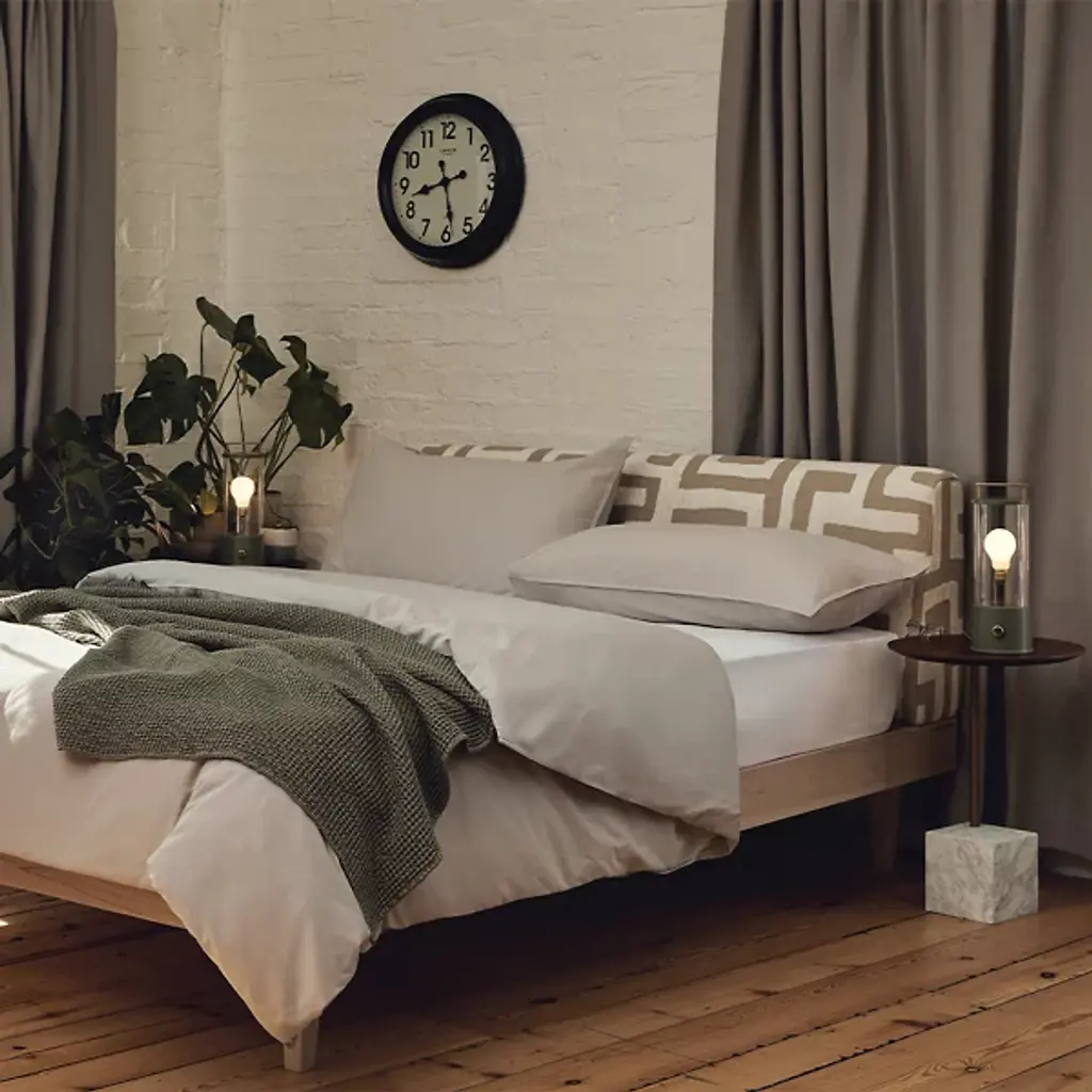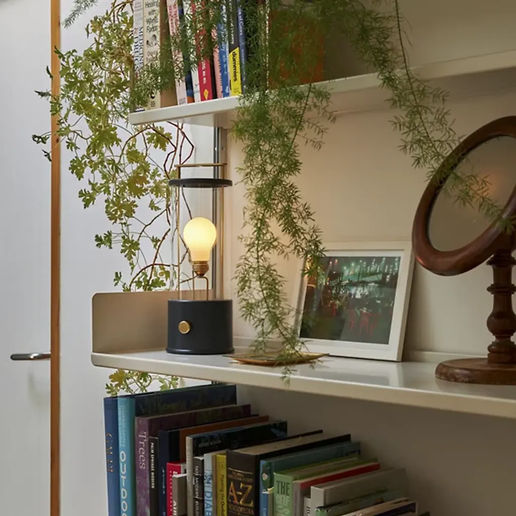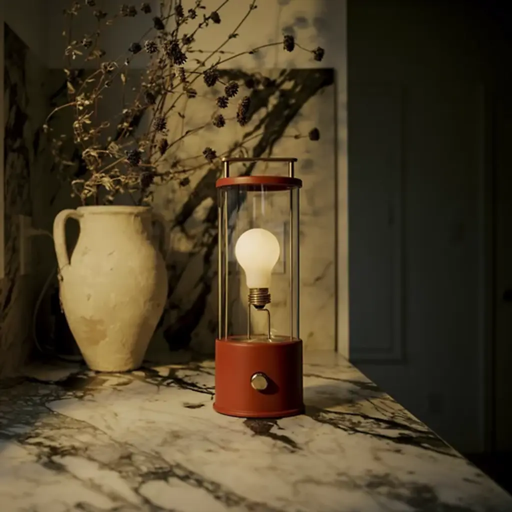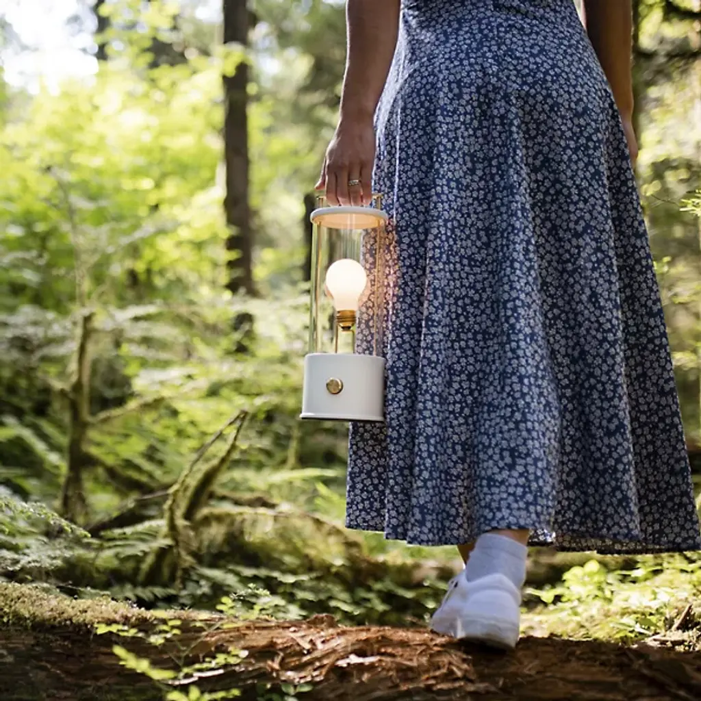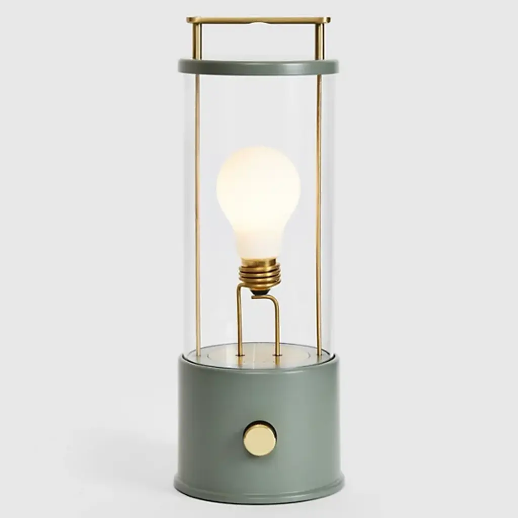 Make a stylish addition to your living spaces with the open elegance of the Muse Rechargeable Portable Lamp from Tala. A fresh design from 2021. A playful lantern structure that rises from a contemporary cylindrical base of powder-coated aluminum, it’s controlled by a switch and uses a slender brass brace to support a single metal cap that tops a clear shade of borosilicate glass. This clear layer reduces bright glare from the wet-listed lamping, transforming your indoor or outdoor gathering spaces into a glittering extravaganza.