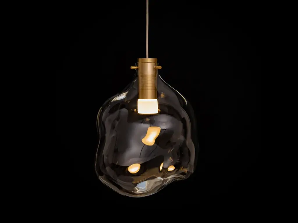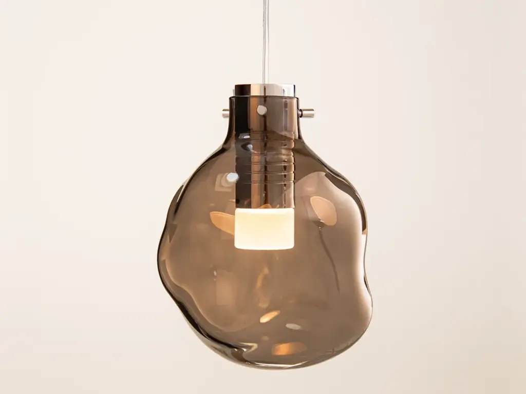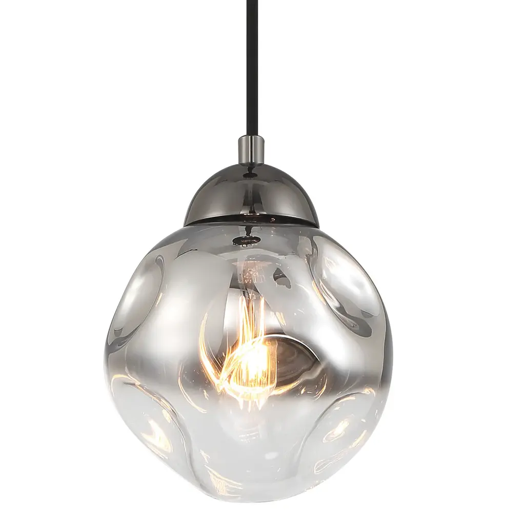 an enchanted portable lamp that evokes the poetic beacon of hope. It is highlighted by a distinct hand-blown glass globe garnished with fluid ribbon patterns, as well as a polished chrome body