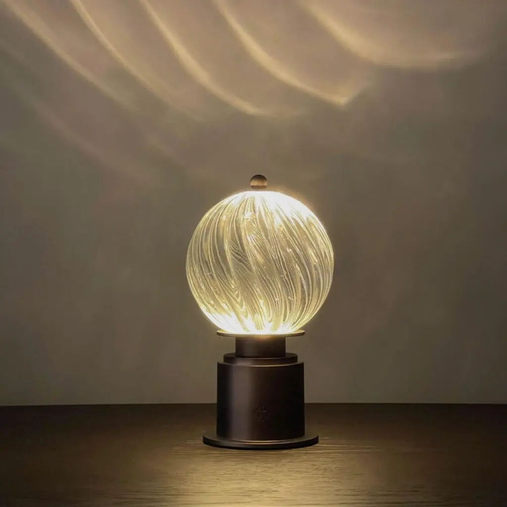 accentuate your home with the quietly-elegant lamp, created to evoke the swirling magic of a glowing globe. articulated with a solid glass spiral sphere and an anodized bronze base, the lamp is designed to accentuate your home with a sensuous atmosphere.Larger quantities are available upon request, with 8 weeks of production time.