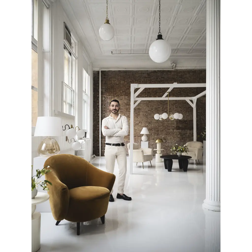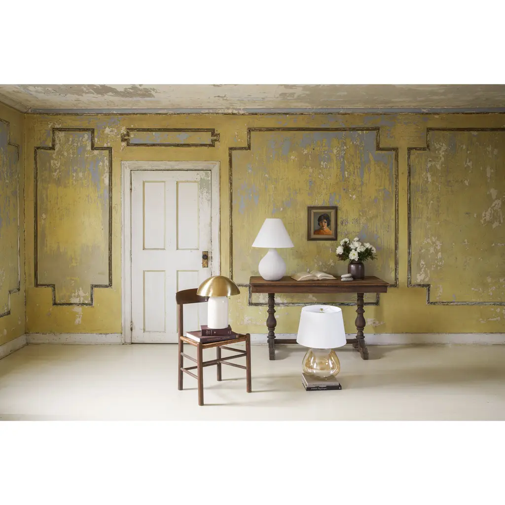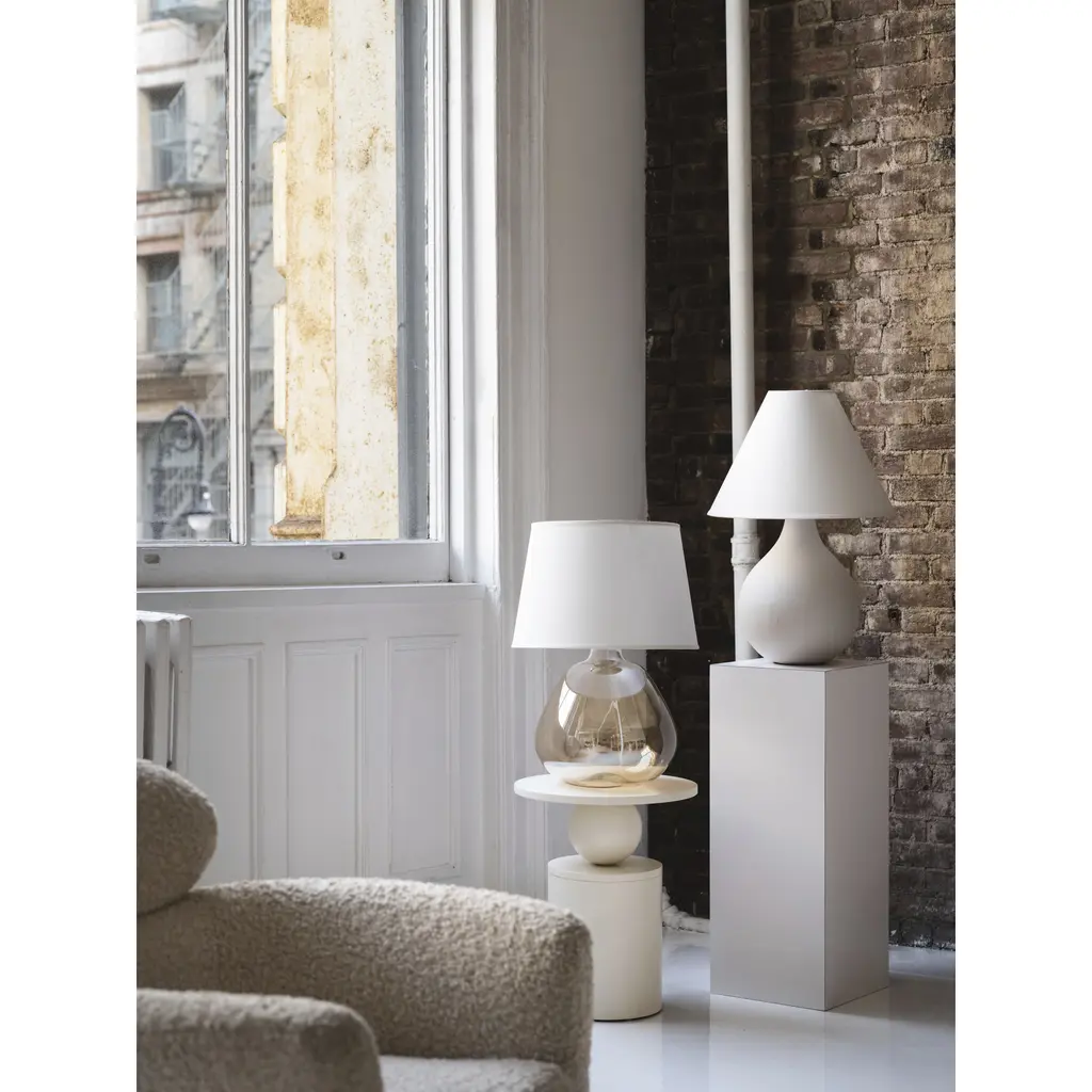 Thea's beauty lies in her unique luster finish, expertly crafted to enhance the organic form. The table lamp emanates warmth, featuring a plated champagne amber glass that quietly glistens. French-wired for added flair, the wire extends directly from the socket. Topped with a linen drum shade.