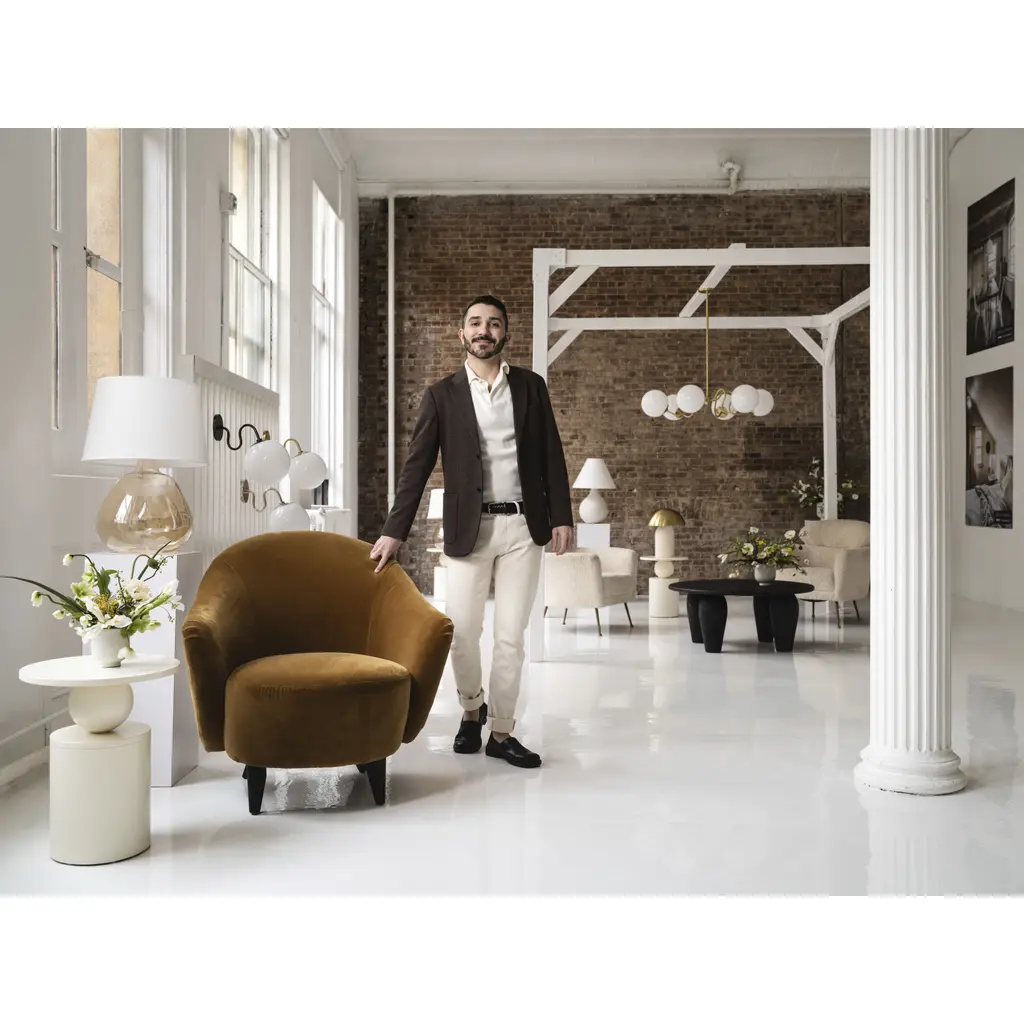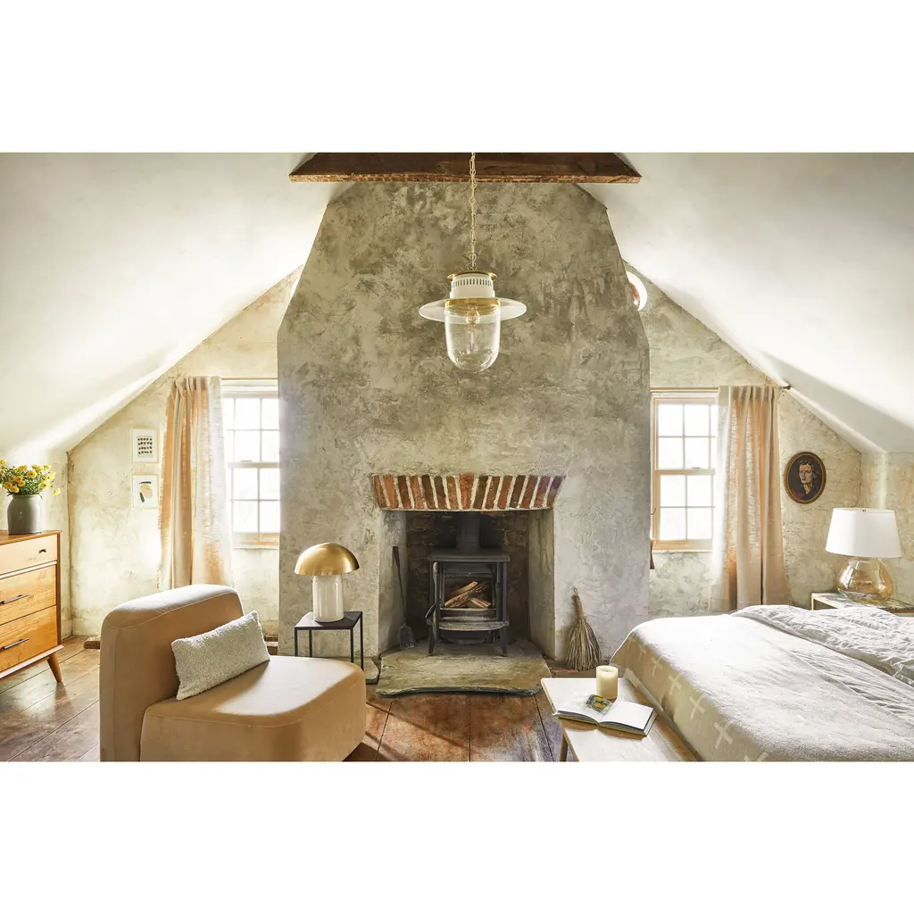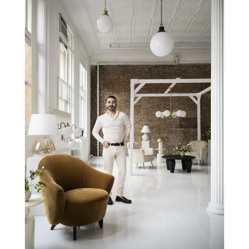 Thea's beauty lies in her unique luster finish, expertly crafted to enhance the organic form. The table lamp emanates warmth, featuring a plated champagne amber glass that quietly glistens. French-wired for added flair, the wire extends directly from the socket. Topped with a linen drum shade.