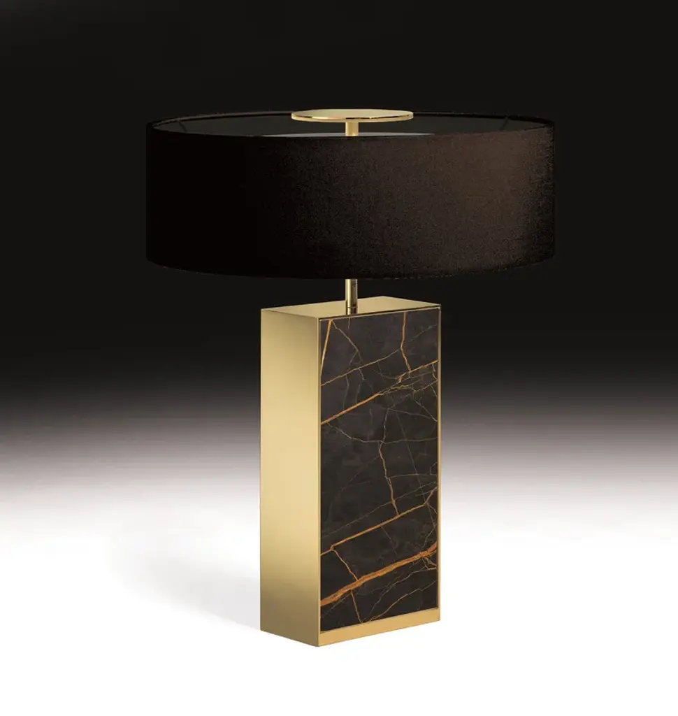 Thelma Couture is a decorative table lamp providing diffuse and downwards light with a central body in Port Laurent marble, metal elements in matt gold finishing. Opaque glass diffuser and black cotonette lampshade. Bulbs: 2 x E27 (bulbs are not included, suggested LED bulbs)Plug type F (EU-schuko) with adapter type A (USA) or type G (UK)CE certified Thelma Couture, table lamp that fits as a unique furnishing element in the most diverse settings.The lampshade with black stiff fabric makes the composition even more precious.