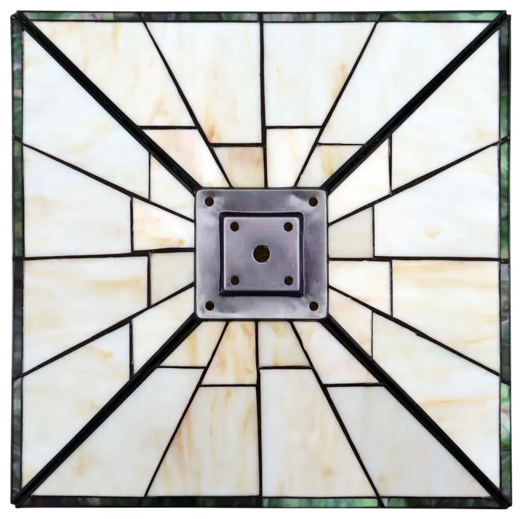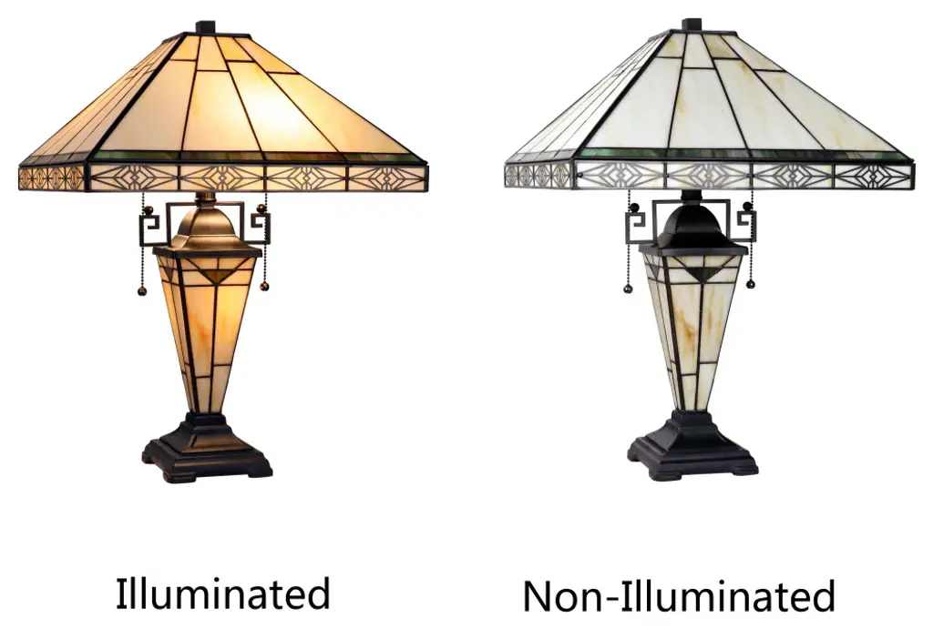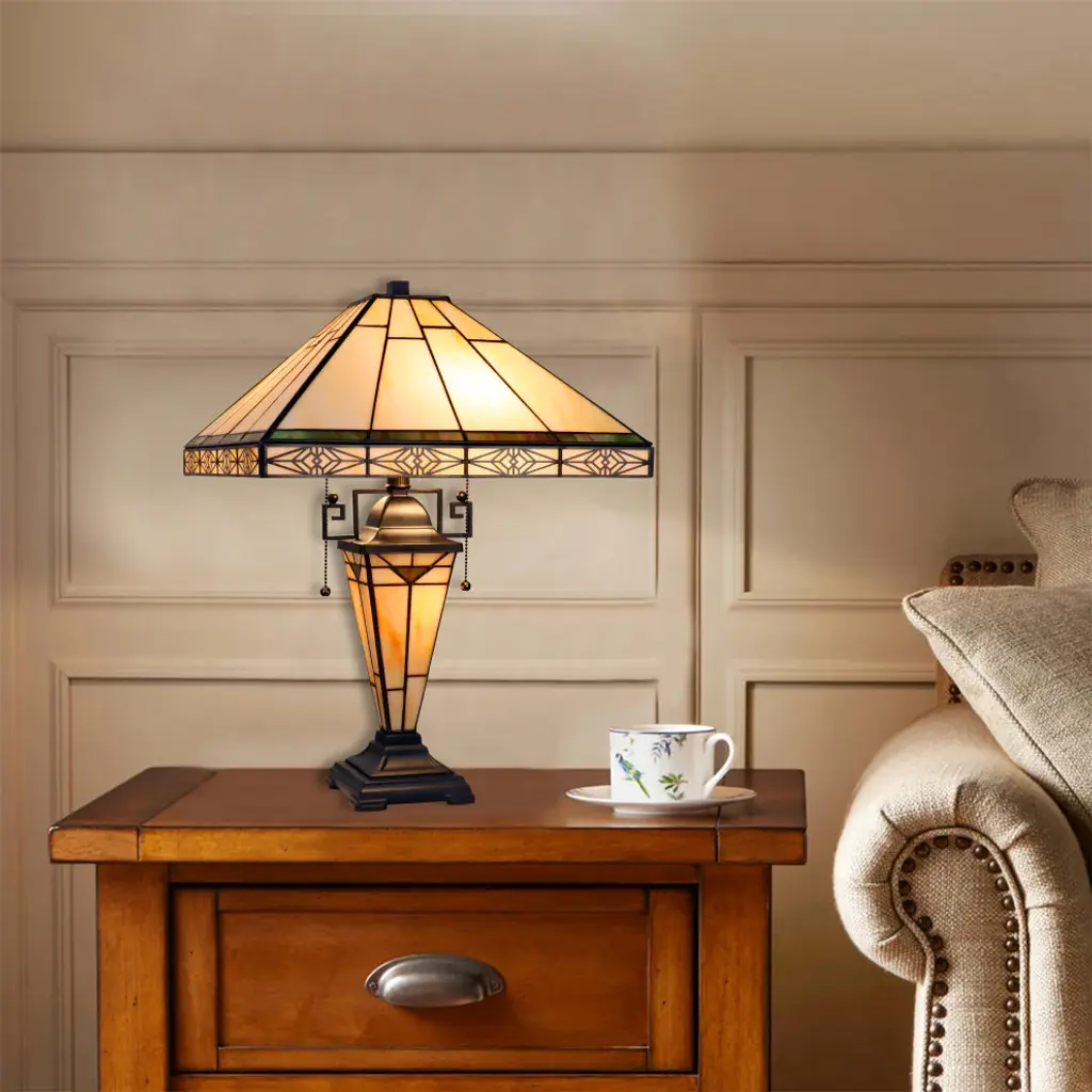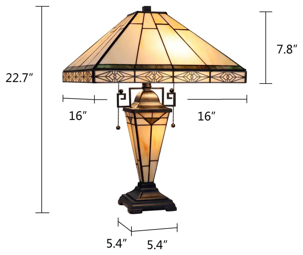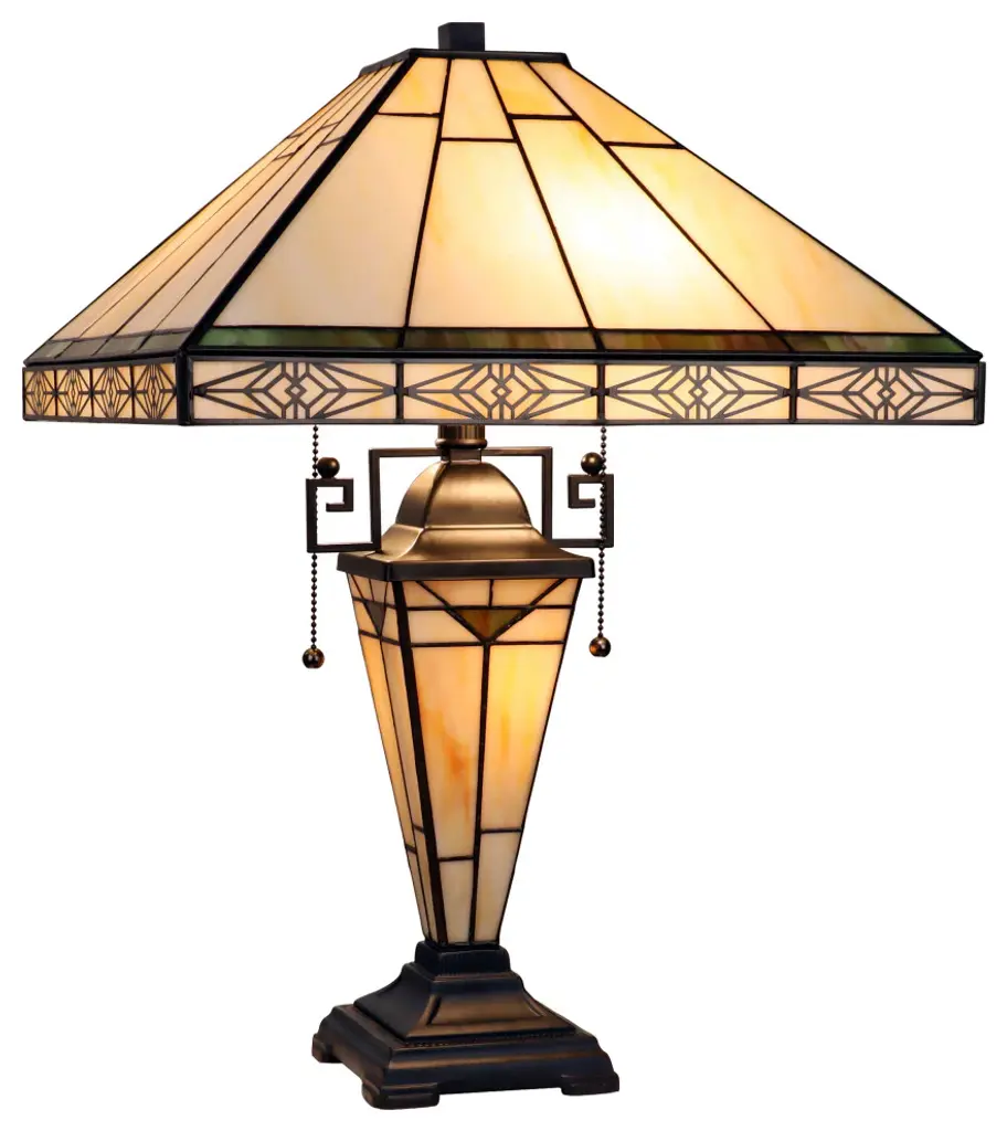 Theros is a pleasing, double-lit stained glass table lamp in a traditional Mission style, featuring a detailed base, 2 pull chains, and an on-cord rotary switch. This lamp would be perfect in a bedroom, living room, and dining room. The shade is hand-crafted, using the same methods developed by Louis Comfort Tiffany in the early 1900s. This process entails using 64 hand-cut stained art glass pieces, each wrapped in fine copper foil and soldered together at extremely high temperatures to form each unique piece. The exact size to the nearest inch may vary, and the exact color of each glass piece may vary due to each piece being hand-crafted. The first image is with the light shining through, and the second image is with no light. Dry-listed and recommended for an indoor setting.