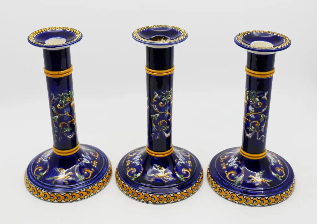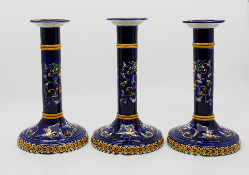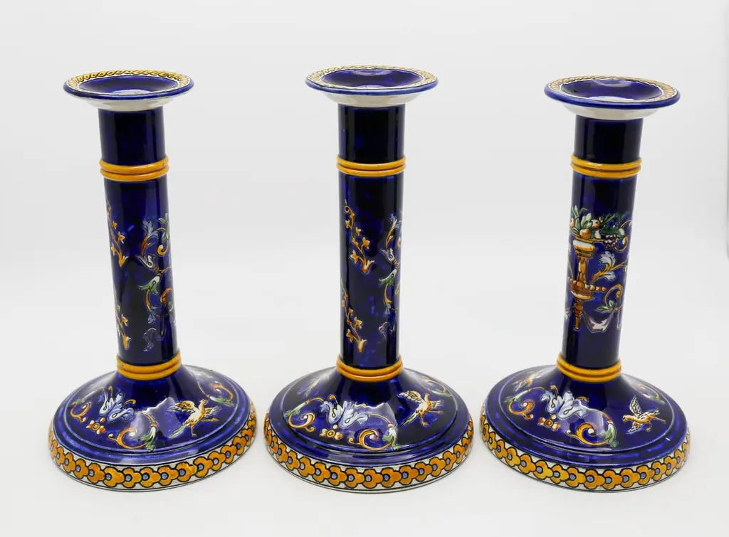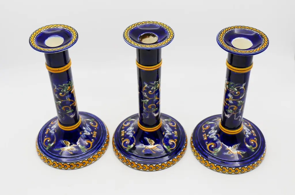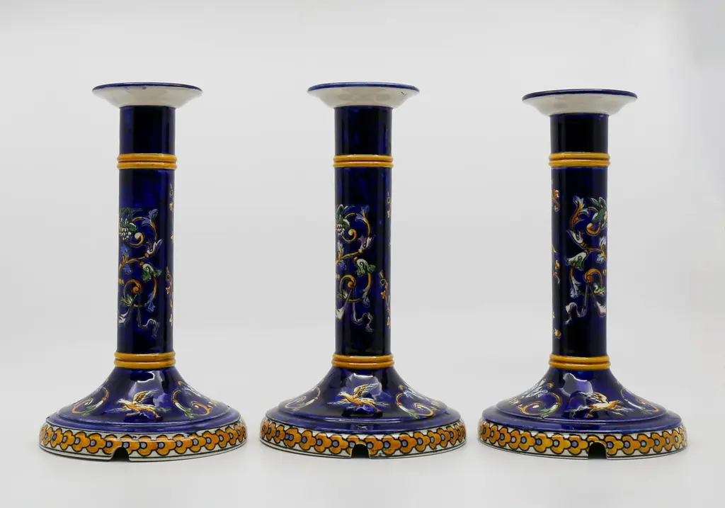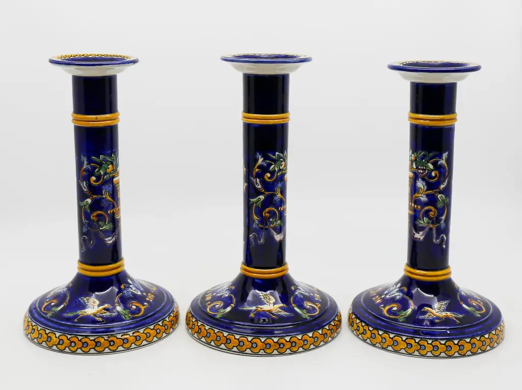 Three very beautiful Gien Renaissance model candlesticks in its night blue version. The base is cut out for a wire passage. Probably an adjustment to install a lamp. Apart from this small cut, no defect.