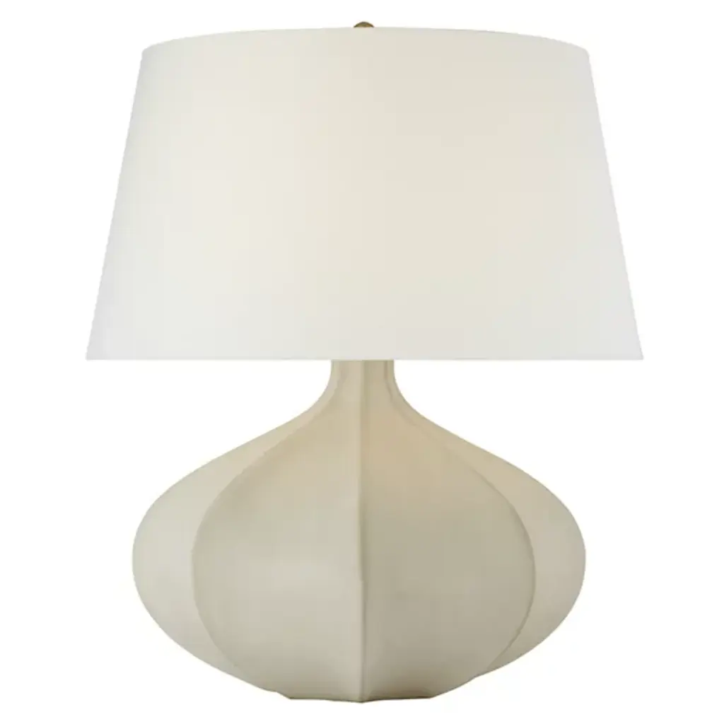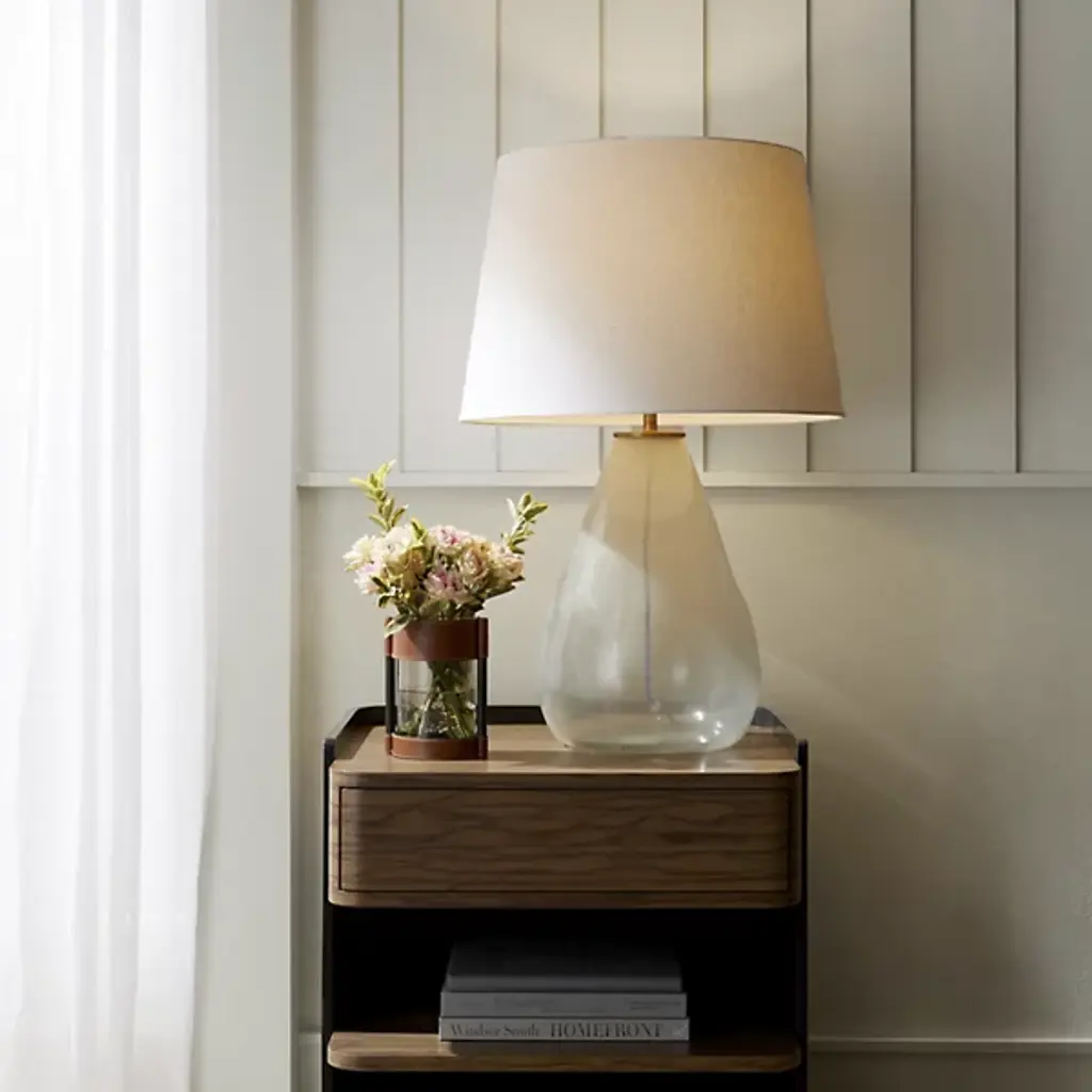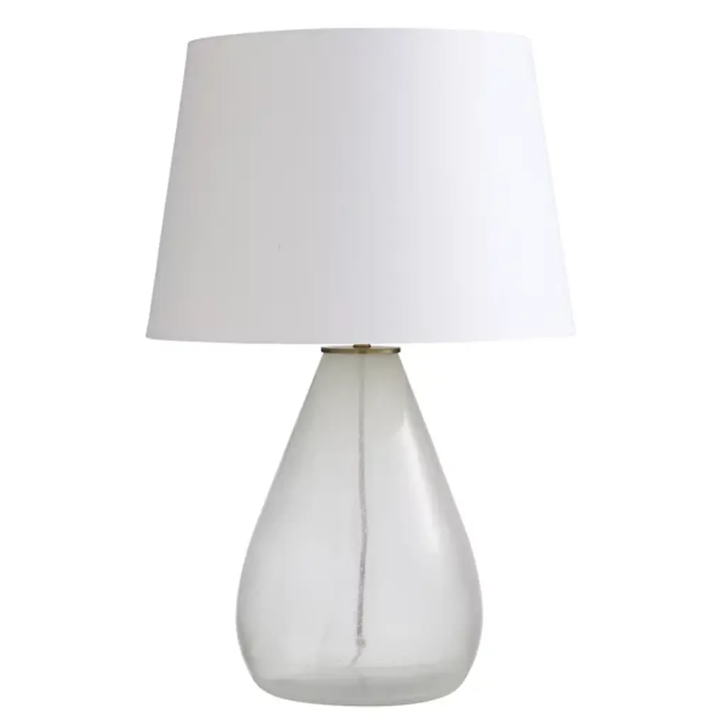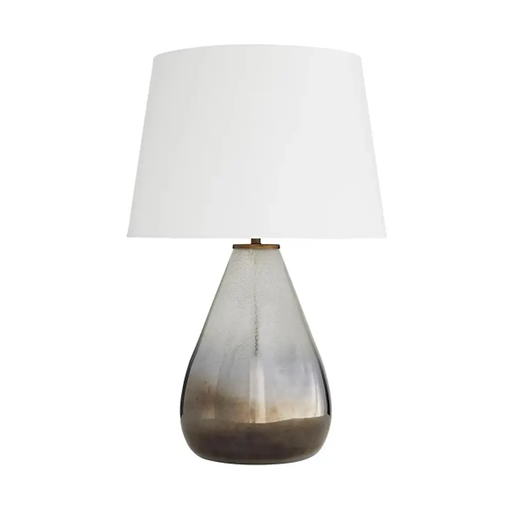 Invoking a range of moods and images, the Tiber Table Lamp from Arteriors presents an eye-catching display sure to be the center of your accent pieces. The sleek figure of the body is first hand-blown and then given a lustrous smoky texture that resembles the weather of a coming storm. A tapered white linen shade tops off the piece. The bulb within brings the intricate body to life as it sends out a warm, ambient glow.