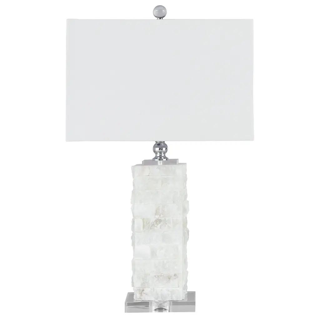 31"H Translucent beauty comes alive in this unique, tiered selenite table lamp, making it ideal for any room. Shade: 20" X 20" X 10", Off White, Man-Made Linen. 3 Way, 150 Watt Max, Type A Bulb, 8.5" Nickel Harp