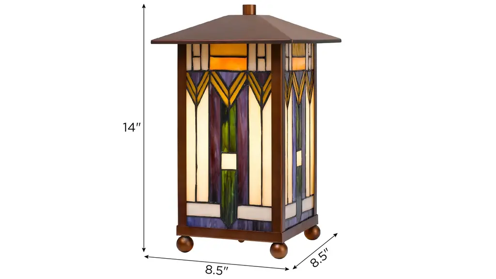 Add a touch of color to your d_cor with this color glass Tiffany Accent Lamp. It features a stained glass mission style design with a wood tone resin body with bronze accents. The lamp has a square weighted base and a double pull chain.