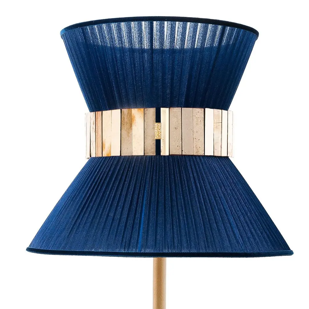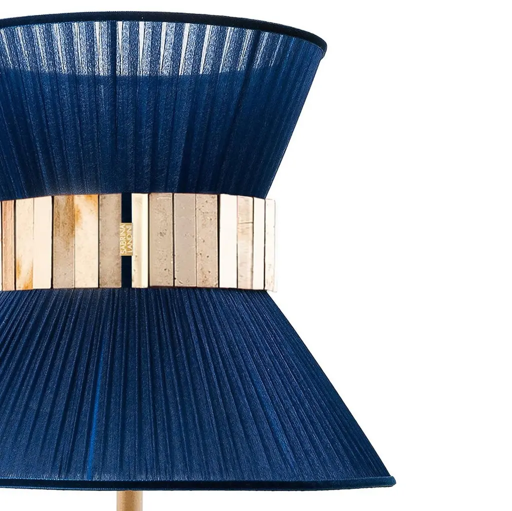 “Tiffany” Contemporary Table Lamp 23 Sapphire Silk, Antique Brass, Silvered Glas