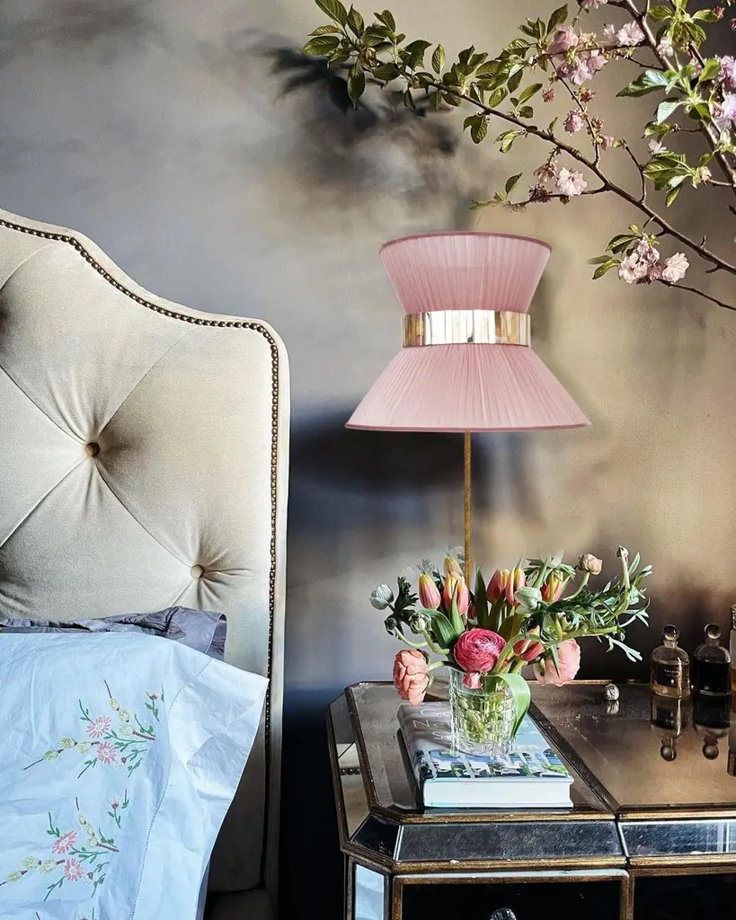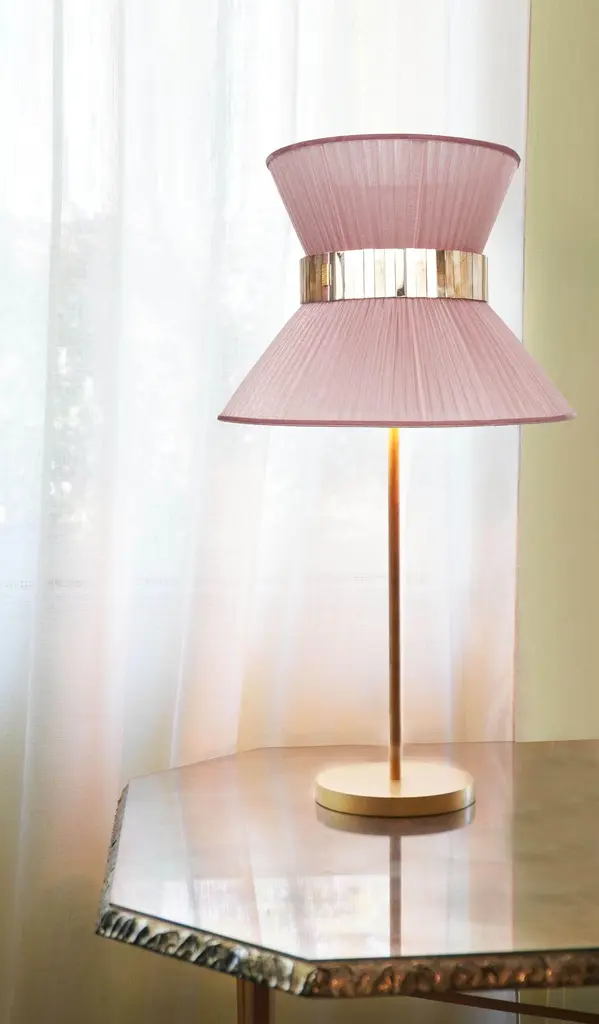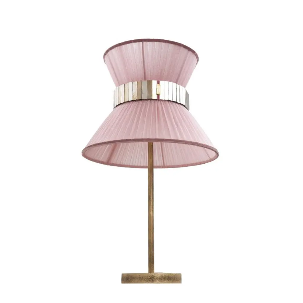 Tiffany Contemporary Table Lamp 30, Blush Silk Antiqued Brass, Silvered Glass