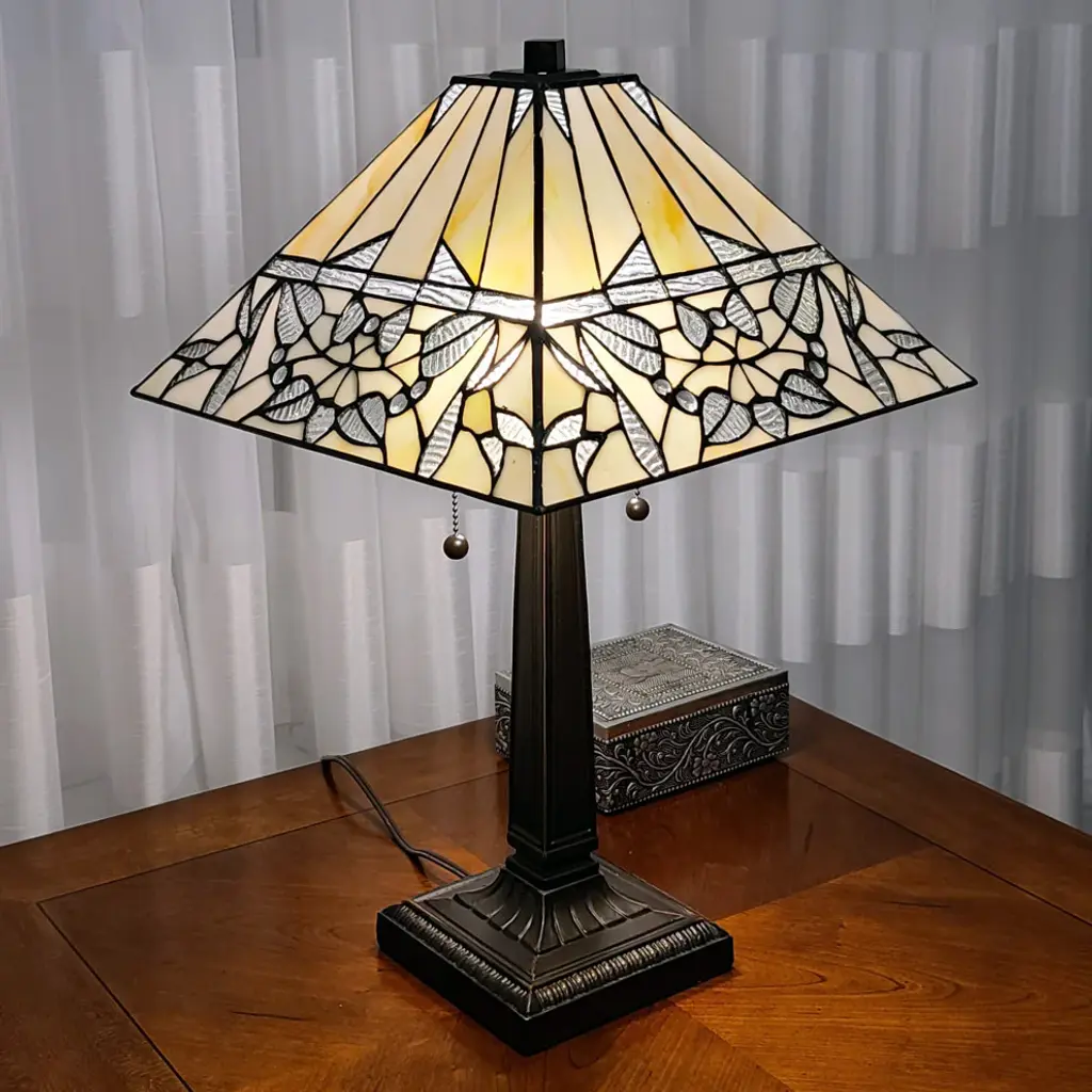 This Tiffany style lamp is hand-crafted using the same techniques that were developed by Louis Comfort Tiffany in the early 20th century. Each piece of glass is hand cut to the perfect shape and size, wrapped in copper foil, and soldered together to create a truly unique piece of art. Made with 260 pieces of hand-cut stained glass and 20 jewels. Double pull chain switch controls each light separately. Requires two 60W E26 medium base type A bulbs (Not Included). Our lamps are fully compatible with CFL and LED bulbs. Shade colors will appear darker and less vibrant when not illuminated. The handcrafted nature of this product creates variations in color, size and design. If buying two of the same item, slight differences should be expected. This stained-glass product has been protected with mineral oil as part of the finishing process. Please use a soft dry cloth to remove any excess oil.