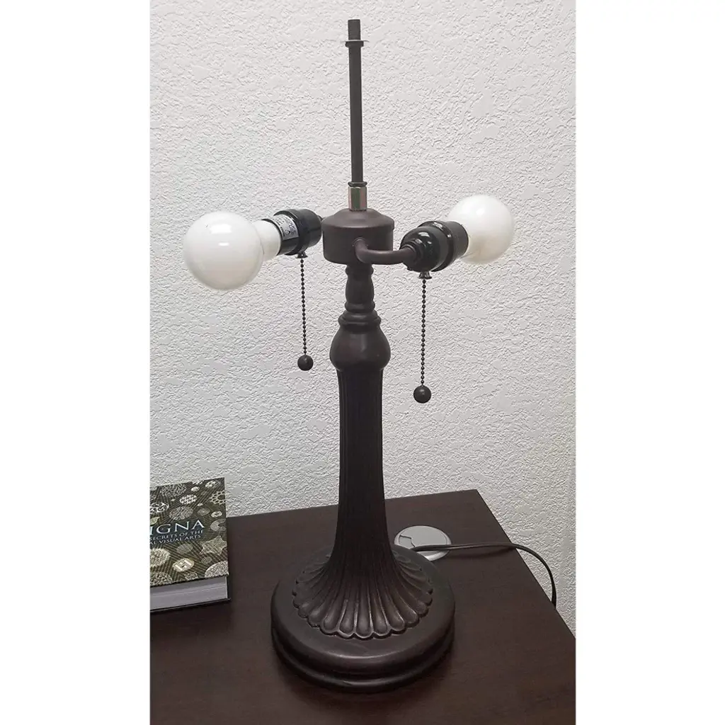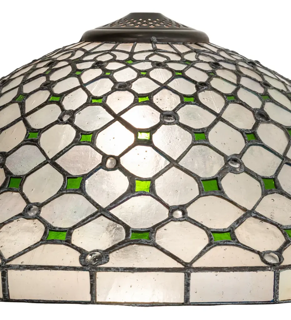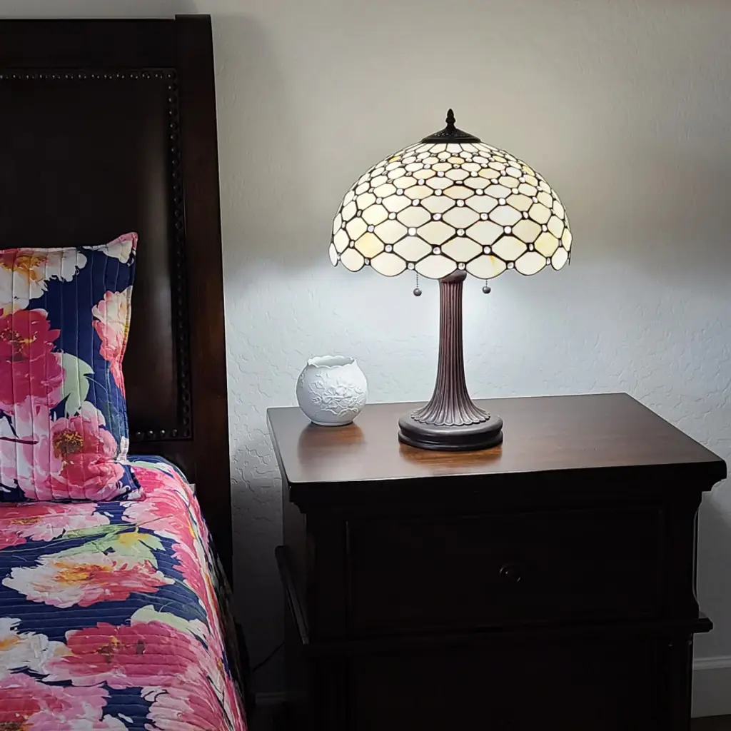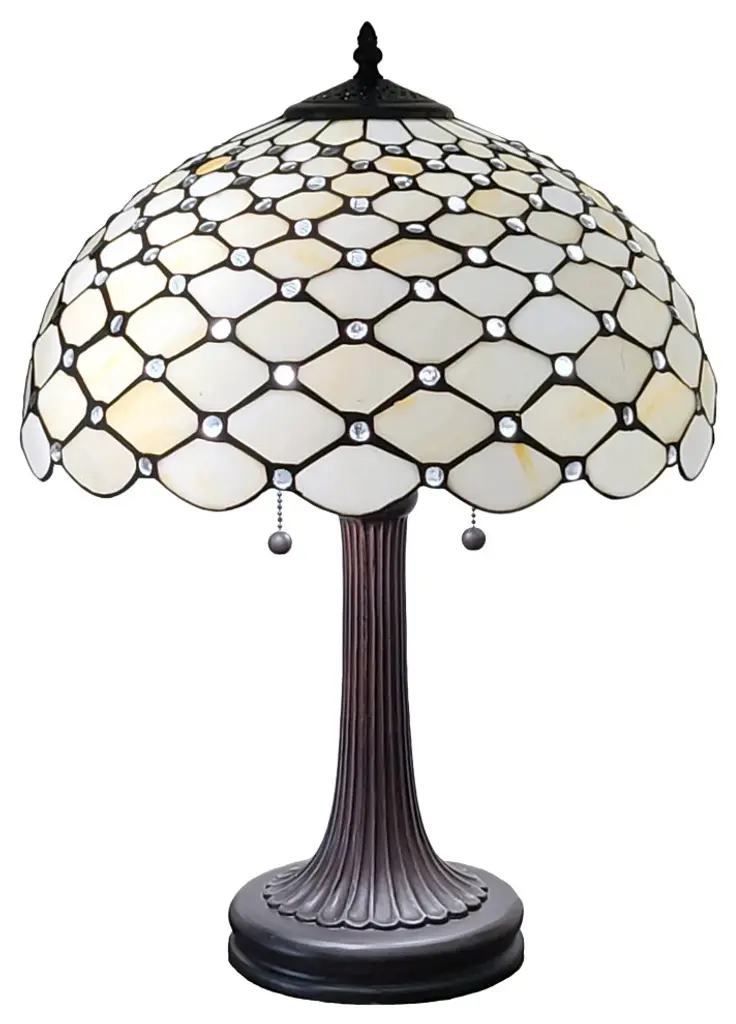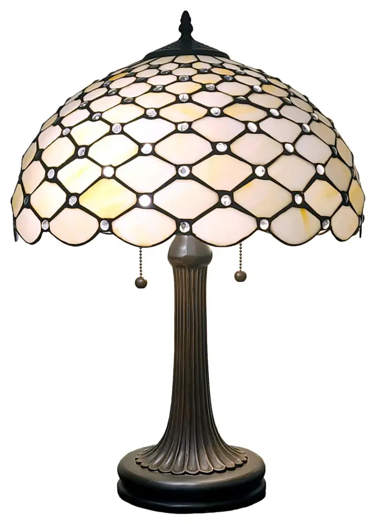 This Tiffany style lamp is hand-crafted using the same techniques that were developed by Louis Comfort Tiffany in the early 20th century. Each piece of glass is hand cut to the perfect shape and size, wrapped in copper foil, and soldered together to create a truly unique piece of art. Made with 192 pieces of hand-cut stained glass and 176 jewels. Double pull chain switch controls each light separately. Requires two 60W E26 medium base type A bulbs (Not Included). Our lamps are fully compatible with CFL and LED bulbs. Shade colors will appear darker and less vibrant when not illuminated. The handcrafted nature of this product creates variations in color, size, and design. If buying two of the same item, slight differences should be expected. This stained-glass product has been protected with mineral oil as part of the finishing process. Please use a soft dry cloth to remove any excess oil.