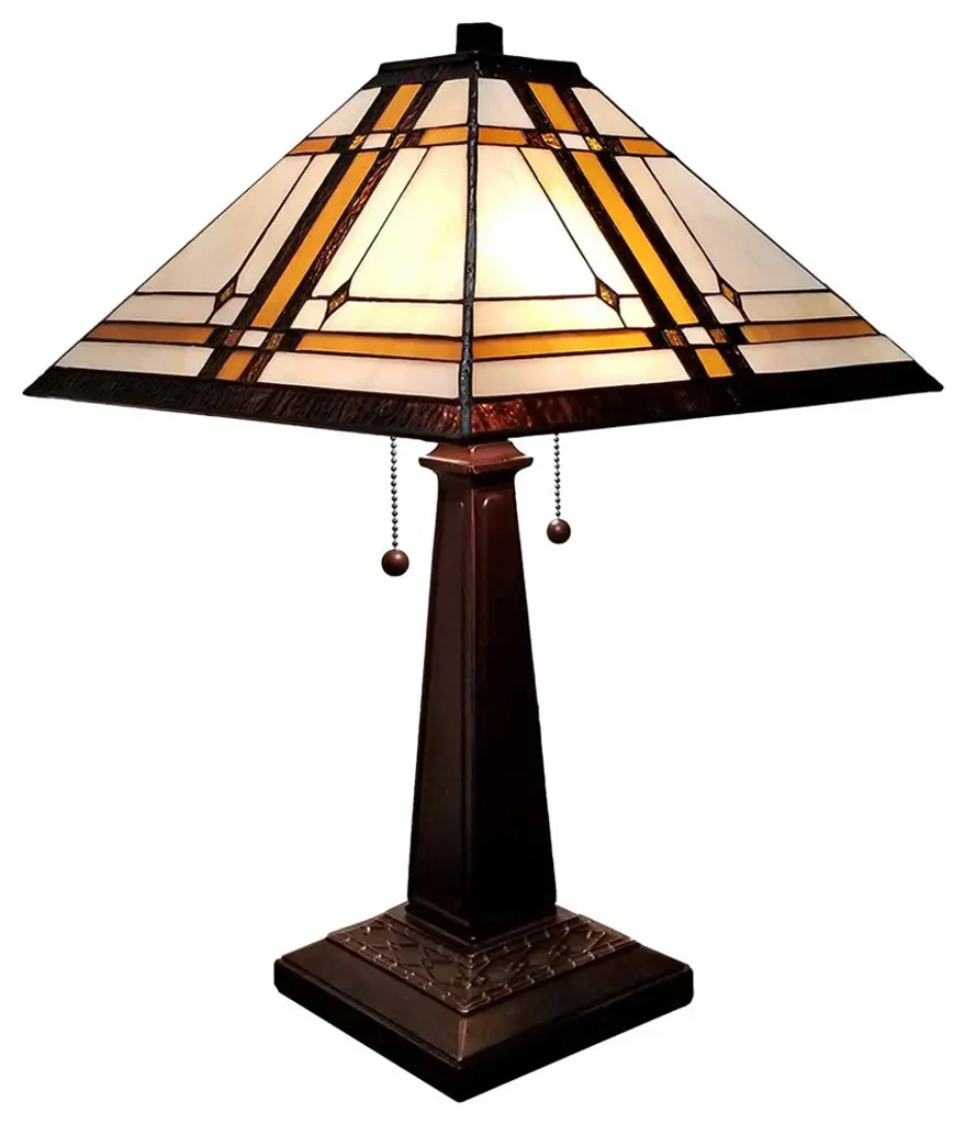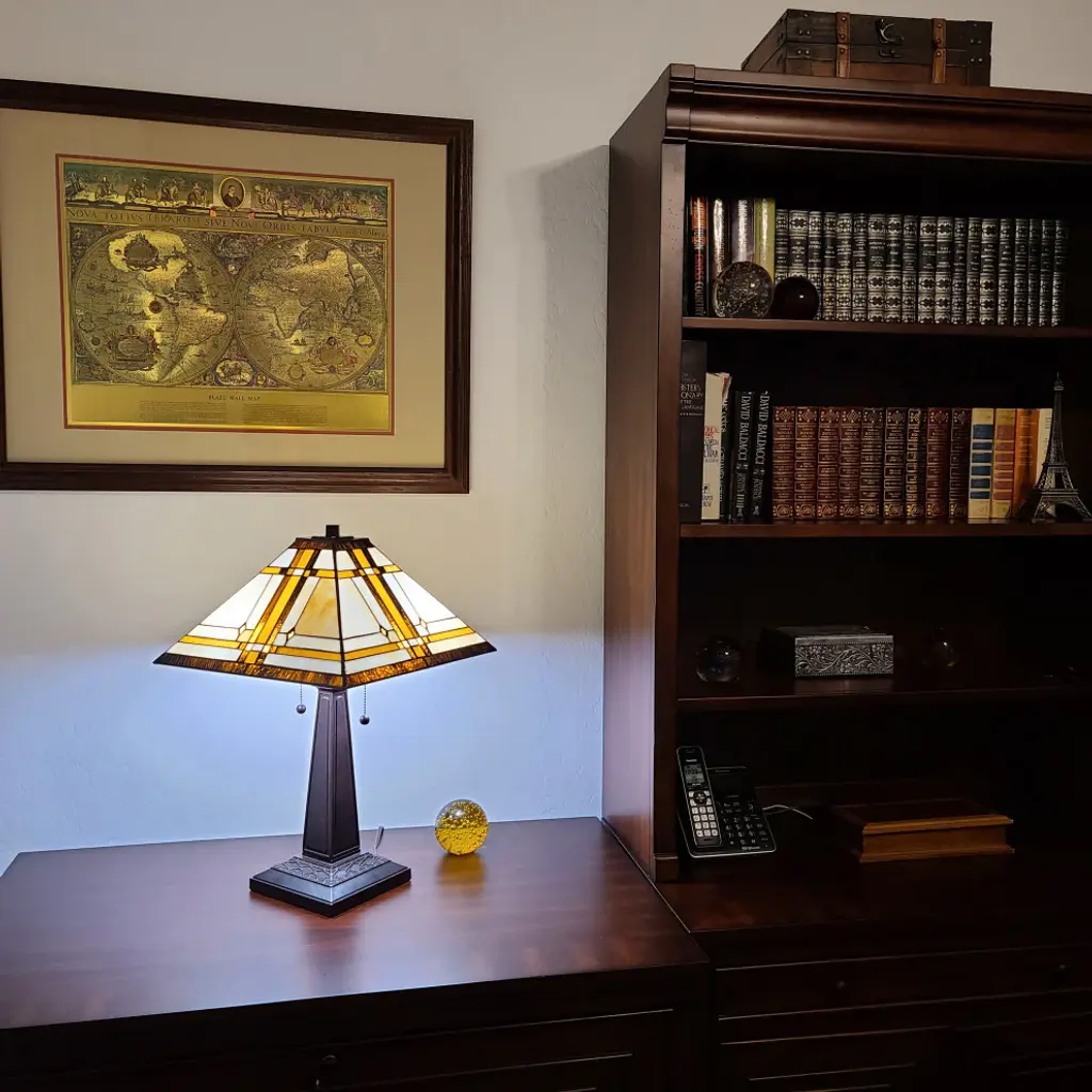 This Tiffany style lamp is hand-crafted using the same techniques that were developed by Louis Comfort Tiffany in the early 20th century. Each piece of glass is hand cut to the perfect shape and size, wrapped in copper foil, and soldered together to create a truly unique piece of art. Made with 172 pieces of hand-cut stained glass. Double pull chain switch controls each light separately. Requires two 60W E26 medium base type A bulbs (Not Included). Our lamps are fully compatible with CFL and LED bulbs. Shade colors will appear darker and less vibrant when not illuminated. The handcrafted nature of this product creates variations in color, size and design. If buying two of the same ite, slight differences should be expected. This stained-glass product has been protected with mineral oil as part of the finishing process. Please use a soft dry cloth to remove any excess oil.
