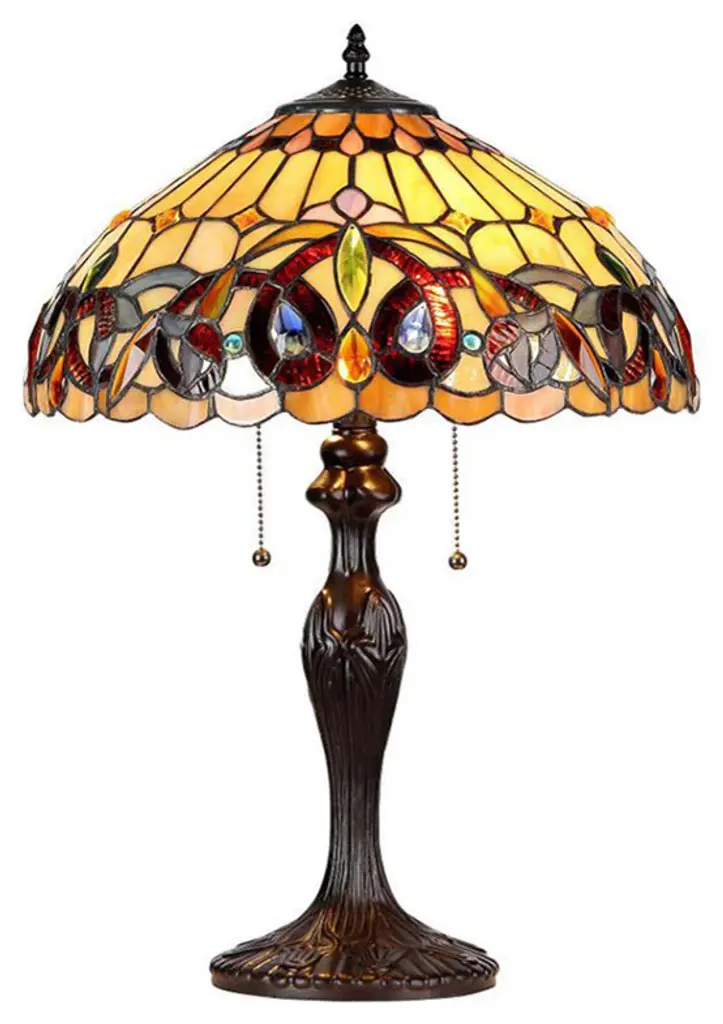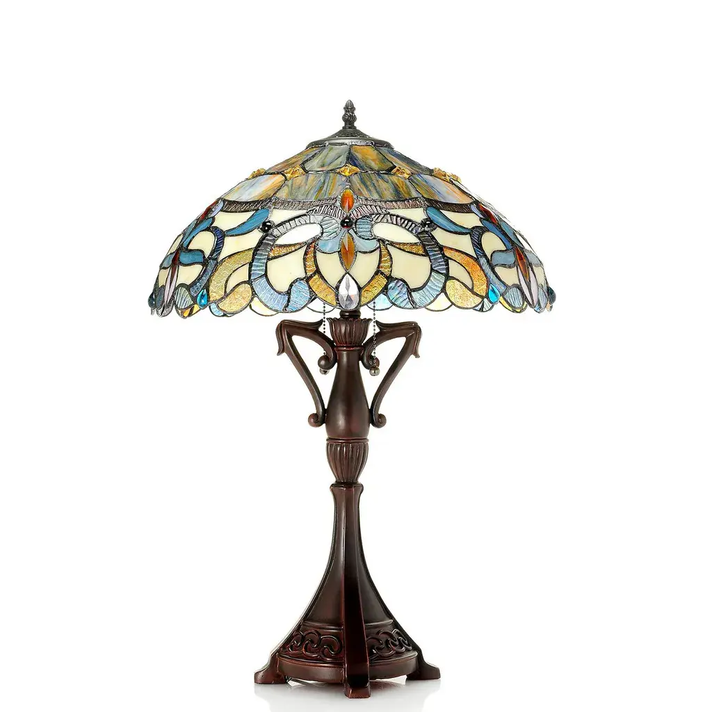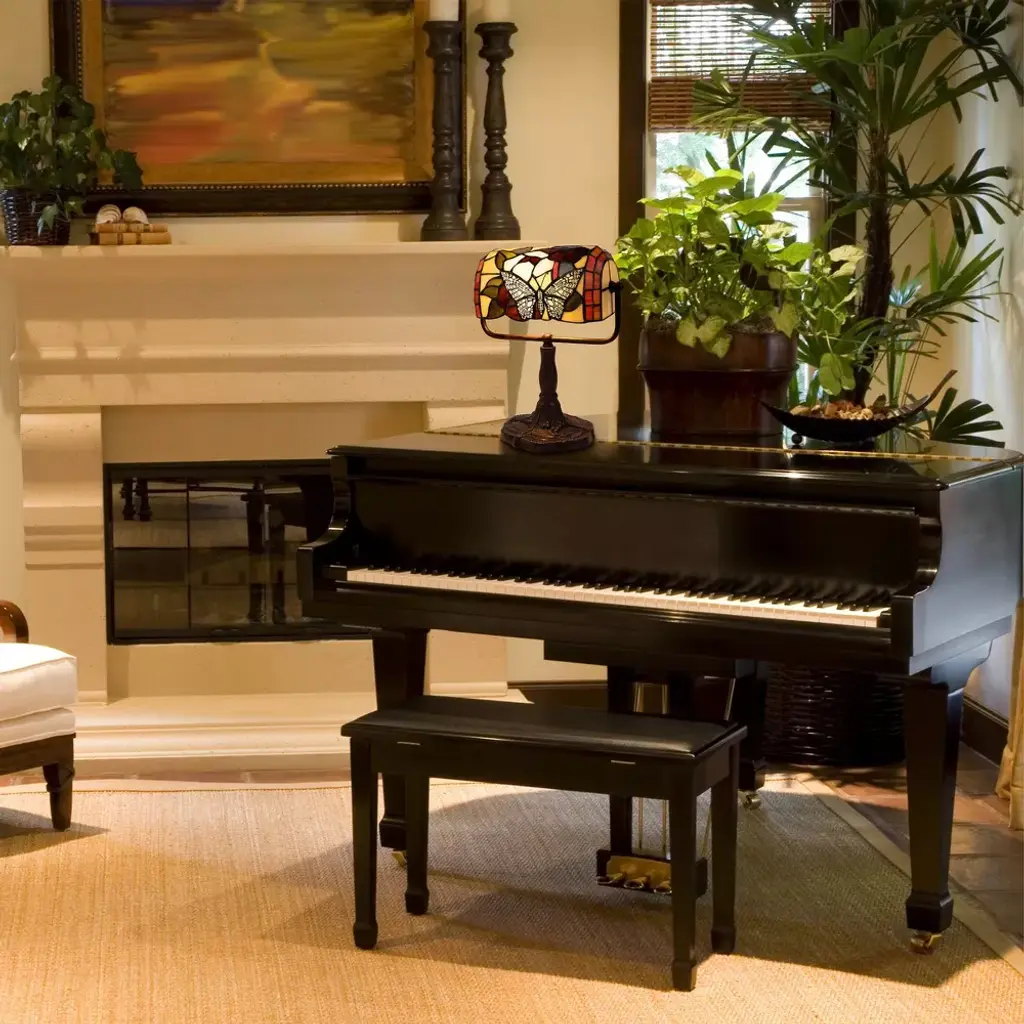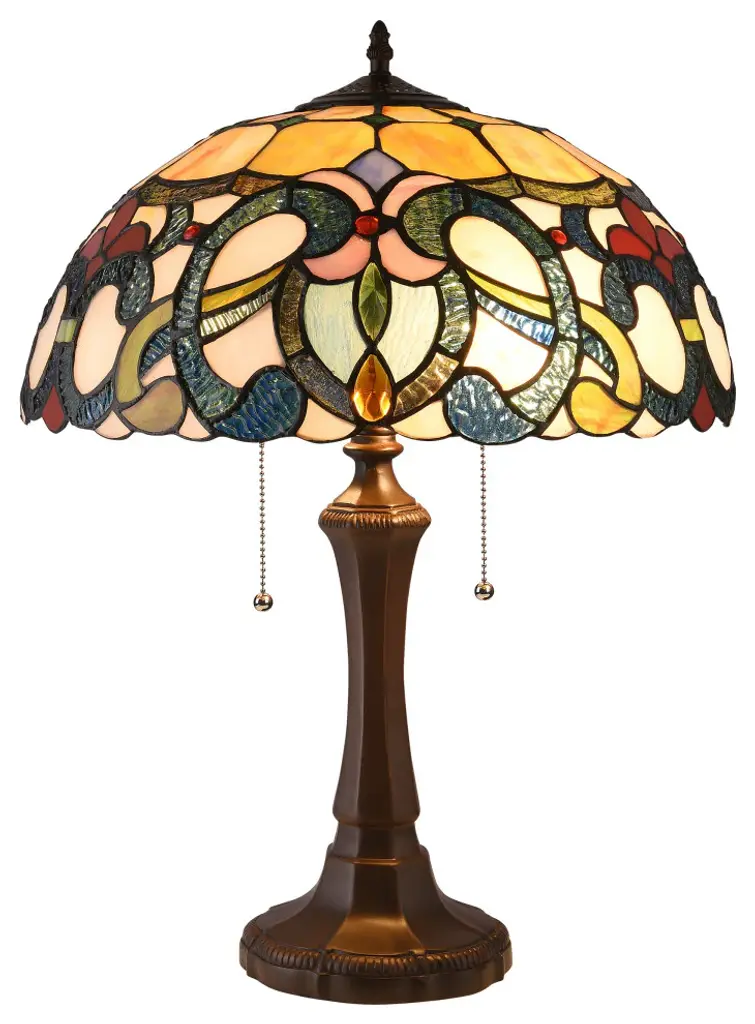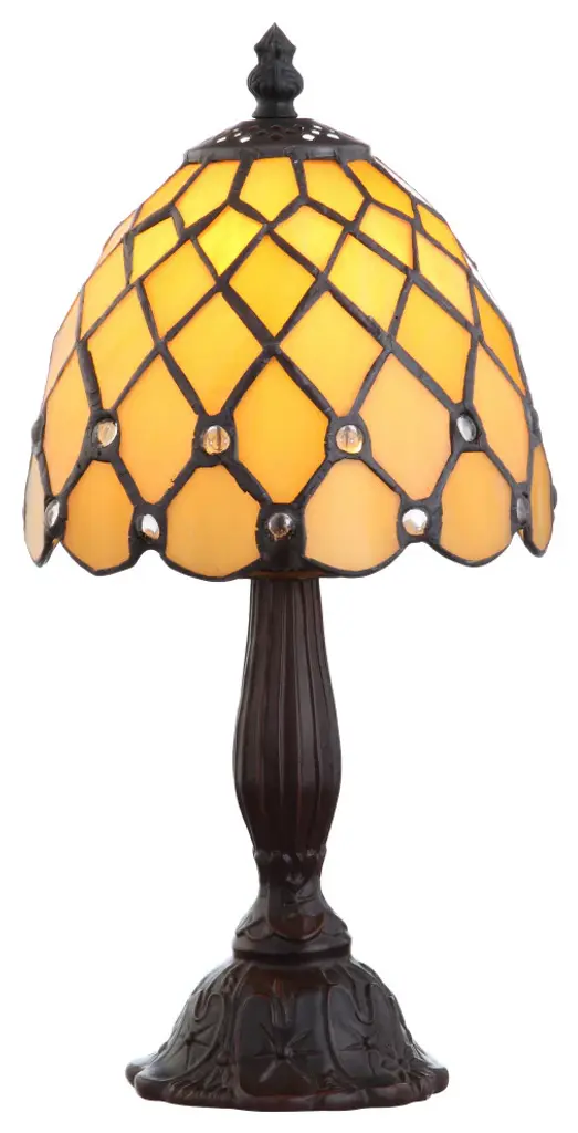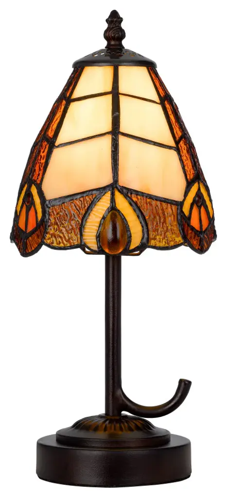 This Stained-Glass Butterfly Bankers LED Lamp from Hastings Home adds warm ambient light on a side table, desk, nightstand, end table, piano, or in an entryway. Designed with a 96-piece handcrafted stained glass shade featuring a butterfly and blooming flowers, a decorative brown metal base with dragonflies stamped into it, a swivel arm to adjust the angle of the light and a rotary on/off switch located on the cord, this lamp will complement almost any style of transitional decor. The lamp comes with an energy-efficient 4W 400 lumens elongated LED bulb that will glow for up to 25,000 hours before needing to be replaced.