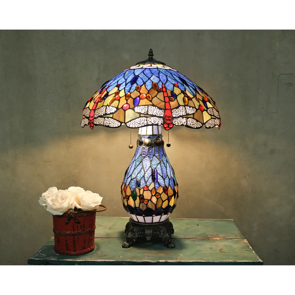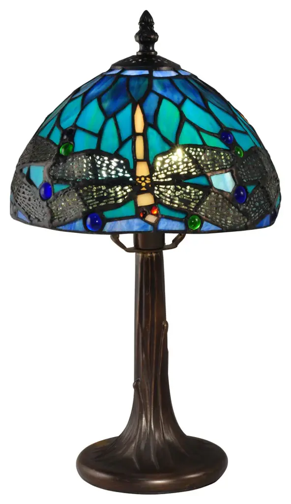 Bring statement-making beauty to your nightstand or side table with this Tiffany-style table lamp. Featuring a zinc alloy lighted base for aesthetic appeal, this table lamp has a blue dragonfly shade with jewel accents for glam charm and a dose of character. This luminary is made from stained glass for vibrancy and visual excitement.Shade contains pieces of stained glass, each hand-cut and wrapped in fine copper foilBlue dragonfly shade with jewel accentsHighlighted by hues of blue, purple, green, and amberZinc alloy lighted baseBase requires one 25-watt bulbTable lamp stands 25 inches tall x 18 inches in diameter at shade