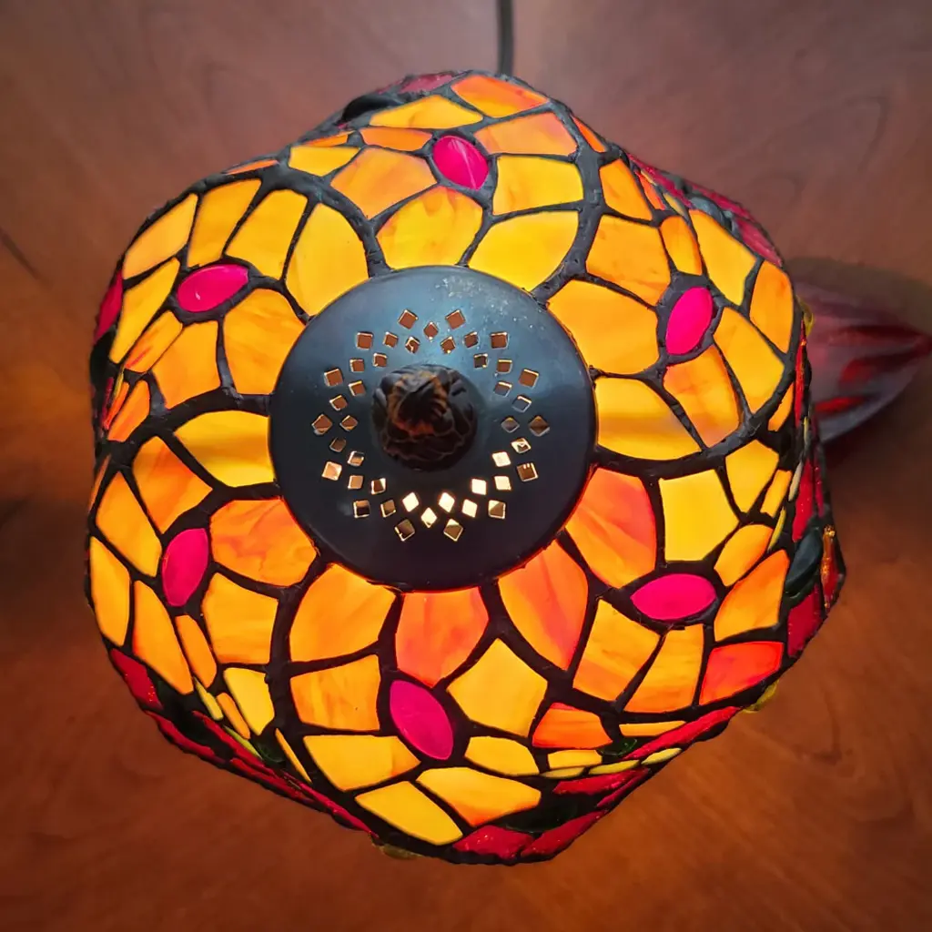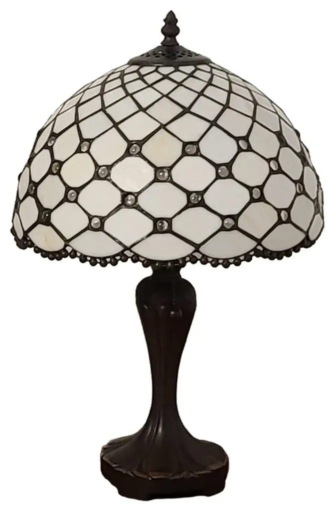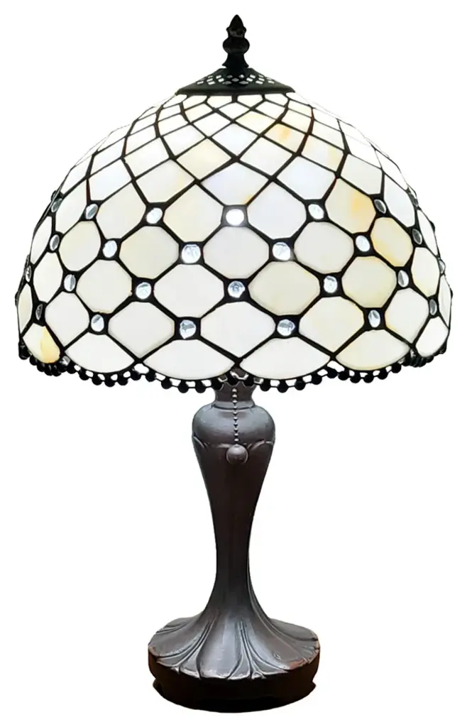 This Tiffany style lamp is hand-crafted using the same techniques that were developed by Louis Comfort Tiffany in the early 20th century. Each piece of glass is hand cut to the perfect shape and size, wrapped in copper foil, and soldered together to create a truly unique piece of art. Made with 165 pieces of hand-cut stained glass and 60 jewels. Pull chain switch for easy operation. Requires one 60W E26 medium base type A bulb (Not Included). Our lamps are fully compatible with CFL and LED bulbs. Shade colors will appear darker and less vibrant when not illuminated. The handcrafted nature of this product creates variations in color, size, and design. If buying two of the same item, slight differences should be expected. This stained-glass product has been protected with mineral oil as part of the finishing process. Please use a soft dry cloth to remove any excess oil.