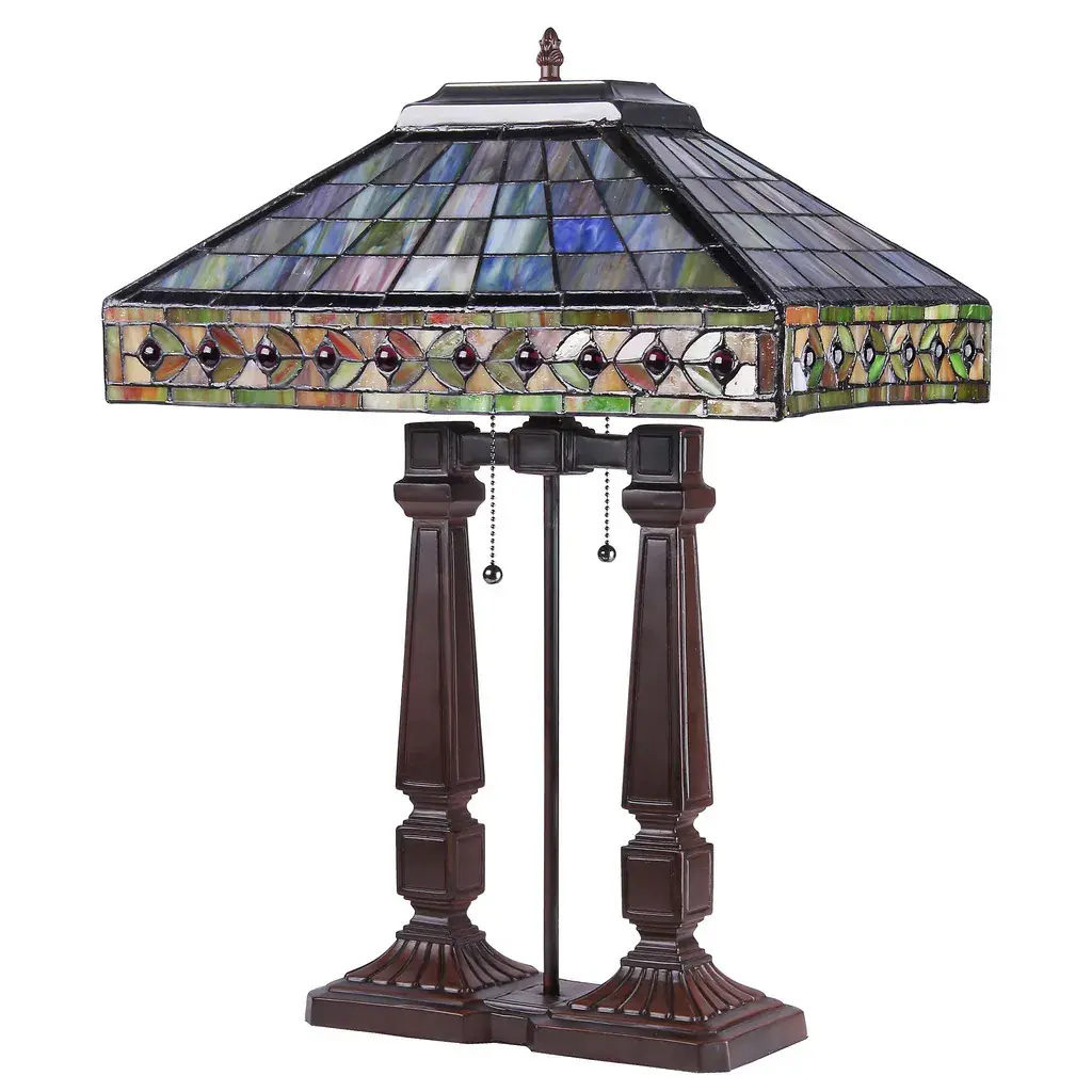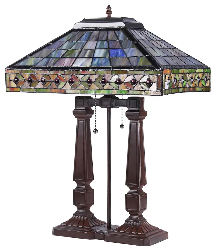 This 2-light Tiffany style Mission design table lamp features a dark bronze finish that will complement many home decors. Hand crafted from over 350 individually hand cut pieces of art glass and 32 beads that will add color and beauty to any room.Shades: Hand cut art glass featuring tones of Brown, Green, and Blue.Requires: Two (2) 100-watt medium base bulb (Not Included).Fixture Dimensions: 23.62 inches high x 17.44 inches wide x 11 inches deep.Please note: Since these are hand crafted products, the exact color and size of glass pieces may vary. Colors of the glass will appear darker and less vibrant when not illuminated. Handmade glass will vary from one piece to the other; since every piece is hand crafted, sizing may vary. Glass made at different times may also vary in color. Light bulbs used in lamps or ambient lighting may affect the appearance of the products. Stained glass has been protected with mineral oil as part of the finishing process. Please use a soft dry cloth to remove any excess oil. -All photos are taken of the same item. Multiple photos are used show what the product looks like with light on, (brighter image) and with the light off, (darker image).