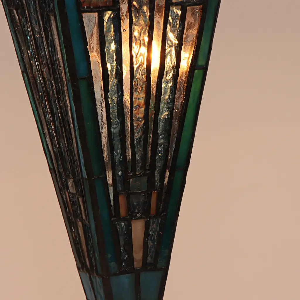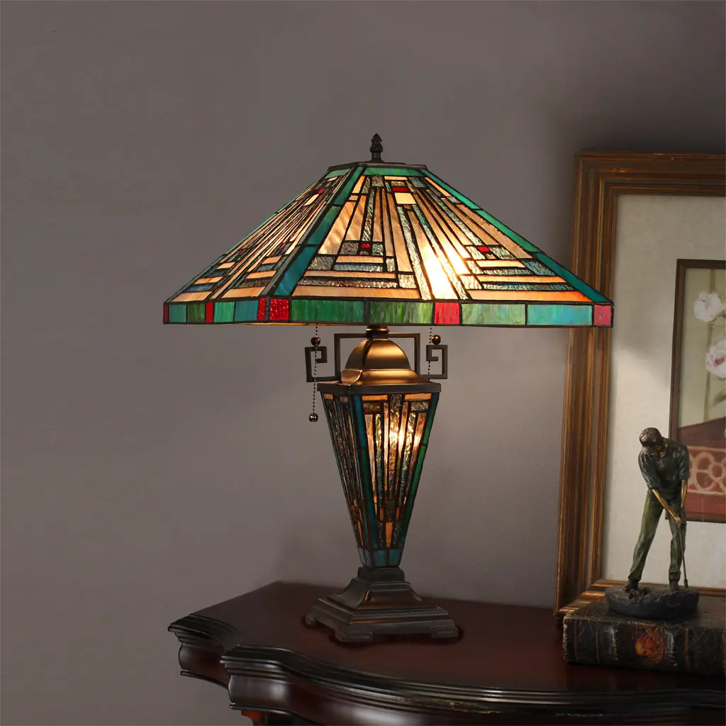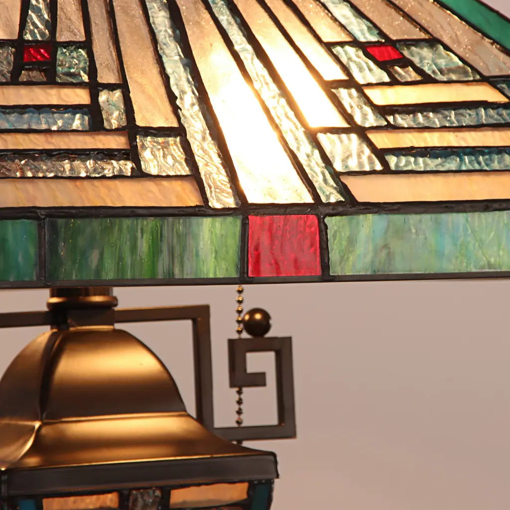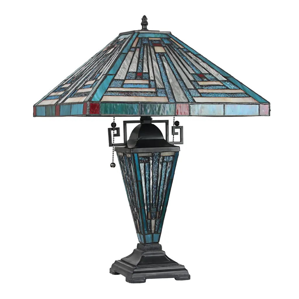 This Tiffany style, Mission design 2+1-light table lamp features a blackish bronze finish. Hand crafted from 388 individually hand cut pieces of art glass. This table lamp will add color and beauty to any room. Beautiful tones of White, Blue, and Green Art Glass. Requires: Three (3) 60 Watt Max E26 Type A bulbs (Not Included). Product Care: Wipe clean with a dry cloth. Fixture Dimensions: 22.83 inches high x 15.94 inch diameter. Since these are hand crafted products, the exact color of glass pieces may vary. Colors of the glass will appear darker and less vibrant when not illuminated. Handmade glass will vary from one piece to the other; glass made at different times will also vary. Light bulbs used in lamps or ambient lighting may affect the appearance of the products. Stained glass product has been protected with mineral oil as part of the finishing process. Please use a soft dry cloth to remove any excess oil.