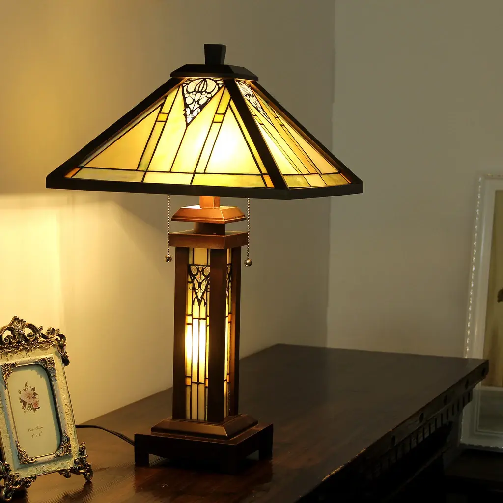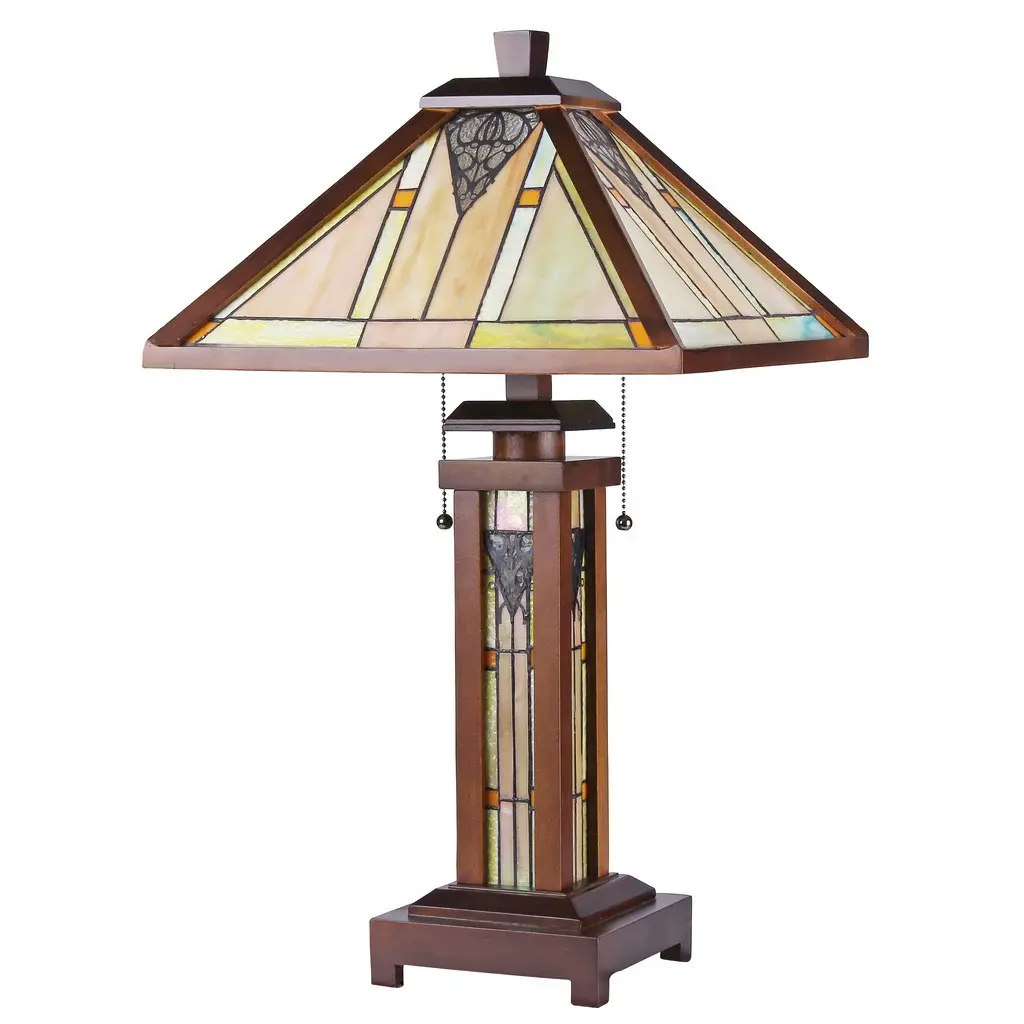 This Tiffany style Mission design double lit 2 + 1-light table lamp features a dark walnut wood finish. Hand crafted from over 145 individually hand cut pieces of art glass that will add color and beauty to any room.Shades: Hand cut art glass featuring tones of Green, Orange, and Cream.Fixture Dimensions: 25.6 inches high x 15 inch diameter.Please note: Since these are hand crafted products, the exact color and size of glass pieces may vary. Colors of the glass will appear darker and less vibrant when not illuminated. Handmade glass will vary from one piece to the other; since every piece is hand crafted, sizing may vary. Glass made at different times may also vary in color. Light bulbs used in lamps or ambient lighting may affect the appearance of the products. Stained glass has been protected with mineral oil as part of the finishing process. Please use a soft dry cloth to remove any excess oil. -All photos are taken of the same item. Multiple photos are used show what the product looks like with light on, (brighter image) and with the light off, (darker image).