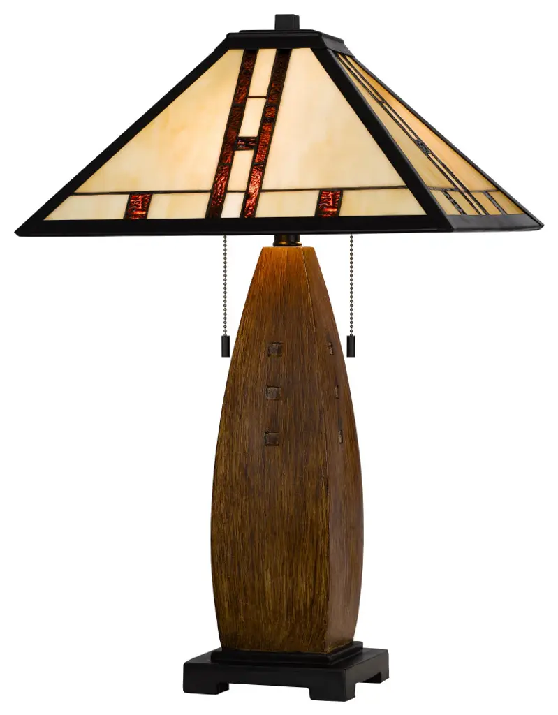 Illuminate your home exquisitely with this stunning Tiffany Style Mission Double Lit 2+1-light Dark Bronze Table Lamp. With over 100 hand-cut pieces of art glass in tones of beige and amber, this lamp is double lit between the base and shade, creating a warm and inviting atmosphere. The elegant design features geometric shapes in rich colors, adding a touch of sophistication to any room.Features: