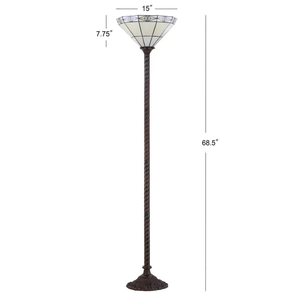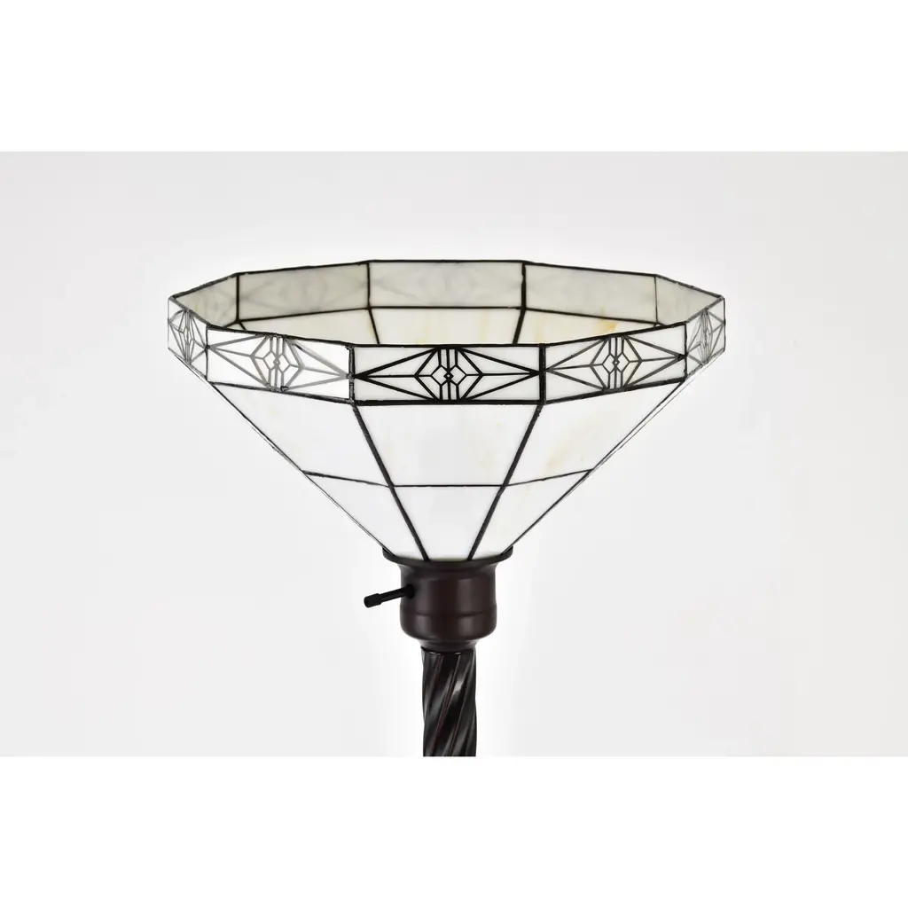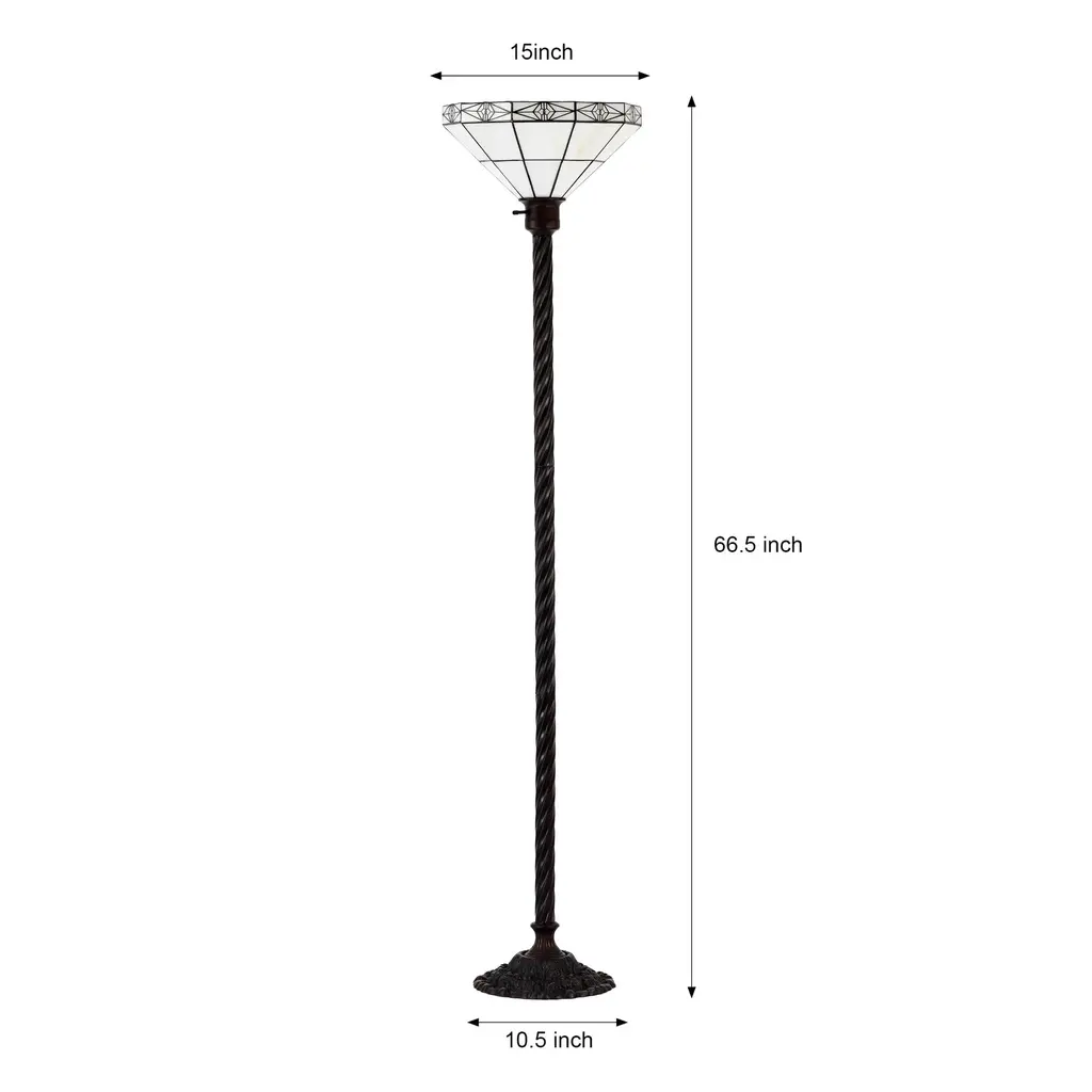Add a touch of traditional elegance to your Mission-inspired decor with this exquisite Tiffany-style torchiere floor lamp. Featuring a white Mission-style shade made of small hand-cut pieces of stained glass wrapped in copper foil, this lamp creates a warm and inviting glow by sending illumination upwards. The sturdy metal base with a rich bronzed finish ensures stability on any surface.Features: