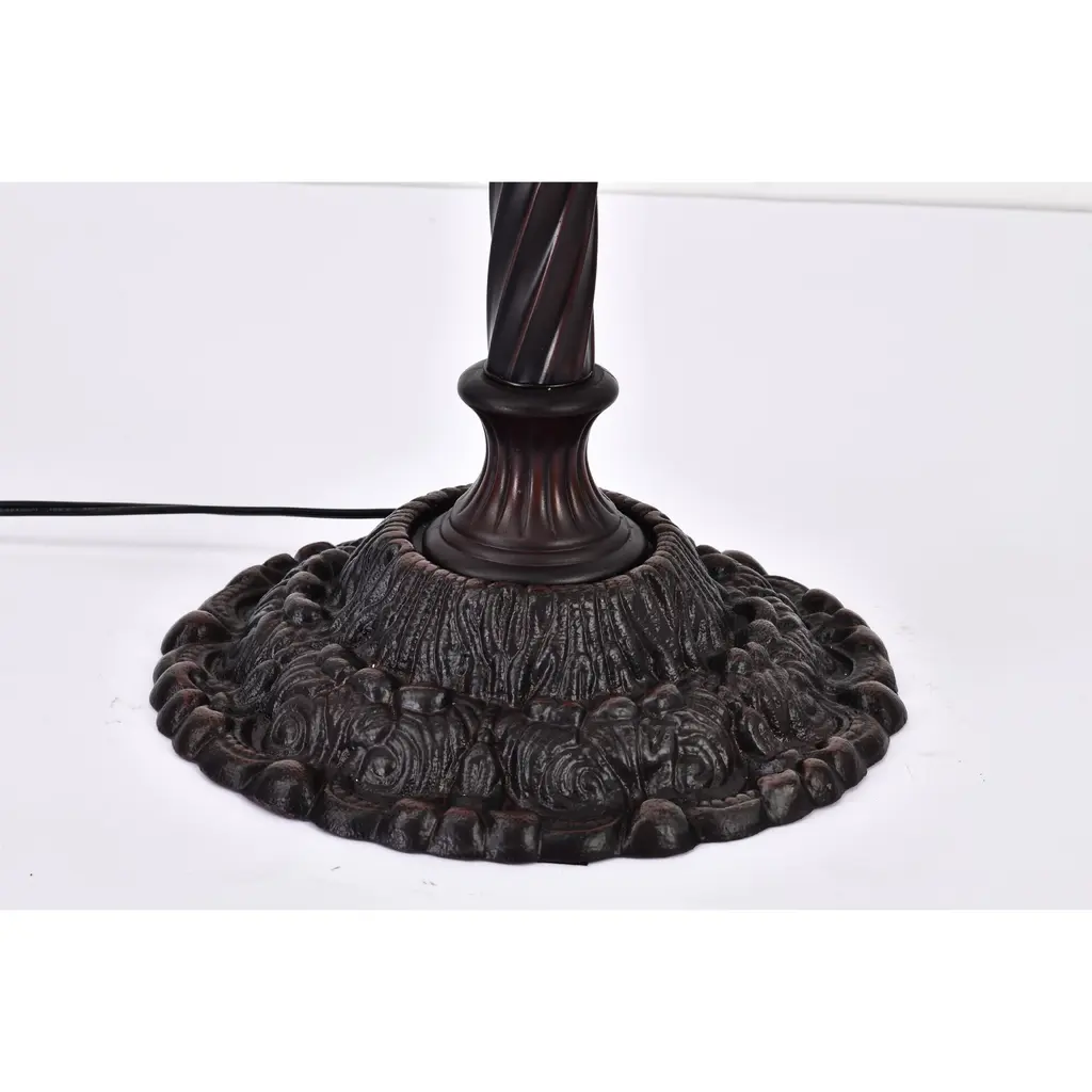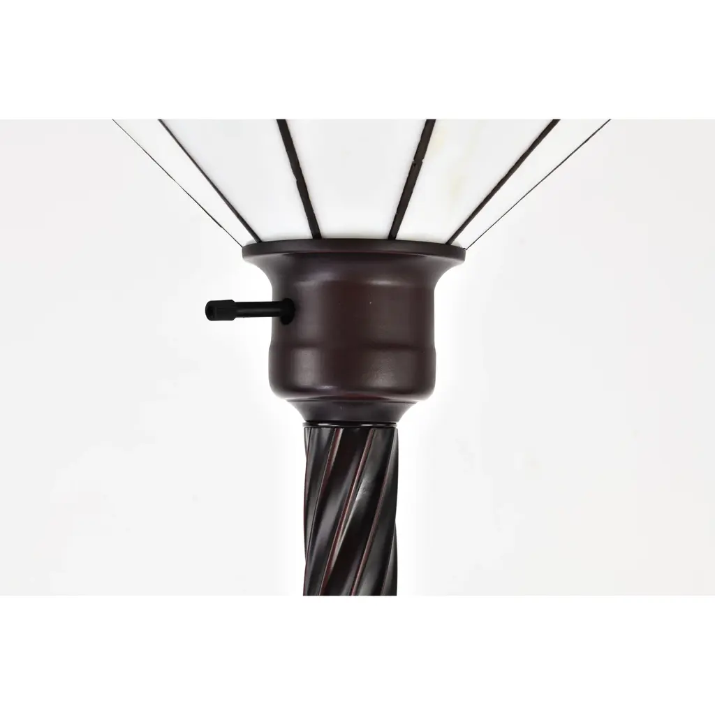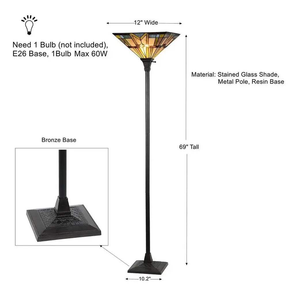 Add a touch of traditional elegance to your Mission-inspired decor with this exquisite Tiffany-style torchiere floor lamp. Featuring a white Mission-style shade made of small hand-cut pieces of stained glass wrapped in copper foil, this lamp creates a warm and inviting glow by sending illumination upwards. The sturdy metal base with a rich bronzed finish ensures stability on any surface.Features: