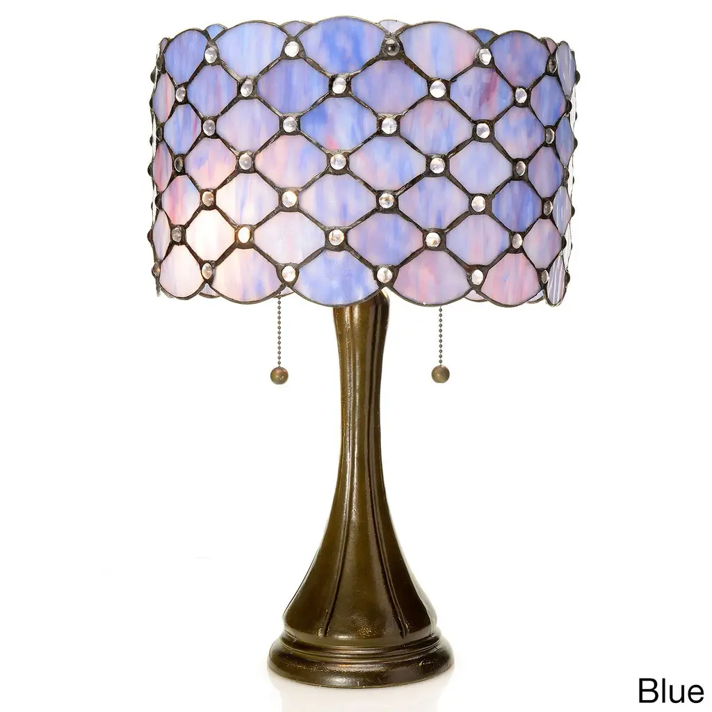 Cast a soft glow in your room with this Tiffany-style table lamp. The hand-cut pieces of stained glass come together to create a stunning shade, and the bronze accents lend vintage appeal to this piece. Two pull chains let you control each light separately for customized illumination.This lamp is handcrafted using techniques developed by Louis Comfort Tiffany in the early 1900sThe shade of this lamp contains hand-cut pieces of stained glass, each wrapped in fine copper foilThe bronze finish on the base adds to the elegance of the neutral hues in the shade to provide elegance and functionSetting: IndoorFixture finish: BronzeShades: Tiffany-style cut glass in a round shade design; available in blue, orange, red, and whiteNumber of lights: OneRequired number of bulbs and wattage: Two 60-watt bulbsHow do you turn it on: Pull chainDimensions: 22 inches high x 16 inches diameter