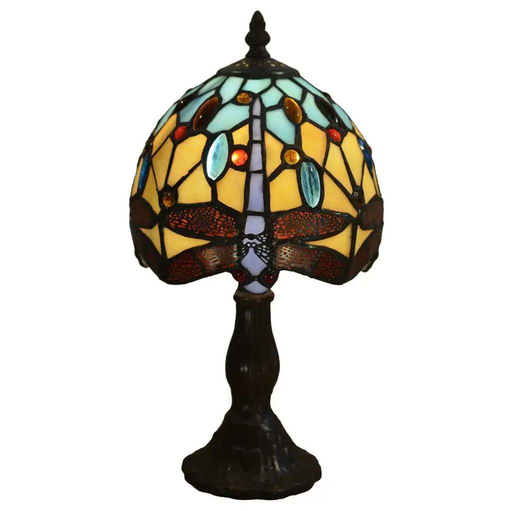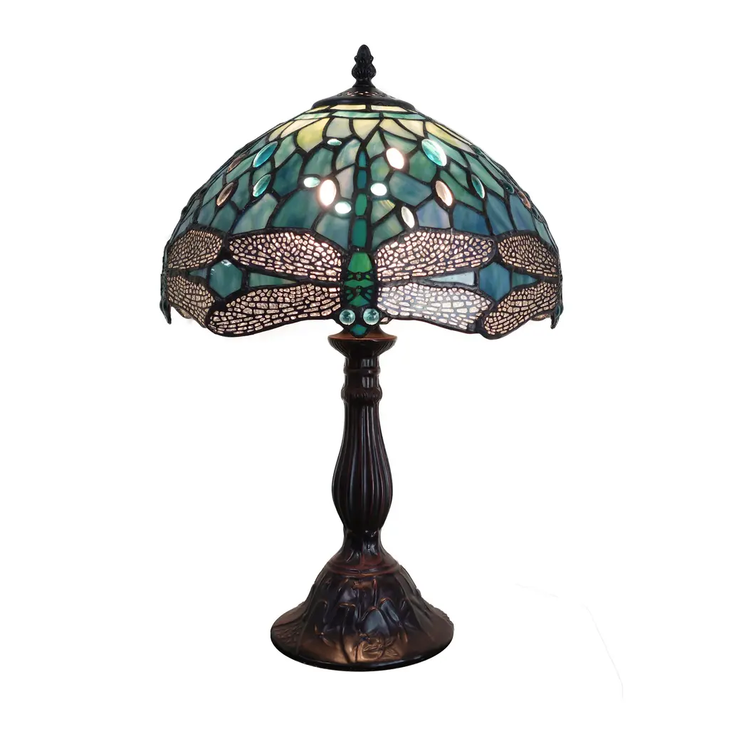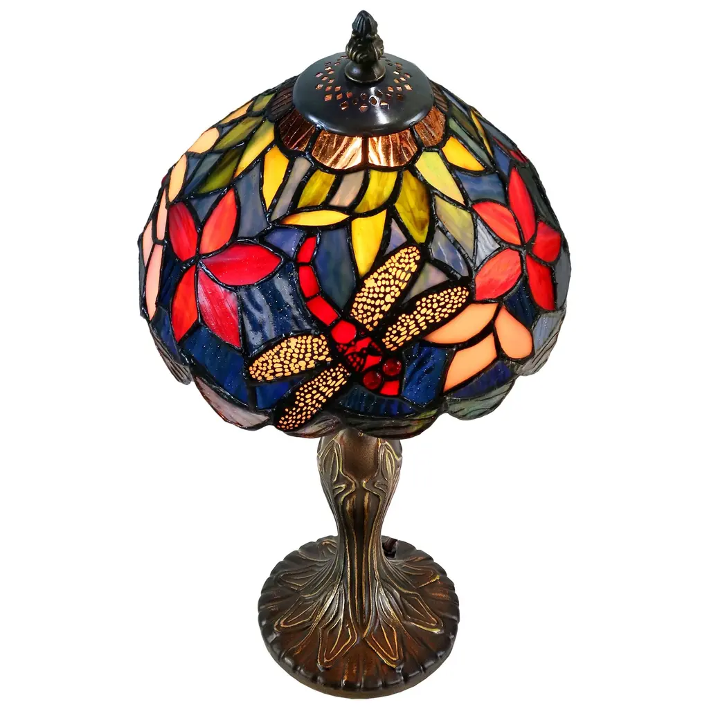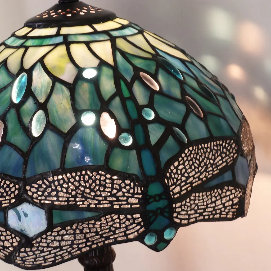 The table lamp exudes timeless elegance with its Tiffany-style stained glass shade, which showcases a mesmerizing dragonfly design. Crafted with meticulous attention to detail, the stained glass panels are a mosaic of rich, jewel-toned hues that create a warm and inviting ambiance when illuminated. Embedded crystals glisten like precious gems, adding a touch of opulence to the lamp's overall aesthetic. The lamp is gracefully supported by a classic metal stand, combining artistry and functionality to make it a striking addition to any room.Features:Dimensions: