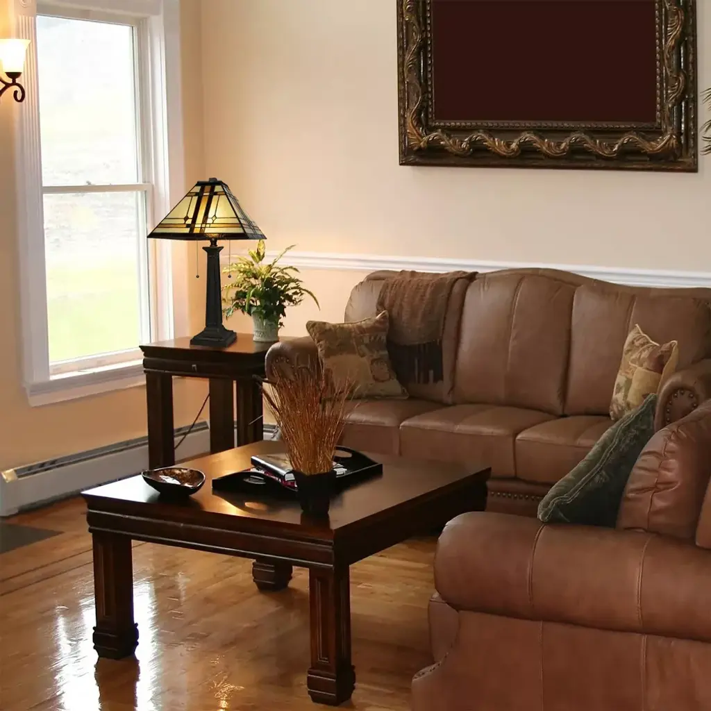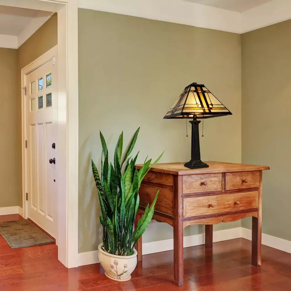 Add the timeless beauty of a classic décor accent to any room with the Tiffany-Style Mission Table Lamp by Hastings Home. The pyramid lamp shade is handcrafted from 172 stained glass pieces that are individually applied to make each light unique. When the LED lamp is lit up the colors will appear brighter, and when it is turned off the color will appear darker and more subdued. The sturdy UL-listed light features convenient dual sockets with on/off pull chains and comes with 2 energy-saving LED E26 type lightbulbs. This vintage-style art glass lamp is sure to provide a graceful diffusion of light, creating a warm ambient glow that makes it the perfect accent for a side table or desk in your entryway, bedroom, living room, or office.