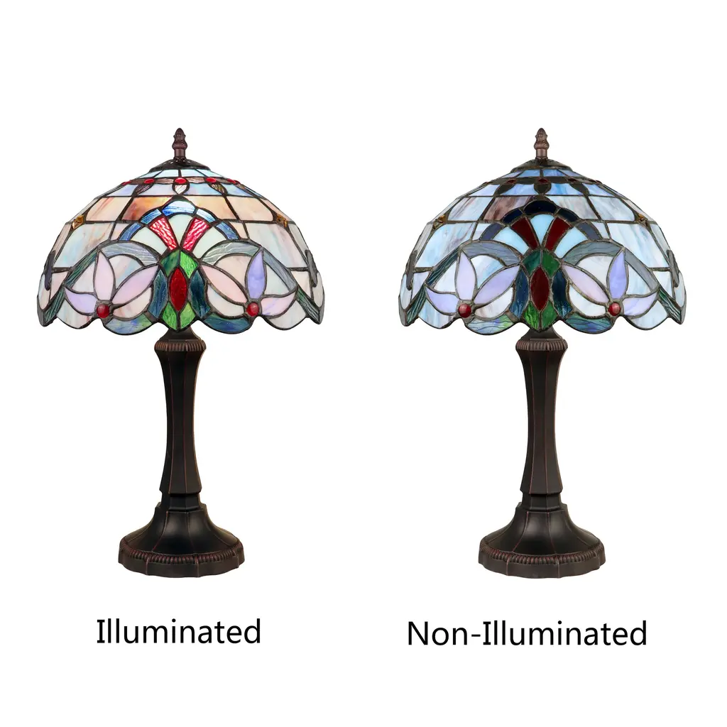 This is a Victorian design, Tiffany-style table lamp that would be a perfect fit in a bedroom, office and living room! The shade is hand-crafted, using the same methods developed by Louis Comfort Tiffany in the early 1900's. This process entails using 133 hand cut stained art glass pieces and 27 glass beads, each wrapped in fine copper foil and soldered together at extremely high temperatures to form each unique piece. Exact size to the nearest inch may vary, and exact color of each glass piece may vary due to each piece being hand crafted. Dry listed and recommended for an indoor setting. Beautiful tones of Blue, Green , and Red Art Glass. Handcrafted from 133 pieces of Art Glass and 27 Glass Beads. Requires: 60 Watt max E26 Type A bulb (Not Included). Product Care: Wipe clean with a dry cloth. Fixture Dimensions:18.1 inches high x 12 inch diameter. Since these are hand crafted products, the exact color of glass pieces may vary. Colors of the glass will appear darker and less vibrant when not illuminated. Handmade glass will vary from one piece to the other; glass made at different times will also vary. Light bulbs used in lamps or ambient lighting may affect the appearance of the products. Stained glass product has been protected with mineral oil as part of the finishing process. Please use a soft dry cloth to remove any excess oil.