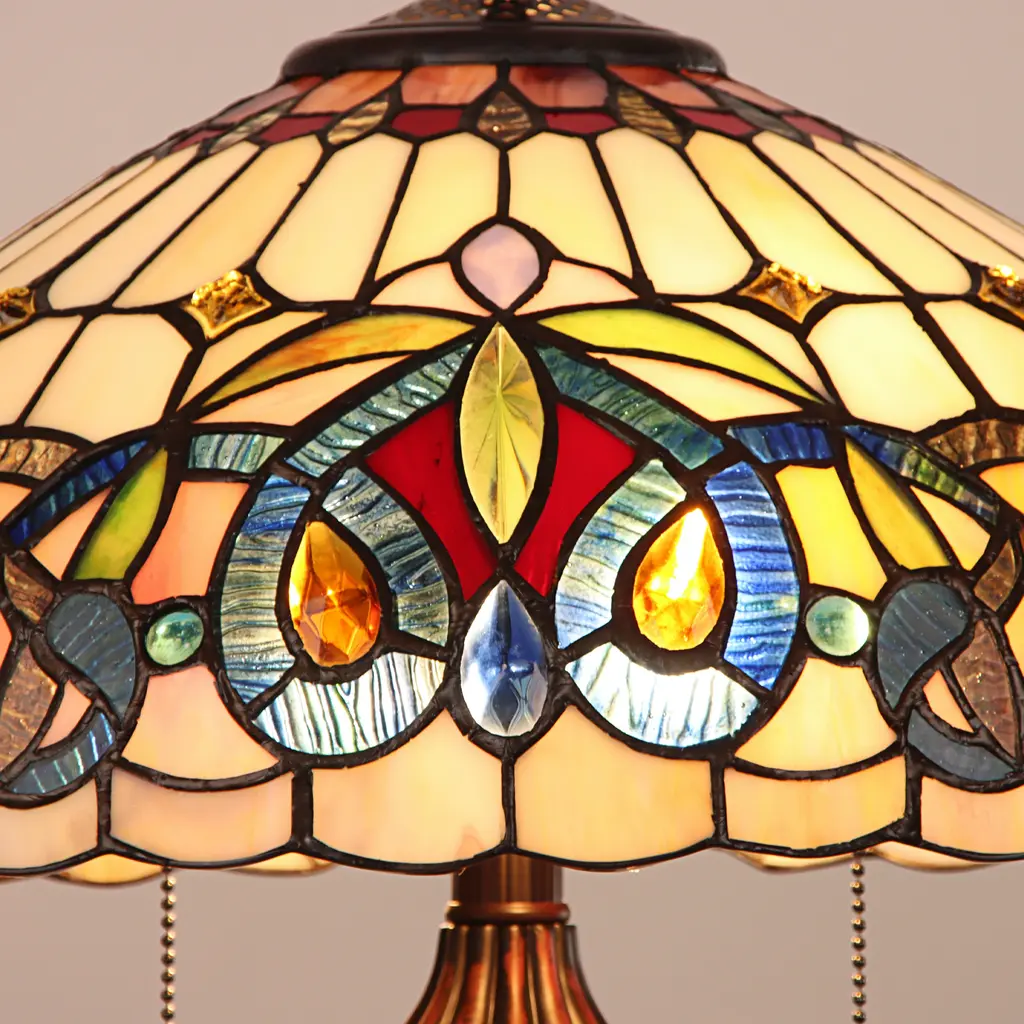 This Tiffany style, Victorian design 2-light table lamp features a dark bronze finish. Hand crafted from 330 individually hand cut pieces of art glass, 6 glass beads, and 36 crystals. This table lamp will add color and beauty to any room. Beautiful tones of White, Blue, and Green Art Glass. Requires: Two (2) 100 Watt Max E26 Type A bulbs (Not Included). Product Care: Wipe clean with a dry cloth. Fixture Dimensions: 22.05 inches high x 15.75 inch diameter. Since these are hand crafted products, the exact color of glass pieces may vary. Colors of the glass will appear darker and less vibrant when not illuminated. Handmade glass will vary from one piece to the other; glass made at different times will also vary. Light bulbs used in lamps or ambient lighting may affect the appearance of the products. Stained glass product has been protected with mineral oil as part of the finishing process. Please use a soft dry cloth to remove any excess oil.