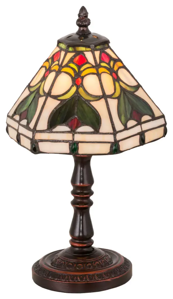 This geometric design of this Charlyn table lamp features white, red, ember stain glass and jewels around the rim. This lamp was handcrafted using the same techniques that were developed by Louis Comfort Tiffany in the early 1900s. Setting: Indoor Fixture finish: Bronze Shades: 118 pieces of stained glass and each hand-cut and wrapped in fine copper foil Inline switch Number of lights: 1 Requires one (1) 60 watt incandescent bulb (not included) Dimensions: 14 inches high x 7 inches in diameter at shadeAttention California residents: This product contains lead, a chemical known to the state of California to cause cancer and birth defects or other reproductive harm. Note: Shade colors will appear darker and less vibrant when not illuminated.The handcrafted nature of this product creates variations in color, size and design. If buying two of the same item, slight differences should be expected.