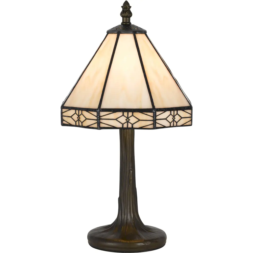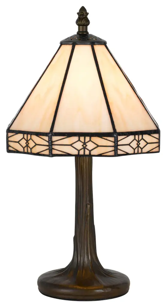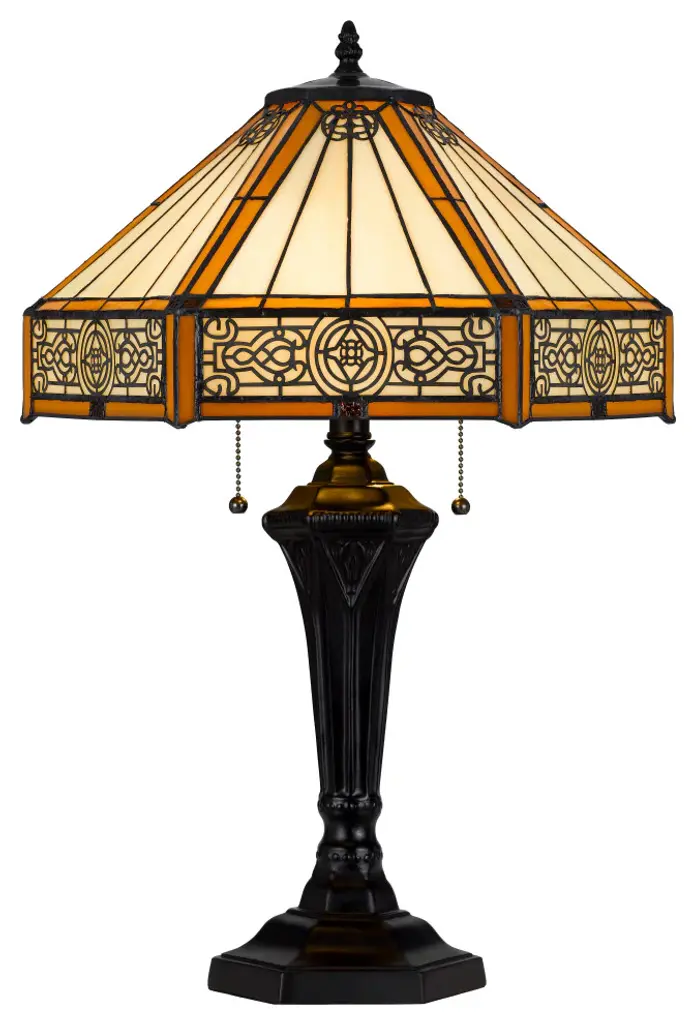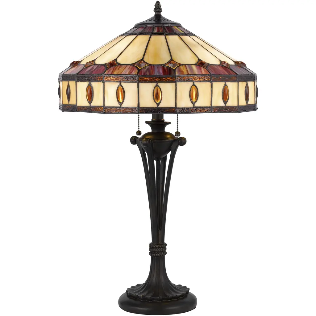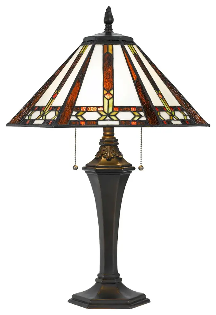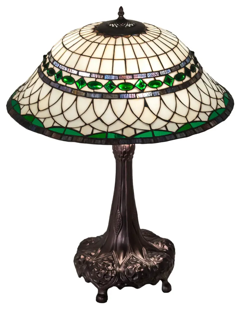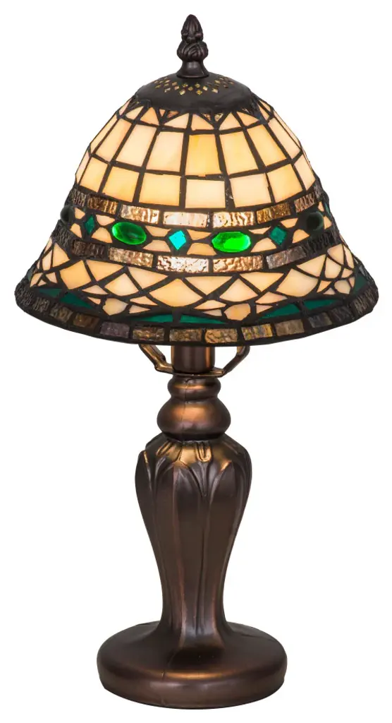 Create a distinct focal feature on your console or side table with this Tiffany-style table lamp crafted from 234 copper foil-wrapped glass pieces. The decorative, copper-finished base beautifully complements the brown and white shade, and the cabochone gemstone embellishment adds a touch of glam for extra visual appeal.Lamp is handcrafted using the Tiffany-style techniques234 hand-cut pieces of white stained glass hand-wrapped in copper foil27 cabochons add a bejeweled finishing touchRequires one 60-watt light bulb (not included)In-line switch offers effortless operationLamp measures 18 inches high x 12 inches in diameter at the shade