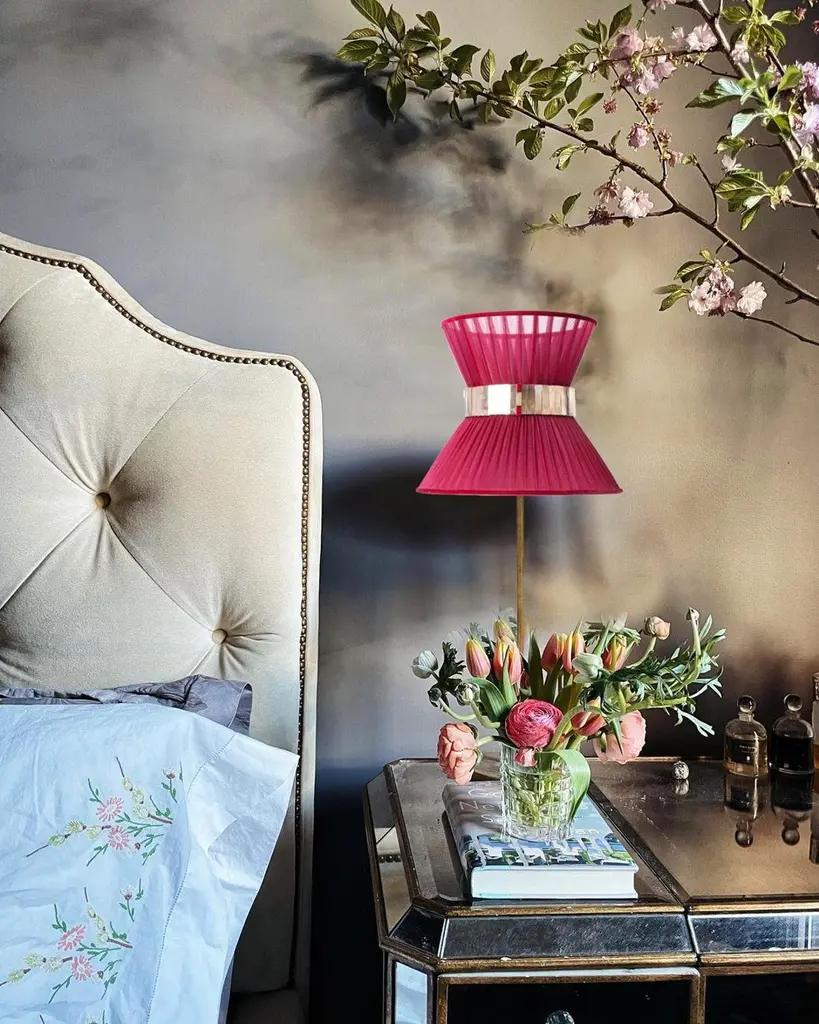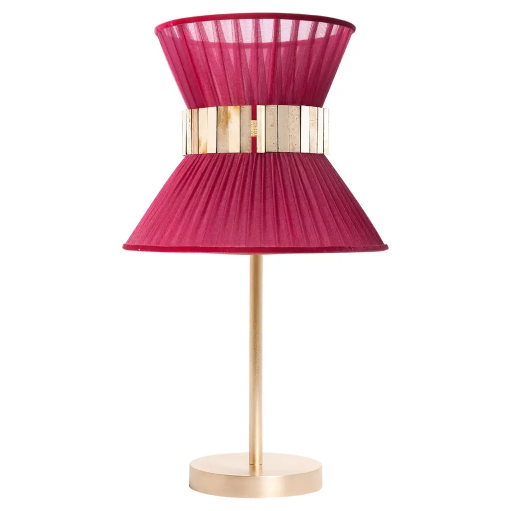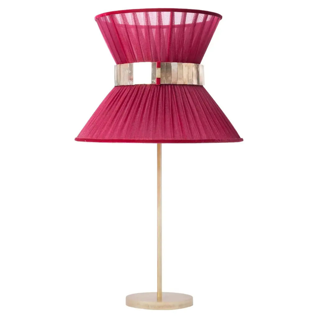 “Tiffany” Table Lamp 30 Ruby Silk, Antiqued Brass, Silvered Glass