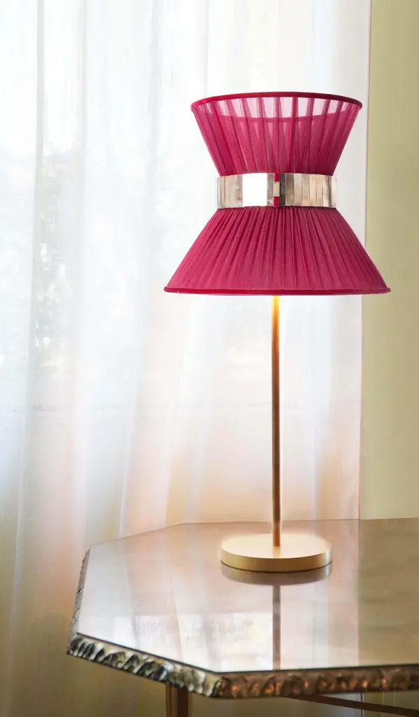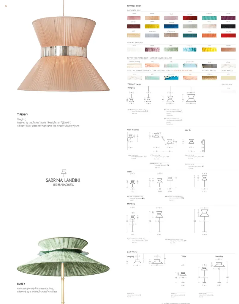 TIFFANY The first one, Audrey inspired the iconicIntroducing Sabrina's breathtaking collection of Tiffany lamps.Year after year Sabrina Landini perpetuates its exceptional expertise, offering much more than a lamp – a touch of originality.Nearly 25 years ago, the first Tiffany lamps were crafted in Sabrina Landini' s workshop, just a stone's throw away from the Milano Navigli. At the House we believe in once-in-a-lifetime Tiffany, the iconic.With its delicate interplay of materials and lines, Tiffany celebrates the art of dazzling and brightening the lives of those you love.The eye-catching glass belt, secretly performed in our Atelier, the variety of silk’ colors and the smooth brass finish, confer uniqueness and natural charme.The perfect balance of allure and sophistication to enrich all kinds of interiors.CE certified and Electrified : US, EU, UK, dimmableAvailable in the lampshade diameter : 23, 30, 40, 60, 80 cm
