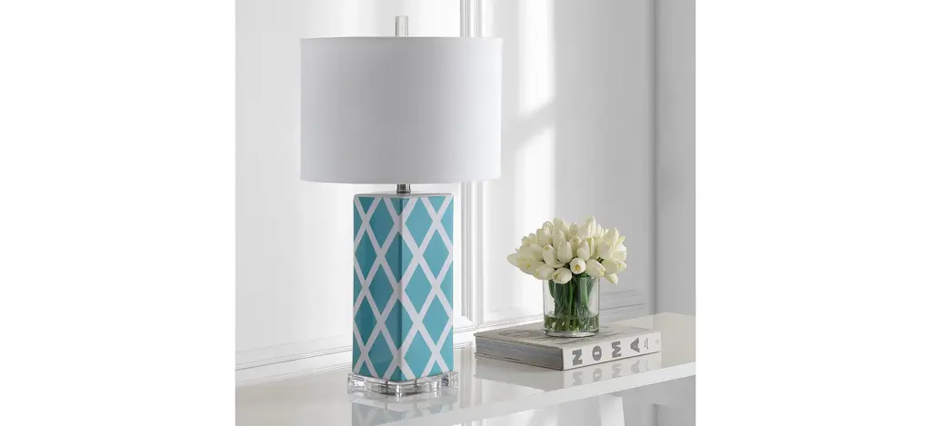 Forever plaid takes on new meaning with the Tig Lattice Table Lamp by Safavieh. Crafted of light blue and white ceramic with acrylic base and a silver neck, this graphic windowpane design is topped with a contemporary off white cotton hardback drum shade.