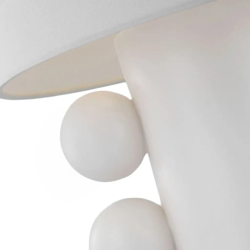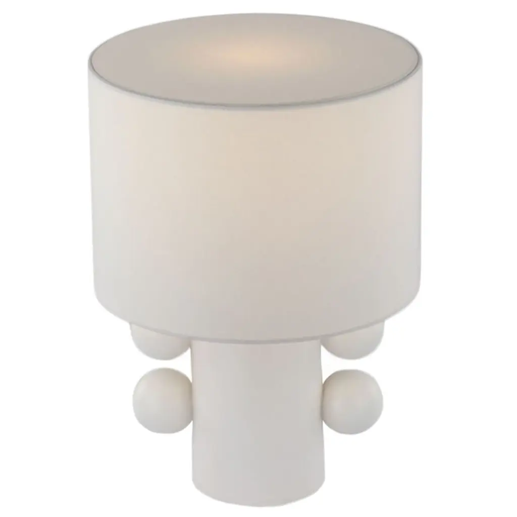 Influenced by the Memphis Design style, the Tiglia Table Lamp is defined by its use of cylindrical bases with repetitive spherical embellishments on the sides. The linen drum shades overlap the bases to create a single, cohesive silhouette in neutral finishes. These creative lamps will add a contemporary accent to bedside tables, credenzas, and countertops alike.
