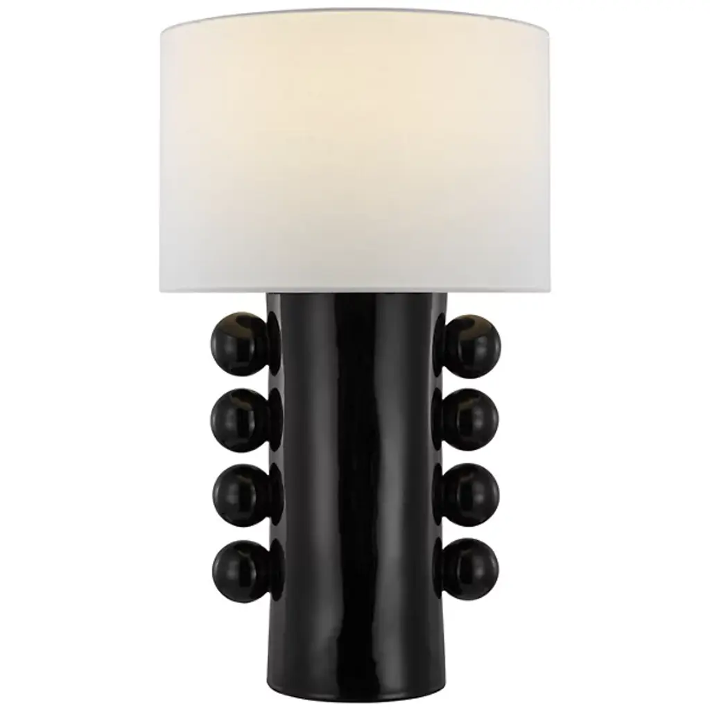 The Tiglia Tall Cordless LED Table Lamp by Visual Comfort Signature, designed by Kelly Wearstler, brings artful sophistication to any room with its striking ceramic base adorned with decorative spheres. This cordless lamp offers the convenience of LED technology, casting a warm, ambient glow without unsightly cords. Its transitional style effortlessly complements both modern and classic interiors, making it a versatile addition. With its sculptural design and functional elegance, this lamp is a statement piece that enhances any decor.