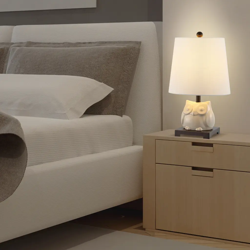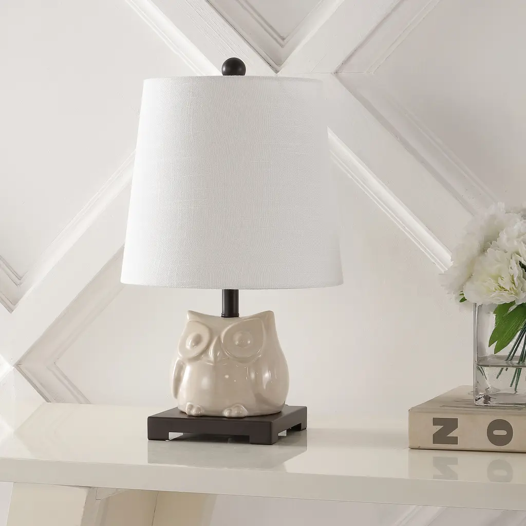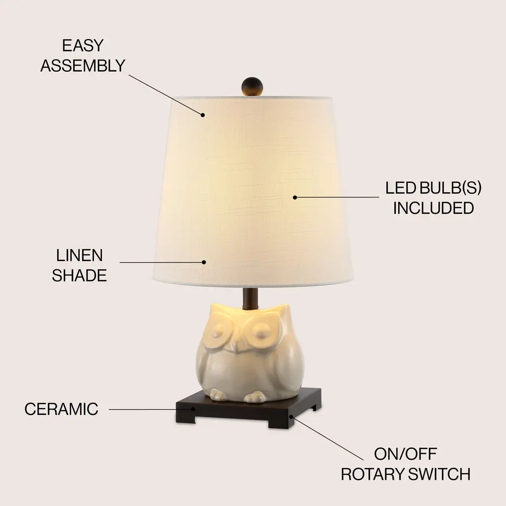 Add a whimsical touch to your space with this Tiki 16" Ceramic Mini LED Table Lamp by JONATHAN Y. The blue and white ceramic owl base offers a fun and classic look, while the white hardback cotton shade complements any color scheme. With an eco-friendly 4W LED bulb included, this lamp is not only stylish but also environmentally conscious. The lamp is UL listed and features an on-off switch on the socket for convenience.Features:Dimensions:About Us: