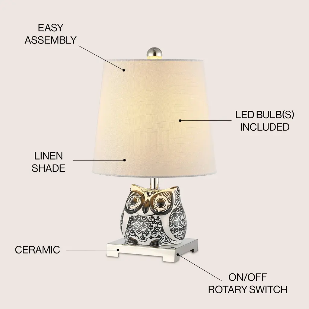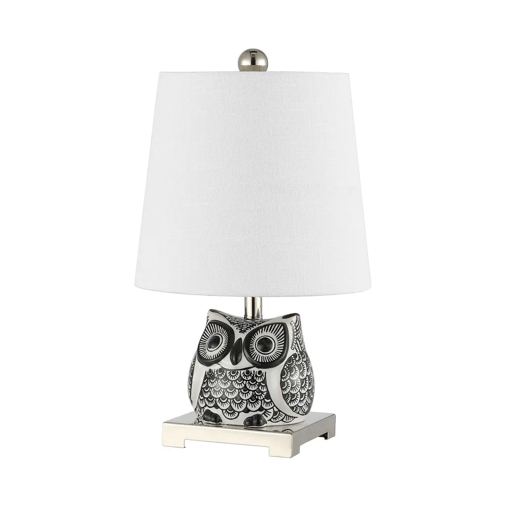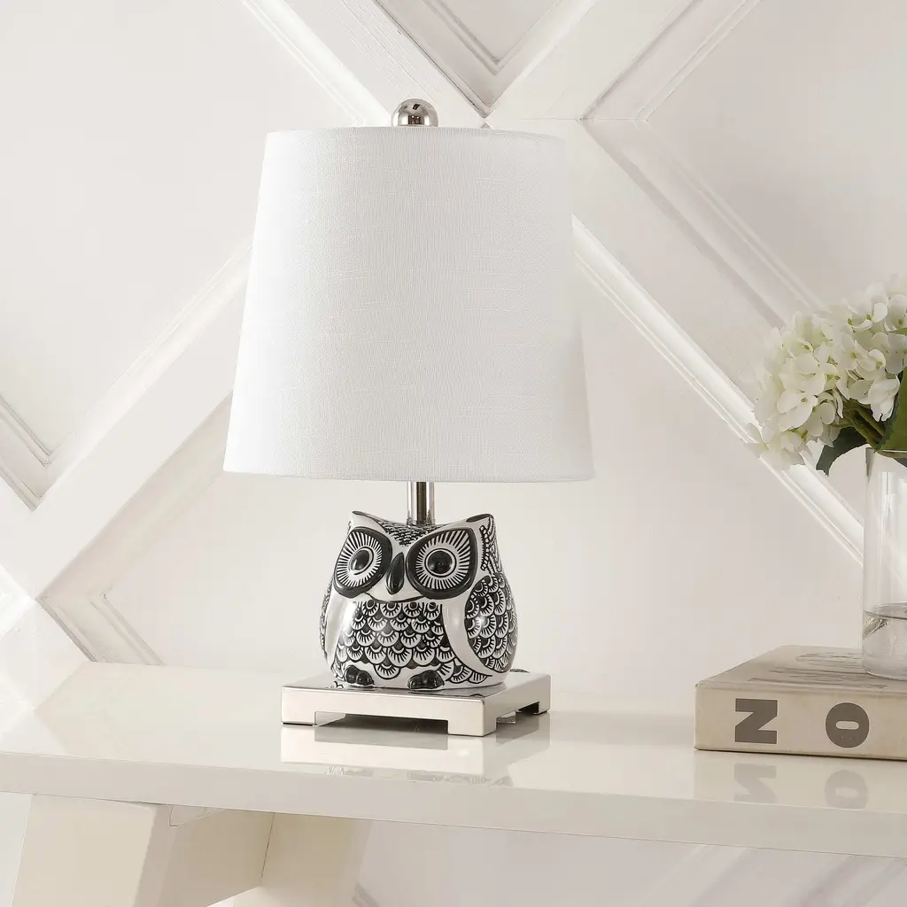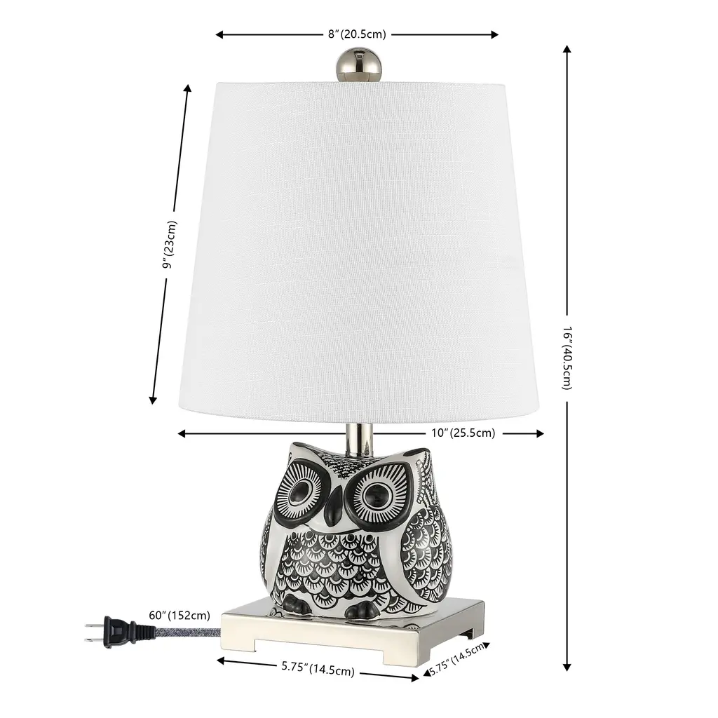 Add a whimsical touch to your space with this Tiki 16" Ceramic Mini LED Table Lamp by JONATHAN Y. The blue and white ceramic owl base offers a fun and classic look, while the white hardback cotton shade complements any color scheme. With an eco-friendly 4W LED bulb included, this lamp is not only stylish but also environmentally conscious. The lamp is UL listed and features an on-off switch on the socket for convenience.Features:Dimensions:About Us: