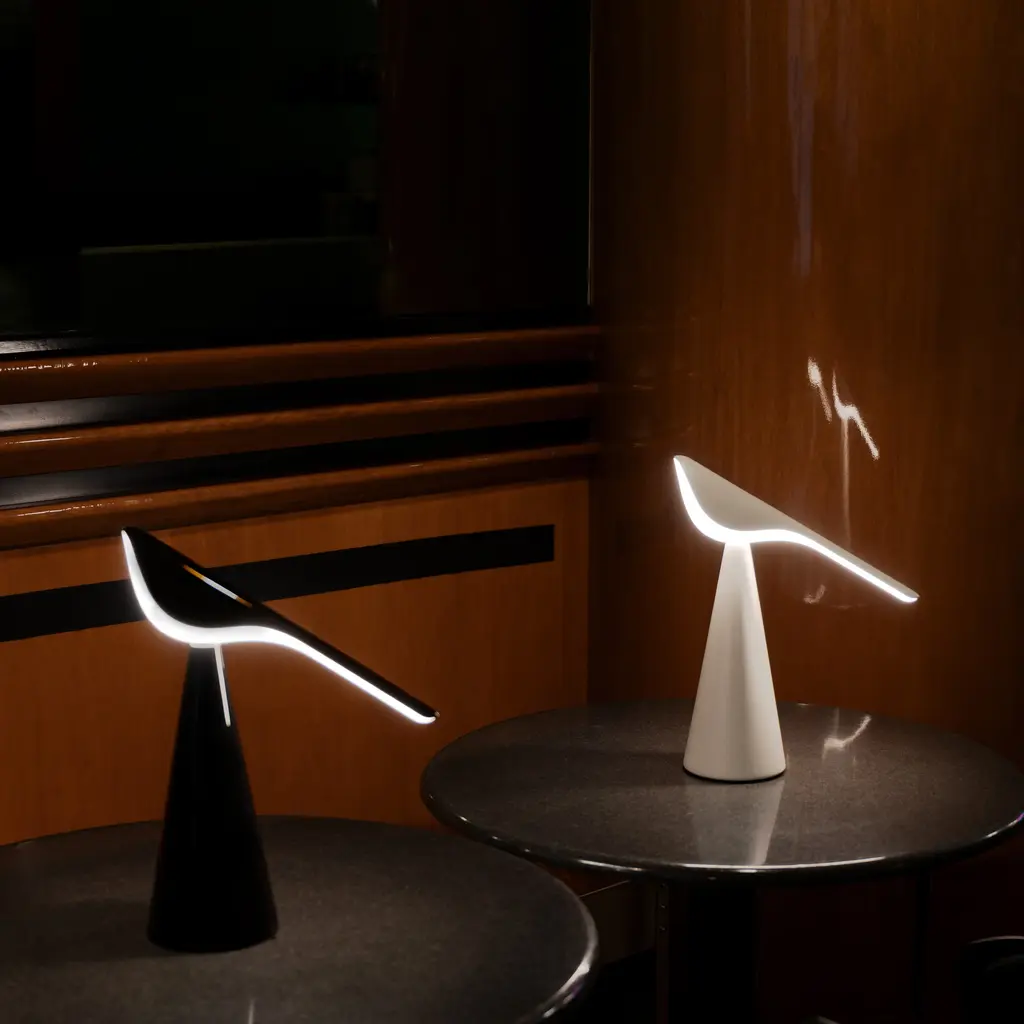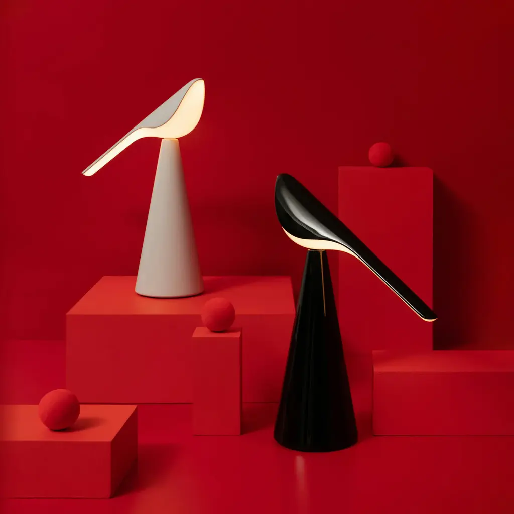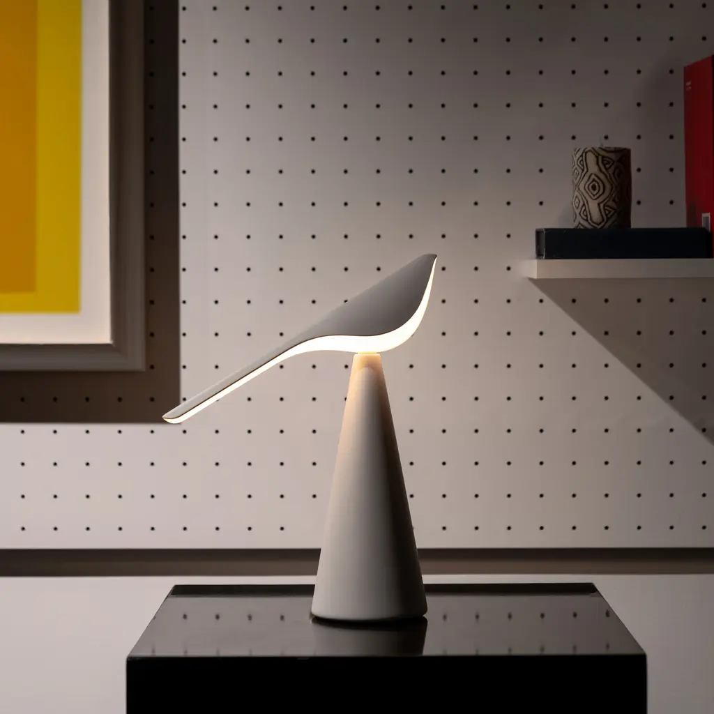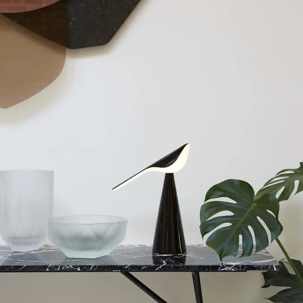Nao Tamura changes up the prevailing conversation about lighting design with her own abstracted naturalism. Designed to sit in clusters and to form a “flock,” Tiki is a delicate bird-like presence that seems nearly animated. Ironically, this table lamp is created with a hi-tech process as the flawlessly clear acrylic is robotically carved to achieve its singular form.
