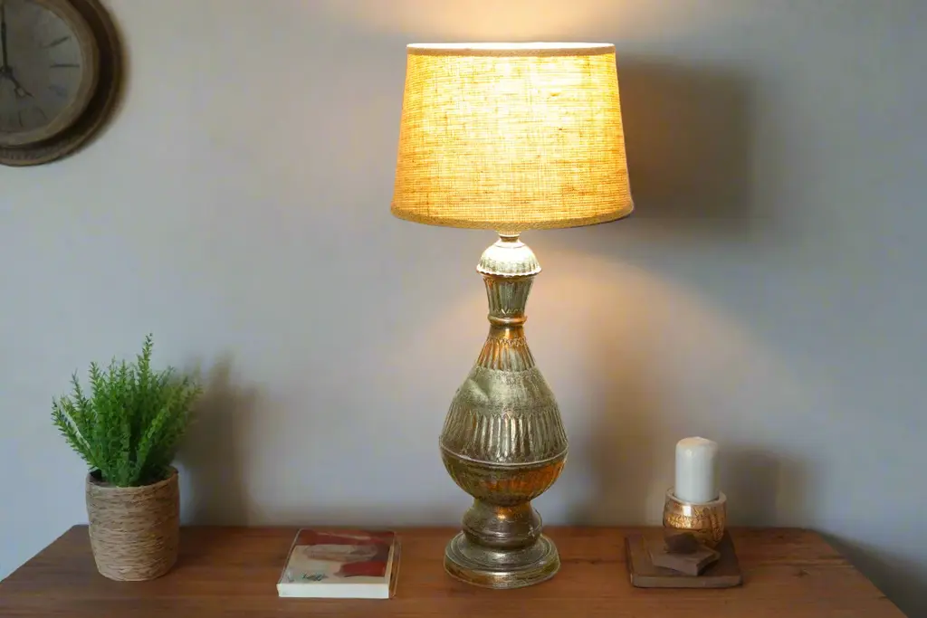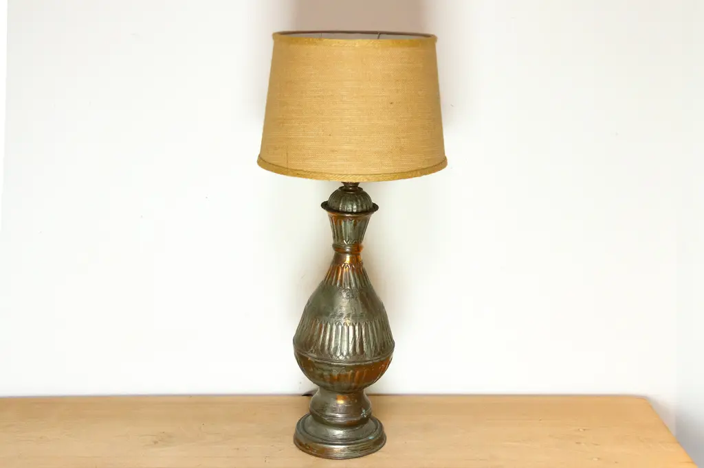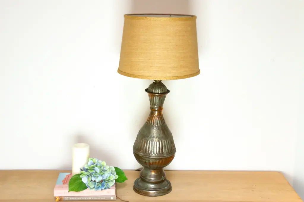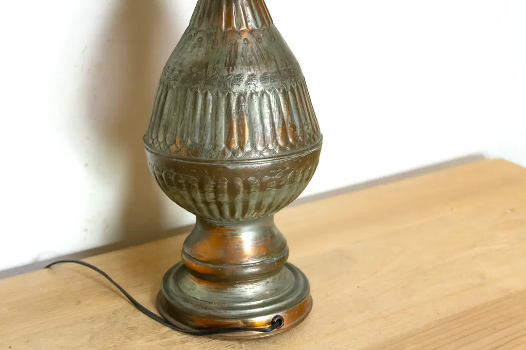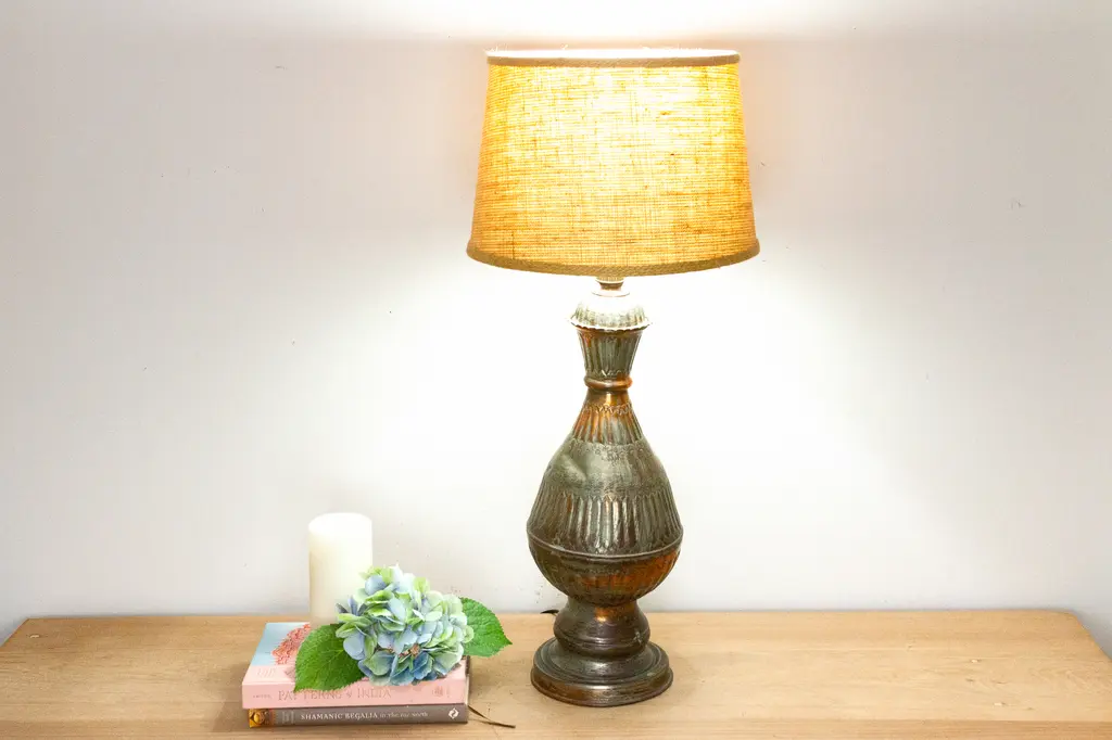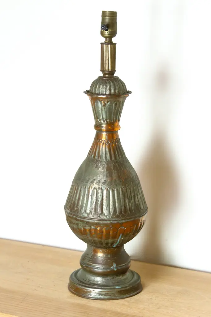 This captivating table lamp, crafted from an antique copper vessel, embodies the allure of timeworn beauty and the enduring appeal of handcrafted metalwork. The lamp's base, with its gently curved silhouette and intricate details, is a testament to the artistry of a bygone era. The aged copper, boasting a unique silvered patina, tells a story of transformation and resilience. (Please note: Shade is for reference only and not included.)
