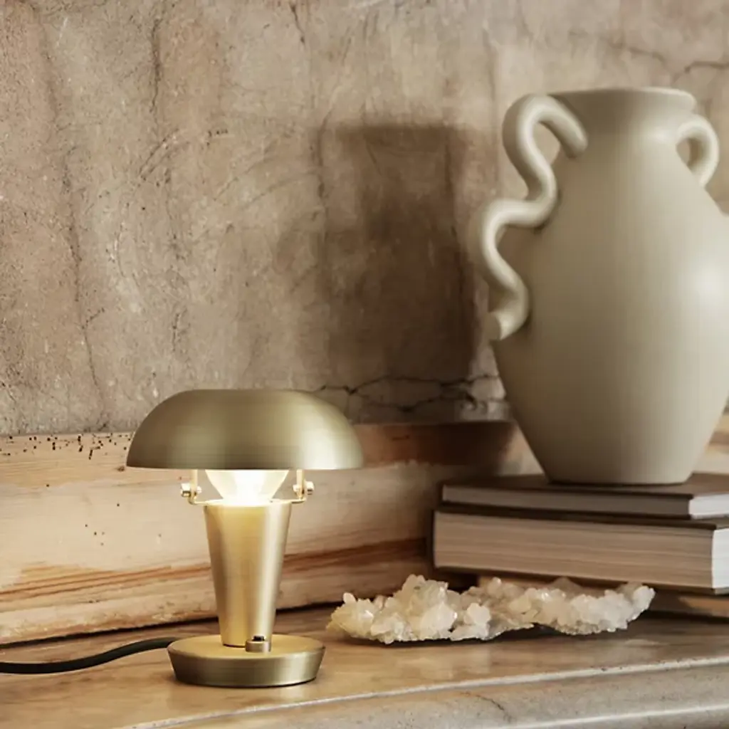 The Tiny Mini Table Lamp from ferm LIVING brings Art Deco flair to your living space. It has a shade that is tiltable, allowing the bright LED light to splay along your wall, expanding the glow. The shade beautifully crowns a tapered encasement for an uncluttered presentation. It’s composed of iron for durability, and a disc-shaped baseplate keeps it stable. An on/off base switch offers convenience to this versatile piece.