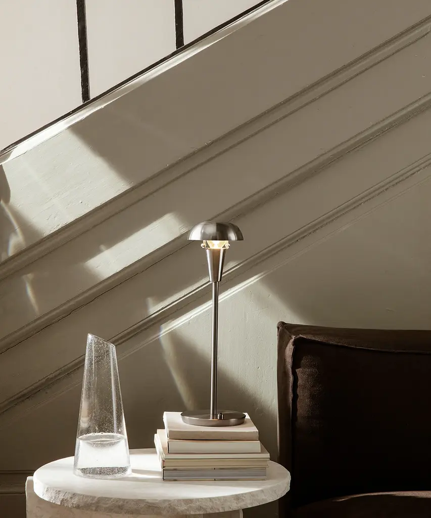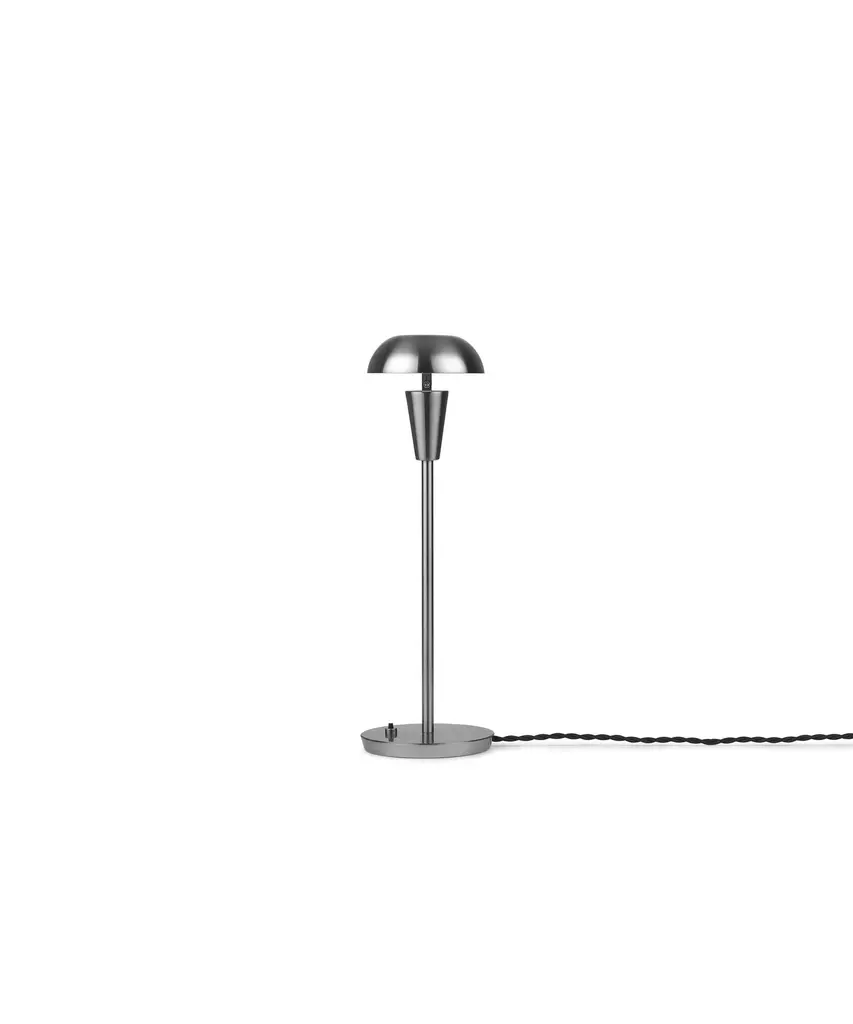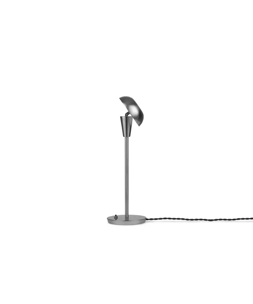 The Tiny Table Lamp works as a functional and decorative light source in any room. Due to its petite, slim size, it can effortlessly be placed on your windowsill or work desk for extra light. Inspired by industrial Art Deco, it exudes simplicity in both expression and its metal construction. The useful tipping head makes it possible for you to tilt the shade to create a different look for the lamp, as well as to fit the atmosphere of the room. Playing on proportions, the tiny shade in combination with the slim base gives the Tiny Table Lamp its charismatic design trait and personality. Designed and produced by the Copenhagen-based studio Ferm Living.