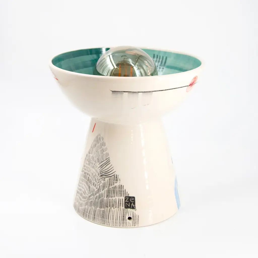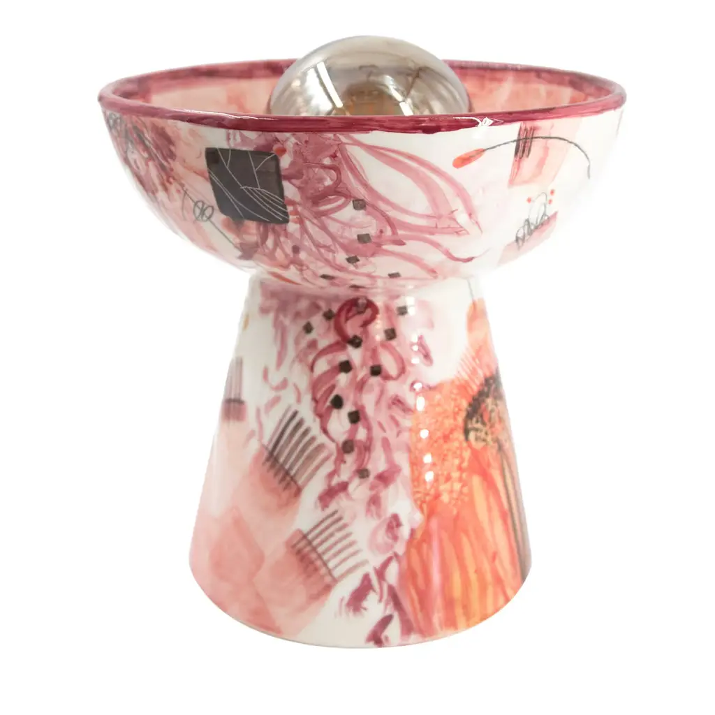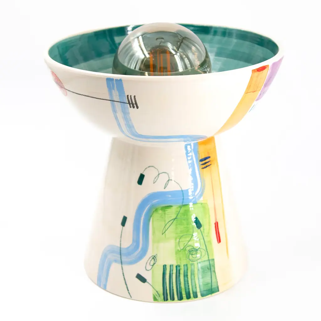 Bubbly patterns traced with minute and secure brushstrokes combining vibrant colors lend this one-off ceramic table lamp its fresh artistic impact. Geometric volumes outline its bold and luminous ceramic body, enlivened by the handpainted decoration. Resulting from a fully artisan crafting process, each table lamp is an unrepeatable objet d'art. Please contact the Concierge for technical specs.