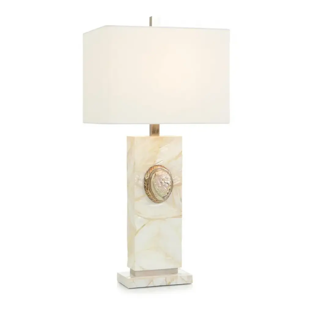 Triple disk of natural tuscan marble is framed in round aged brass finished metal. The Titan lamp is able to float with a dramatic front and back layered round plates mounted on a center steel pole. Aged brass finish is accented with natural Tuscan marble. Aged brass metal ball finial.