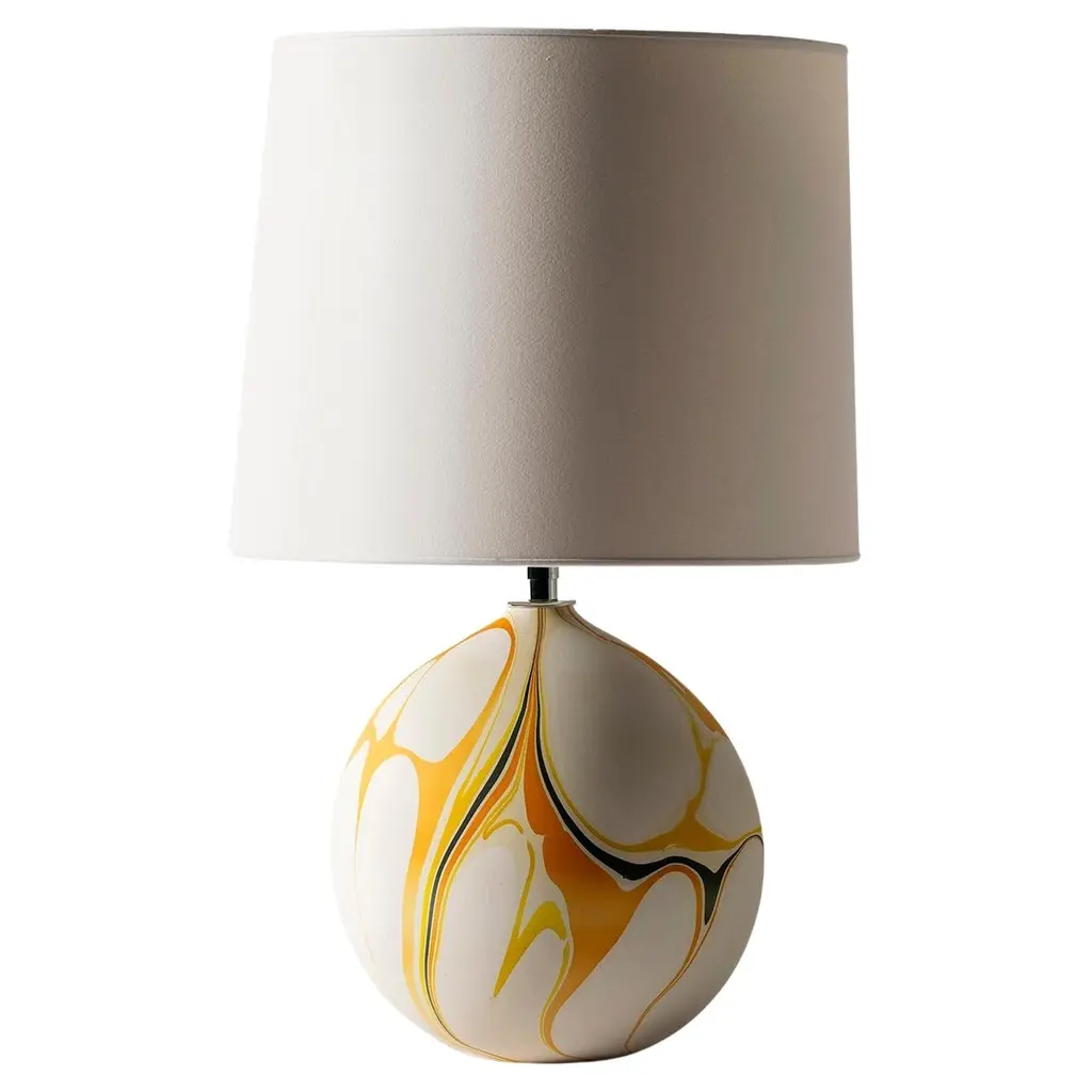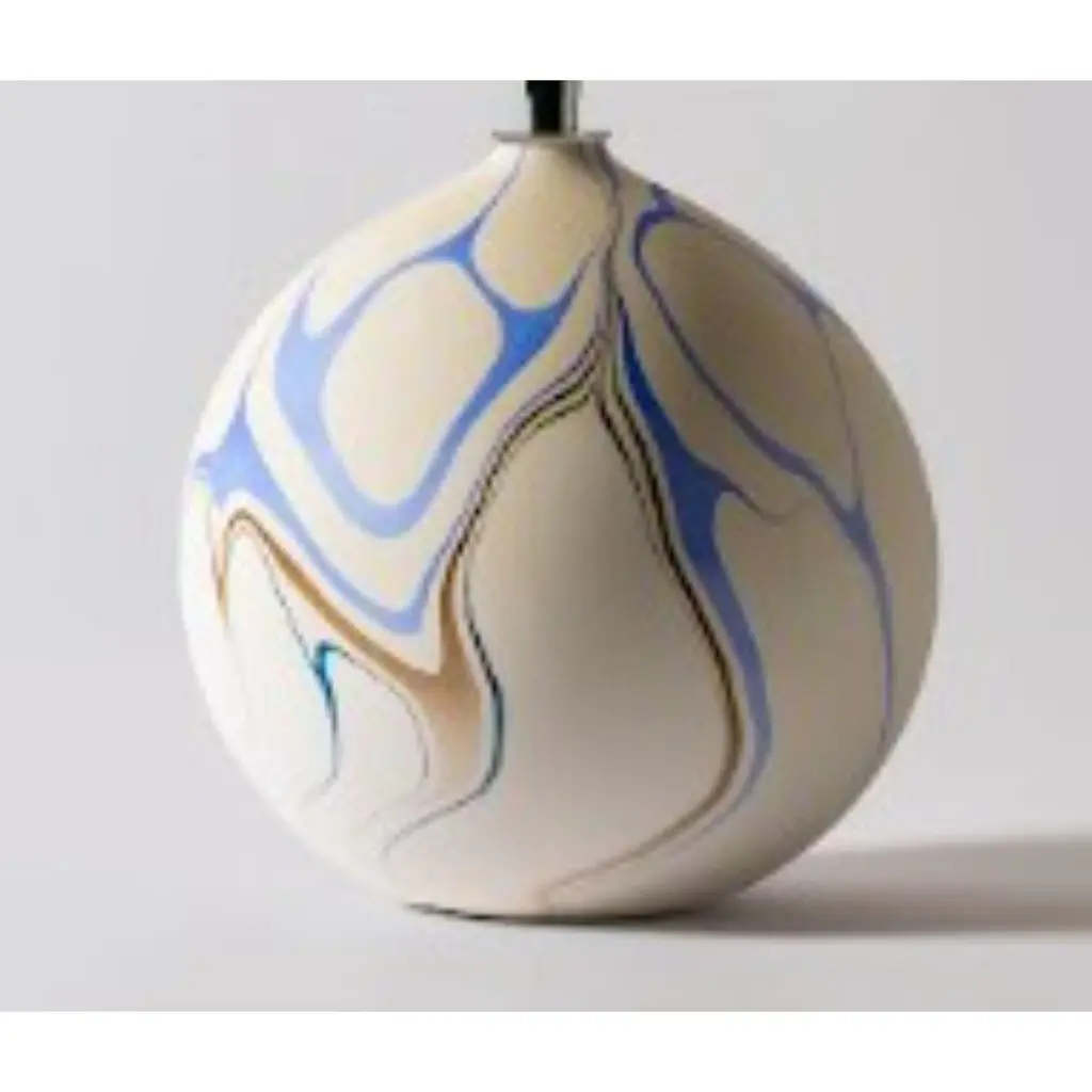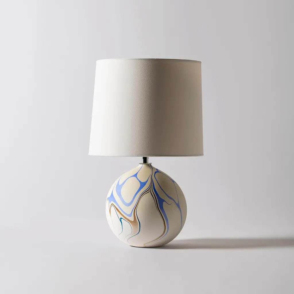 Titan lamp by Elyse GrahamDimensions: D31 x H49 cmMaterials: Plaster, Resin, Cotton rag Paper, brass, Nickel. HARDWARE: POLISHED NICKEL-PLATED BRASS UNO THREADED SOCKETwith TURN KEY SWITCH, IN-LINE DIMMER.MOLDED, DYED, AND FINISHED BY HAND IN LA. CUSTOMIZATIONAVAILABLE.ALL PIECES ARE MADE TO ORDER.All our lamps can be wired according to each country. If sold to the USA it will be wired for the USA for instance.Our Hydro Collection is inspired by the grooves and patterns that waterways make through the landscape as seen from above. The layers of gradation in the pigment on the exterior of the bases reference topographical maps. We take queues for our palette from the rivers for which the pieces are named. Much like the rivers that inspire them, the pattern on each piece is unique. Each lamp base is hand-cast with hydrocal plaster inside of a unique balloon shape. The interior of each piece is poured with layers of resin, impregnating the plaster with added strength and hardness.We have developed a unique process for pigmenting the exterior of the bases that is based on the technique used for marbling paper. Each lamp base is sealed with a UV resistant acrylic coating. Our shades are made by hand using a heavyweight cotton rag paper and attached to a nickel-plated swivel fixture with a turn switch. An in-line dimmer switch on the cord provides adjustable light settings. Due to the nature of the UV sensitive materials in our lamp bases we recommend using LED lightbulbs exclusively.MEET OUR TEAMElyse Graham is the founder and creative director of the studio. Driven by Elyse’s unique vision of building a studio that fosters and emphasizes connection, play, and experimentation (of people, processes, and in turn the objects created and shared) our small team works closely and collaboratively on each project. Elyse received a BA in sculpture and semiotics at Brown University. After years of making sculpture and running a business in jewelry design, Elyse decided to merge her separate practices and redirect her attention toward collectible design in 2013. The creative trajectory of the studio is heavily influenced by Graham’s background in fine art, specifically her interest in process-driven and material-based artwork. The studio’s vocabulary of shapes, patterns, and forms comes from a lineage of unconventional processes Graham has developed and built for working with plaster and resin. Graham shares her studio as well as her home with her husband, Lewis Mauk and their daughter, Eero. Miller Robinson is head of our production department. From pigmenting and casting materials for all of our products in plaster and resin to graphic and production design, they wear many hats in our studio. Miller joined our team in 2014 and has been an integral part of designing many of our experimental processes that have lead to the creation of our unique MetaMATERIAL. Like Elyse, Miller has a background in material and process-oriented making, which led to an instant connection and collaborative understanding between the two. Miller received their BFA from Otis College of Art and Design with a focus on painting, installation, performance, and writing. Their individual art practice focuses on the preservation and potentialities of underrepresented histories and encompasses objects, garments, actions, tattooing, and books. Their personal work has been exhibited in Los Angeles at the Southwest Museum, Los Angeles Municipal Art Gallery, Heritage Square Museum, and with Los Angeles Contemporary Exhibitions (LACE), as well as HORESEANDPONY Fine Arts in Berlin.Lewis Mauk is our studio and operations engineer. Working on facilities and production design as well as engineering and leading all of our large-scale constructions and installations, Lewis’ unique set of technical skills gives form and structure to our studio’s unconventional ideas and processes. Lewis has been working behind-the-scenes since the creation of the studio but joined our team full-time in 2020. Consistent with the rest of our team, Lewis has a background in process-driven fine art and has extensive training in woodworking, printmaking, and photography. He received a MFA from CalArts and has worked across the fields of education and fabrication. Lewis’ combined interest in the creation of personal archives mixed with his commitment to sustainable life practices, has brought a focus and important emphasis on designing studio projects and processes that imagine ways to reduce and reuse studio material fragments.